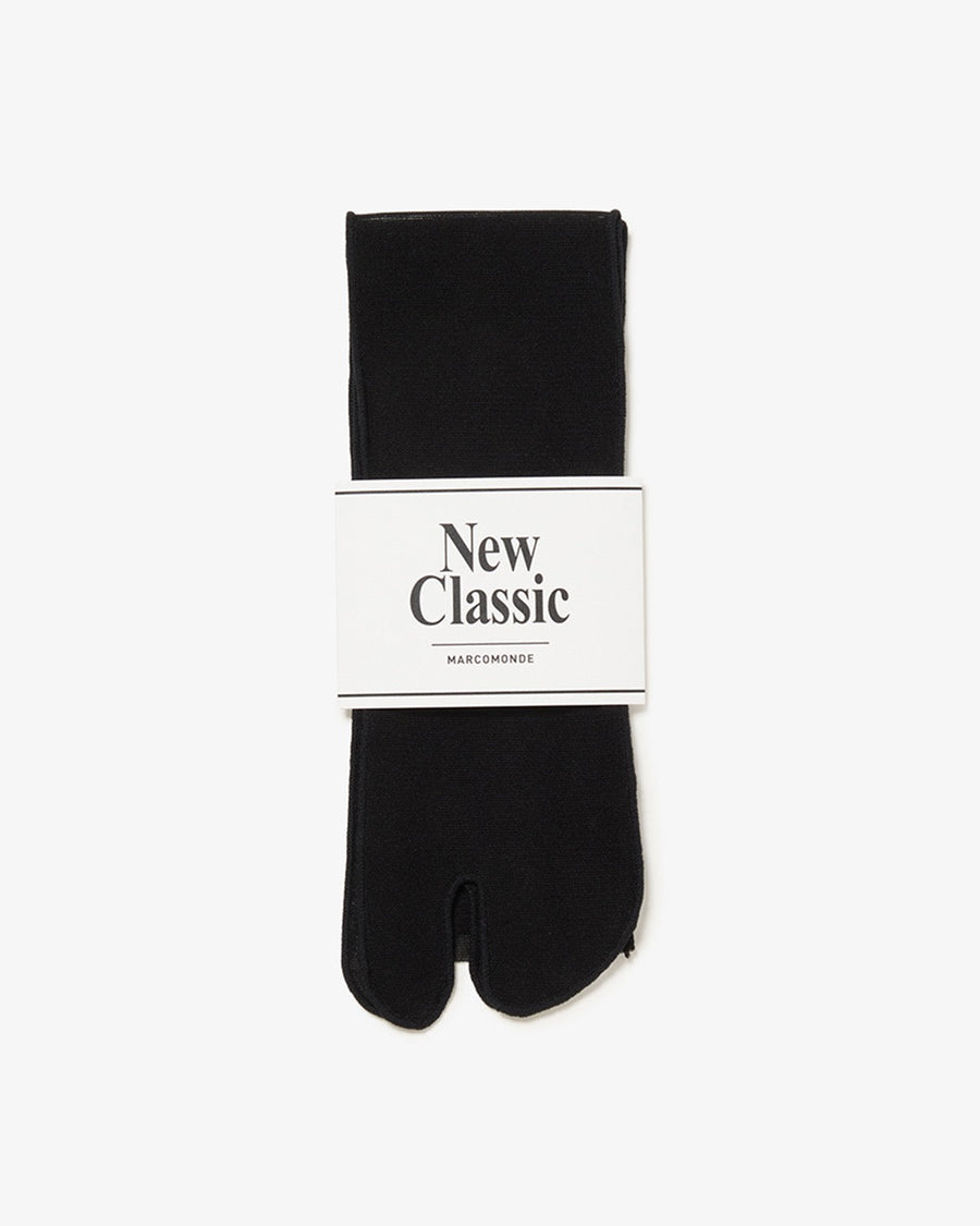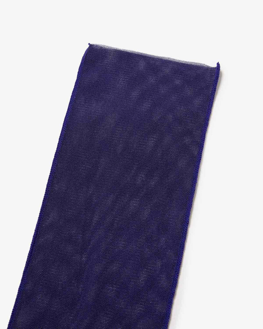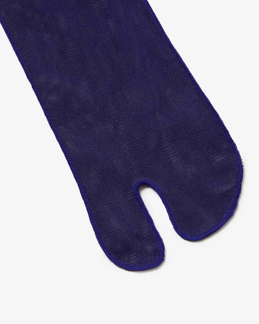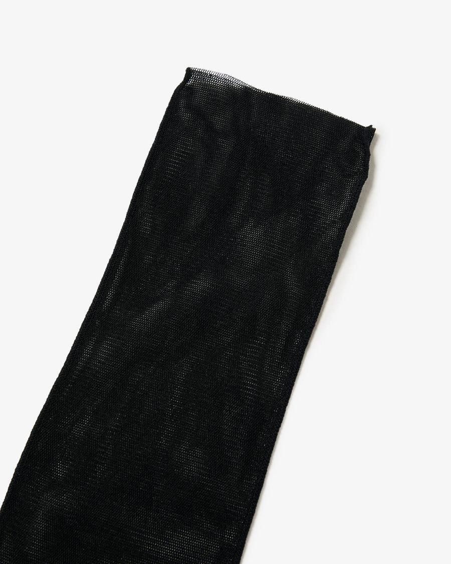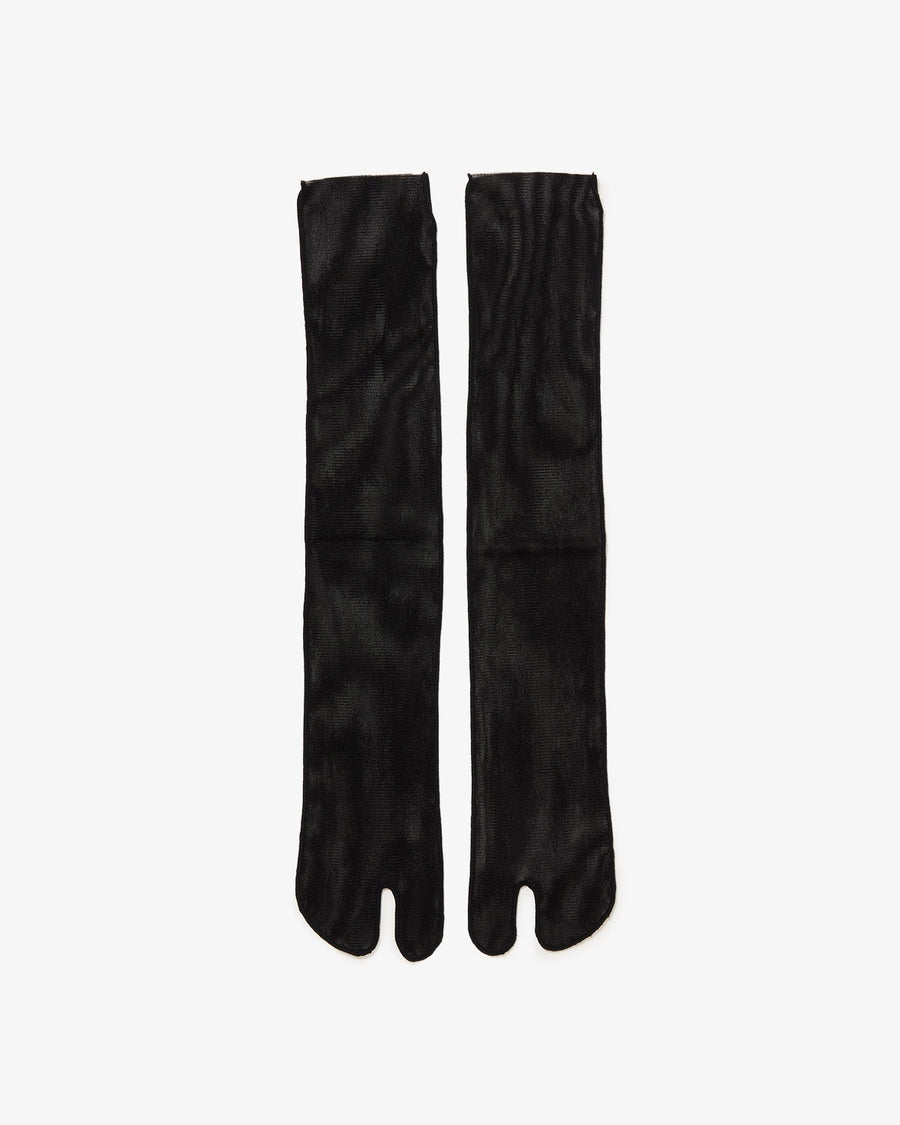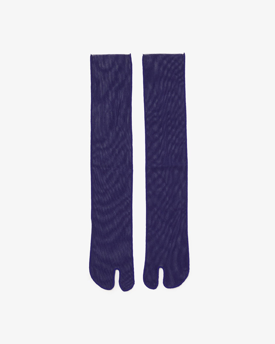 Tabi socks made from stretchy tulle material, offering a snug fit with wavy melow trim accents on the sides.