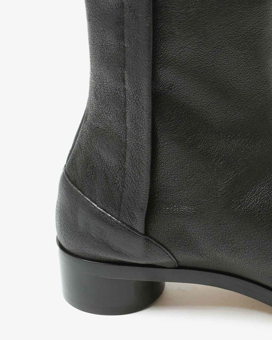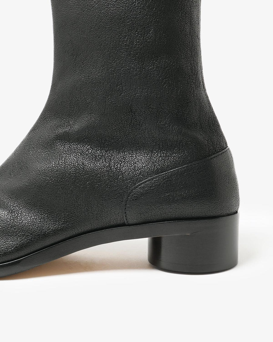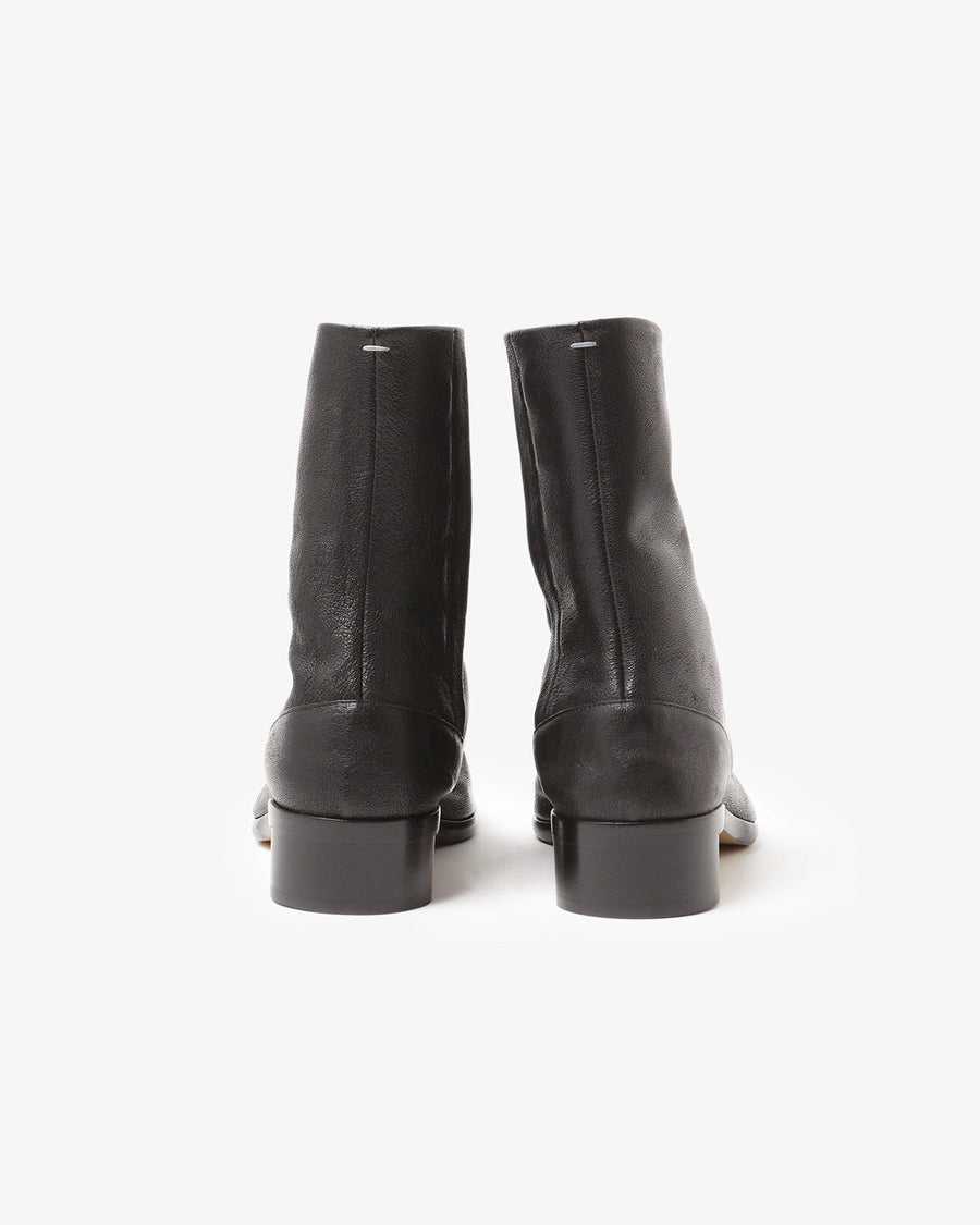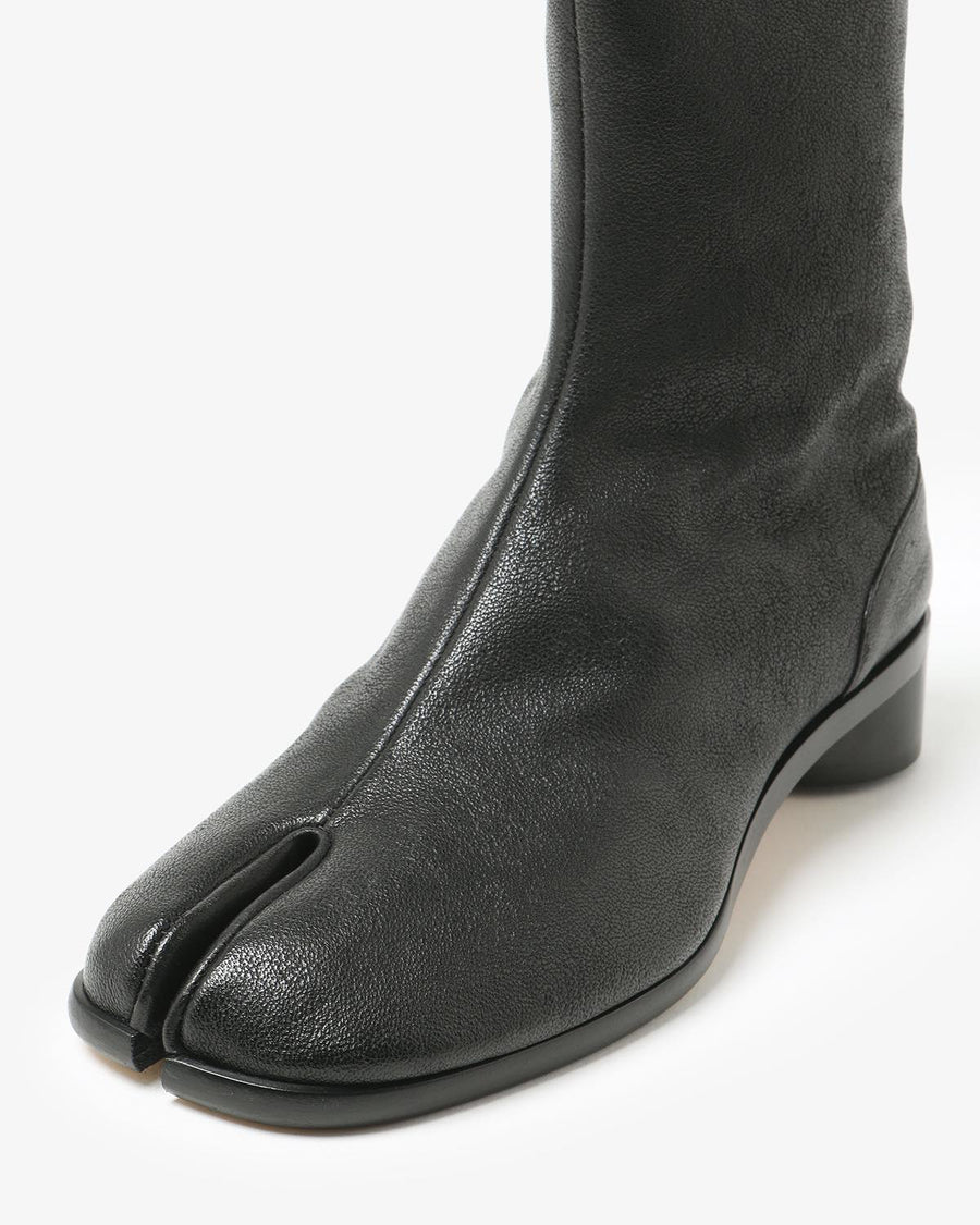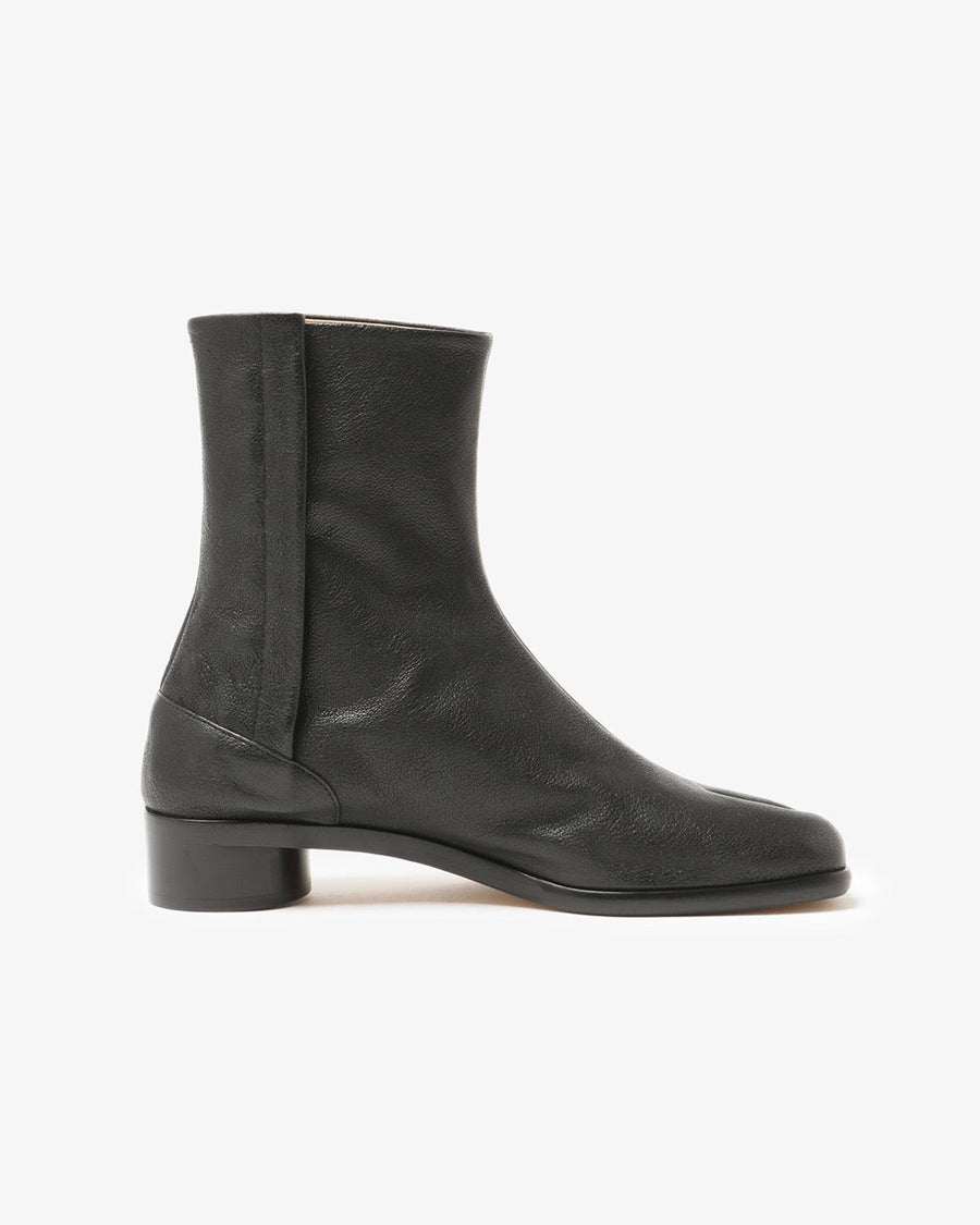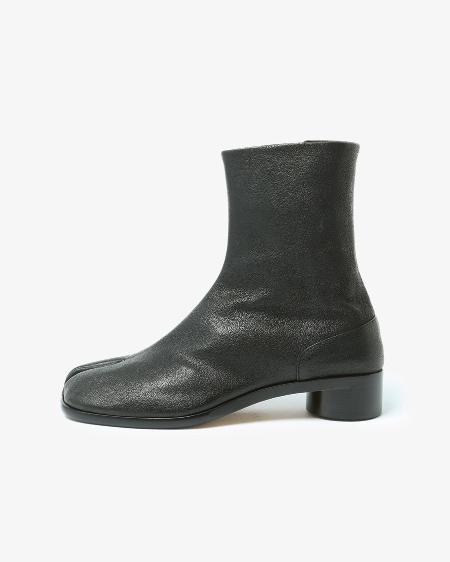 Maison Margiela's iconic tabi boots are crafted from suede with a unique hand-treated finish featuring a split-toe design and a cylindrical heel.