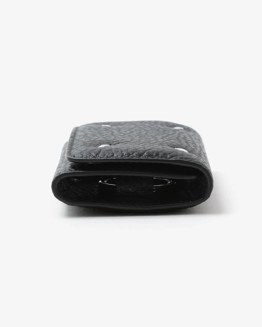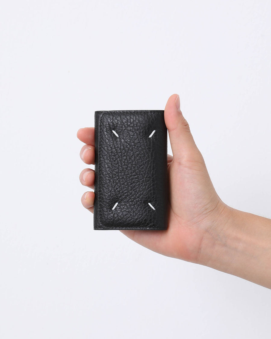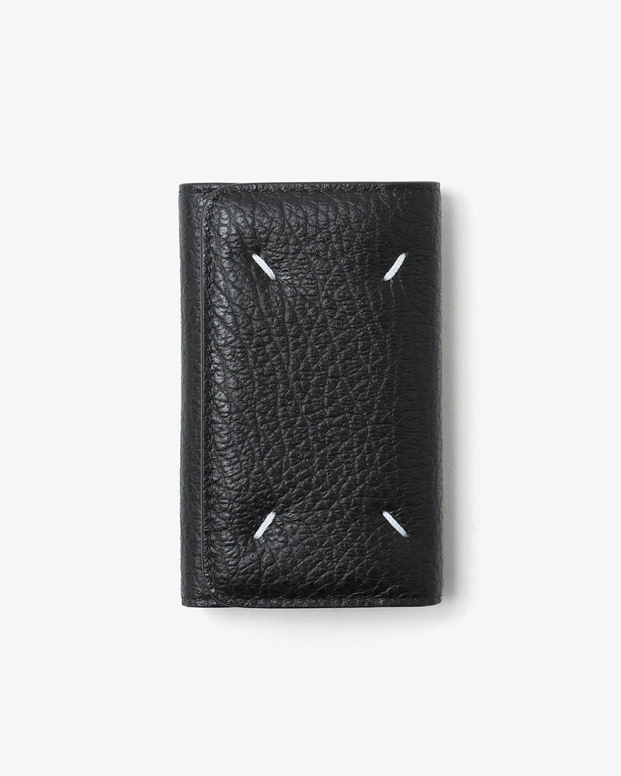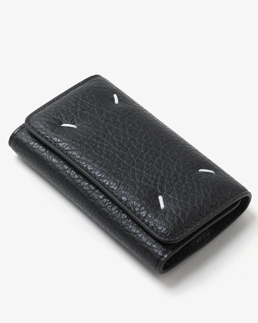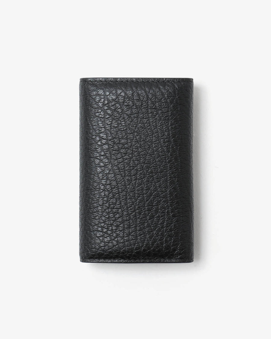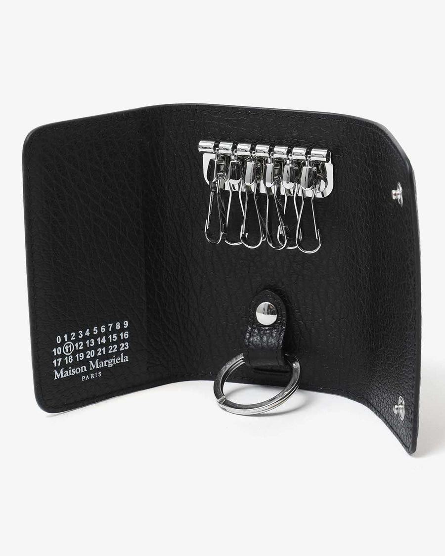 Key case in embossed grainy leather with a simple snap-button closure and six interior key hooks.