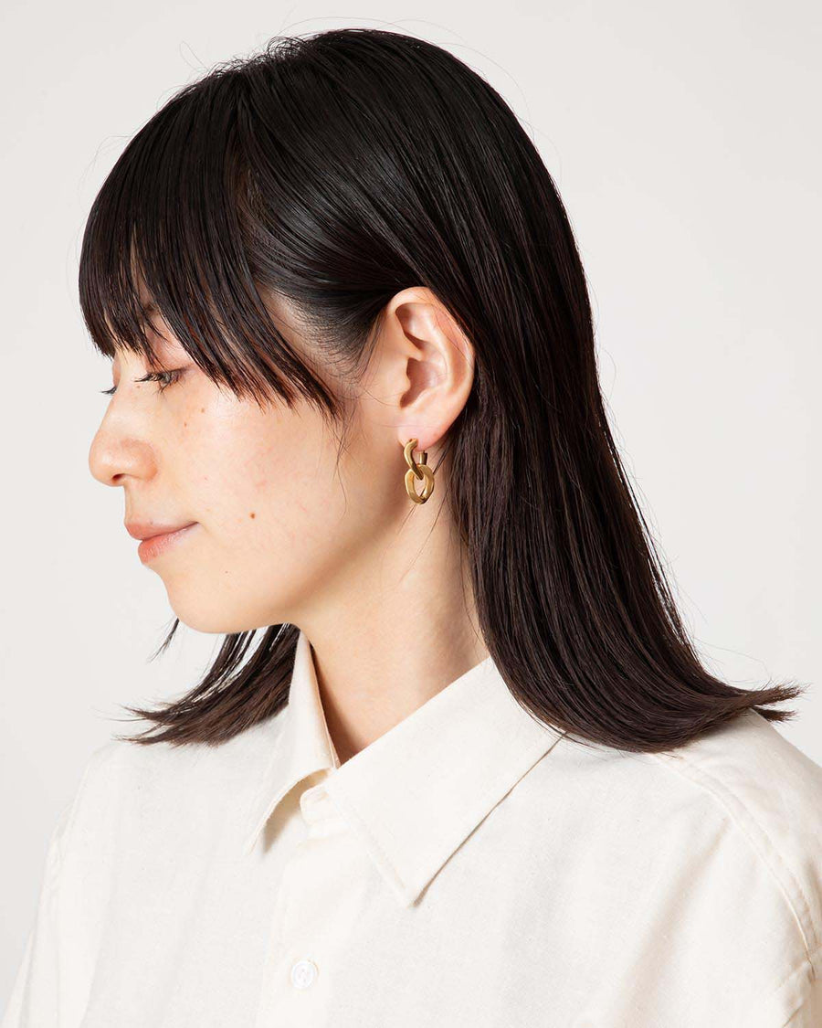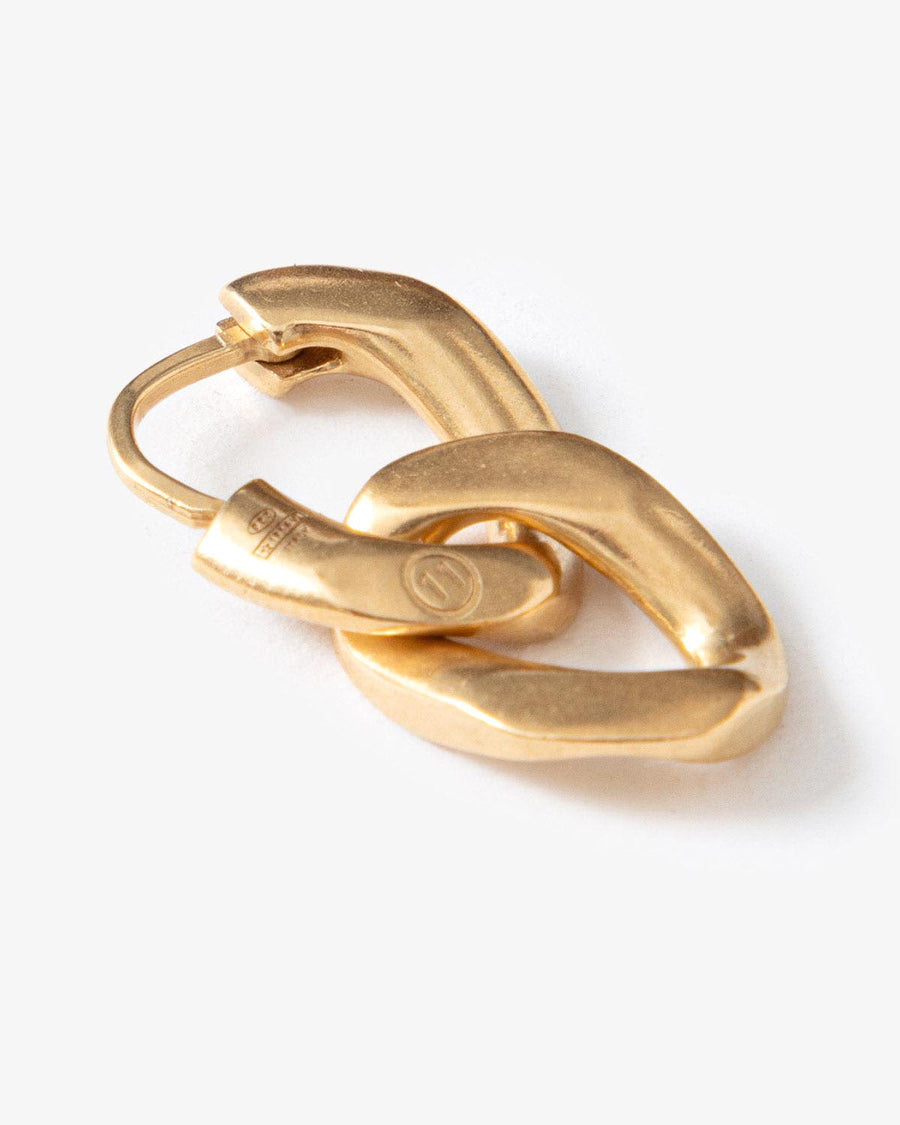 These earrings feature a distinctive design inspired by curb chains, with two connected hoops. They are made from 925 silver, and the gold version is coated with yellow gold plating.