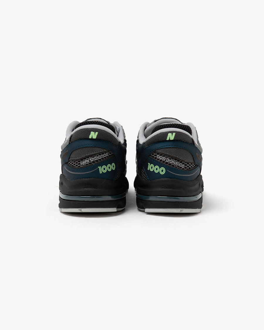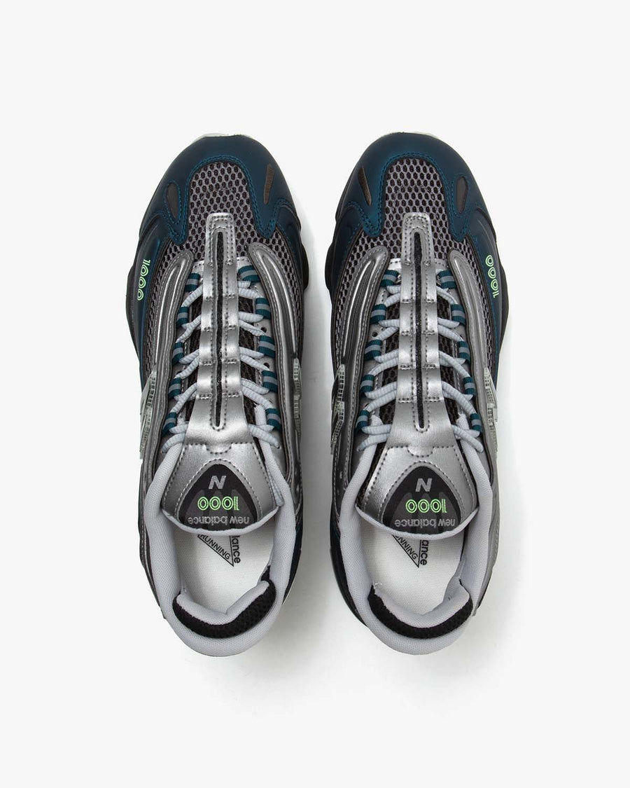 The M1000S revives the 1999 classic with metallic synthetic leather and embossed mesh, featuring a sleek SL-1 last silhouette.