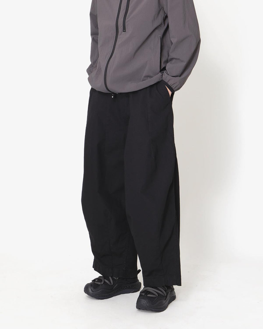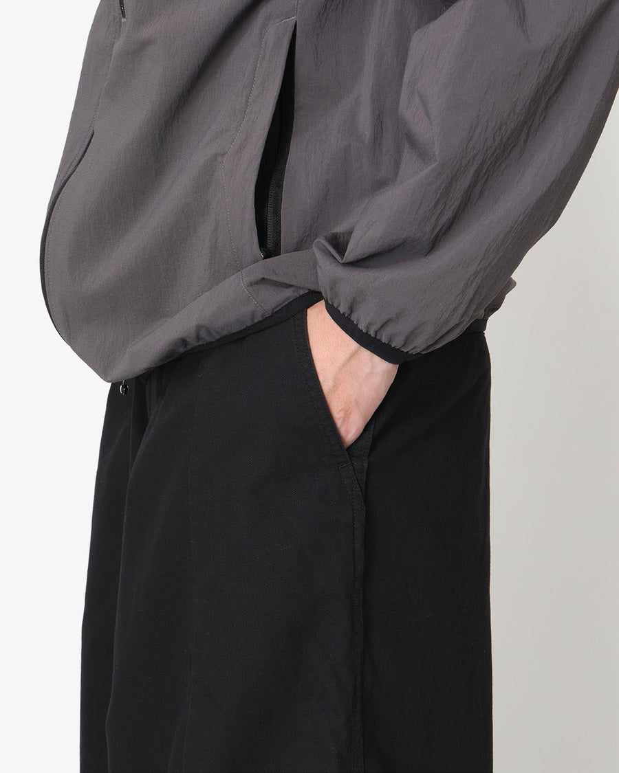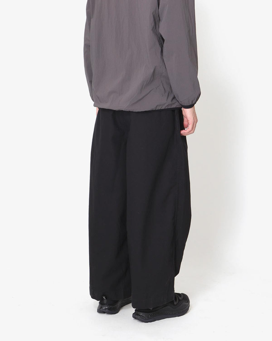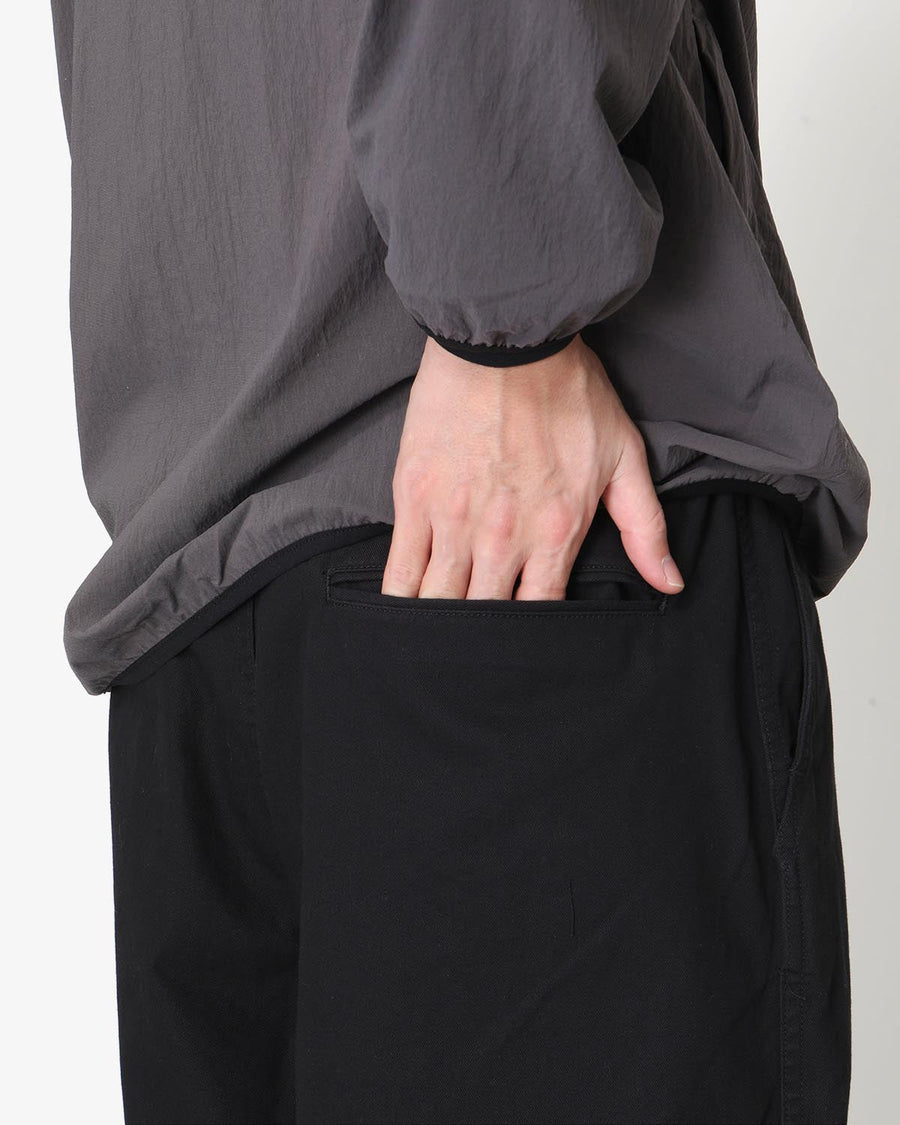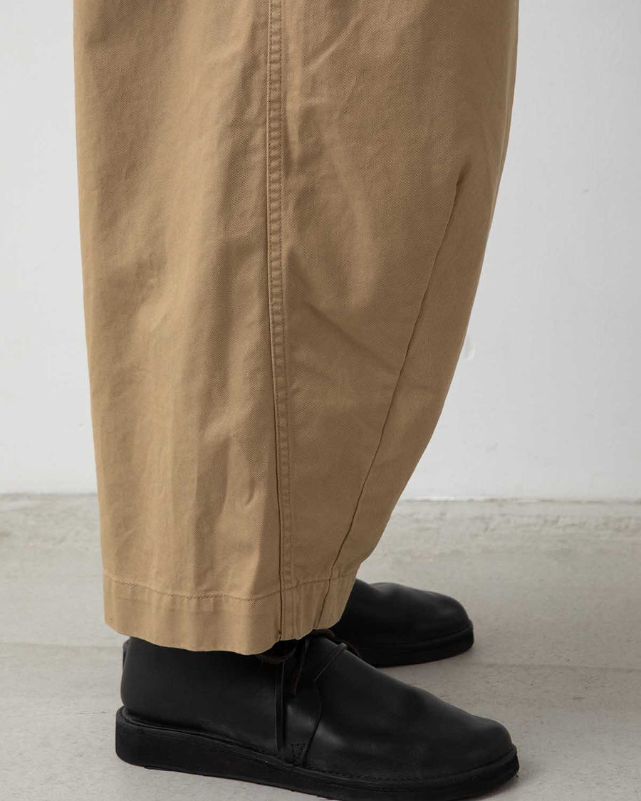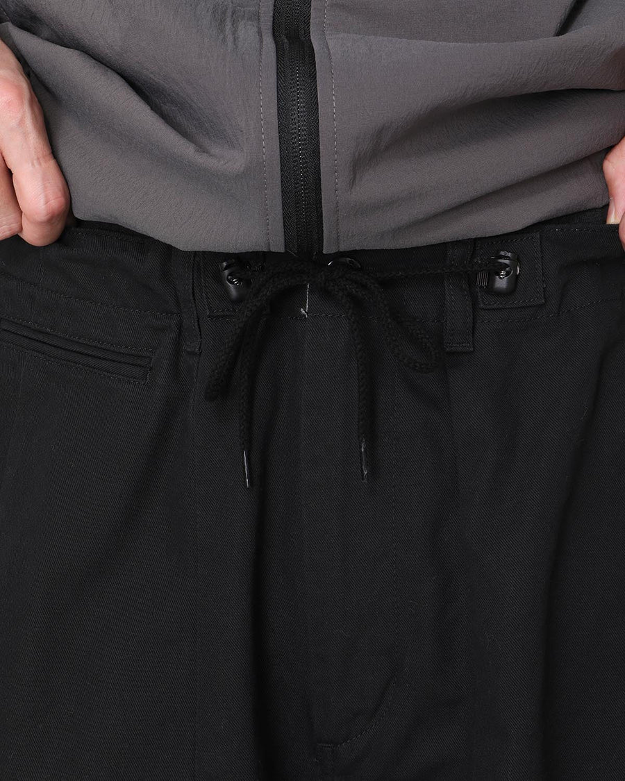 The pants feature a voluminous front pattern, lightweight high-density cotton twill, adjustable waist cord with stopper, and front, back, and coin pockets for a relaxed, all-season fit.