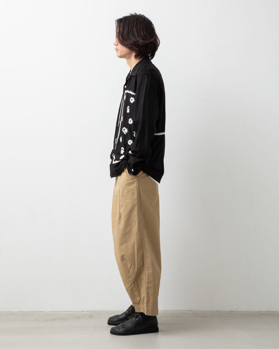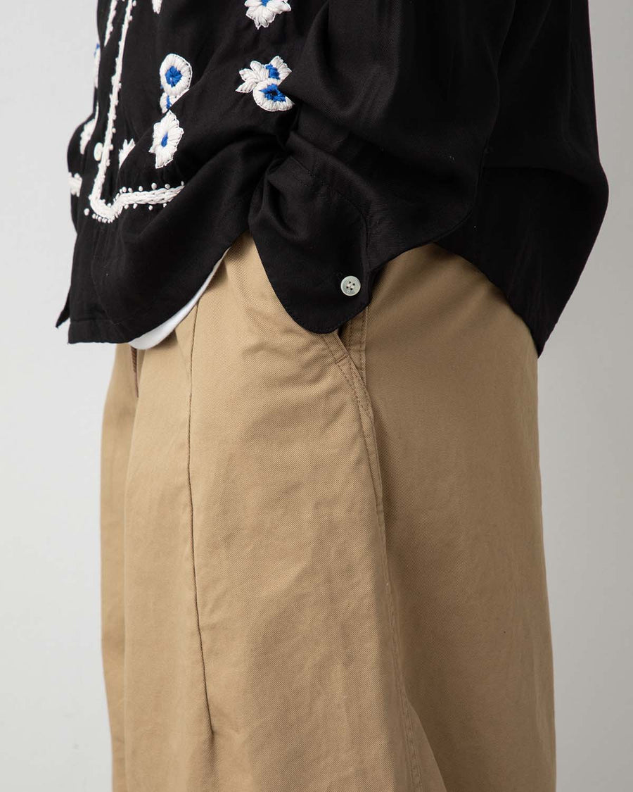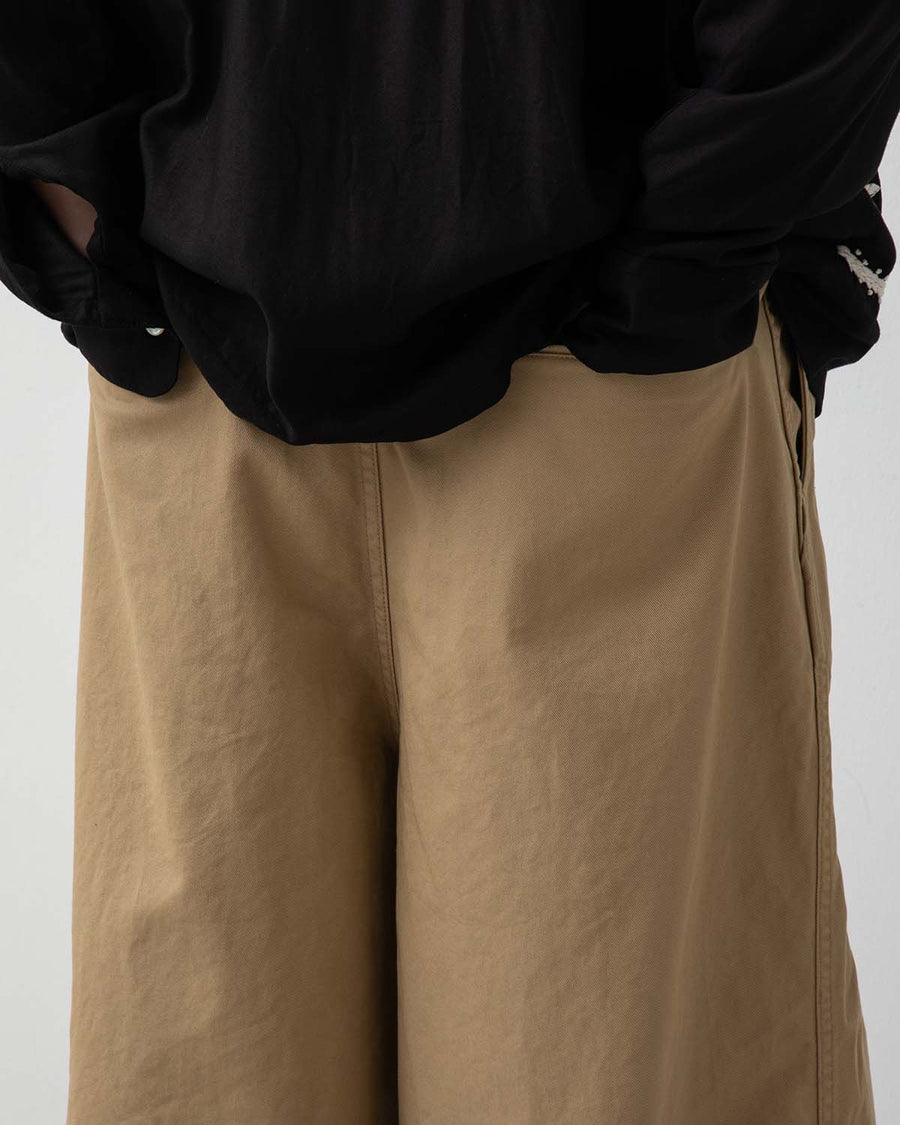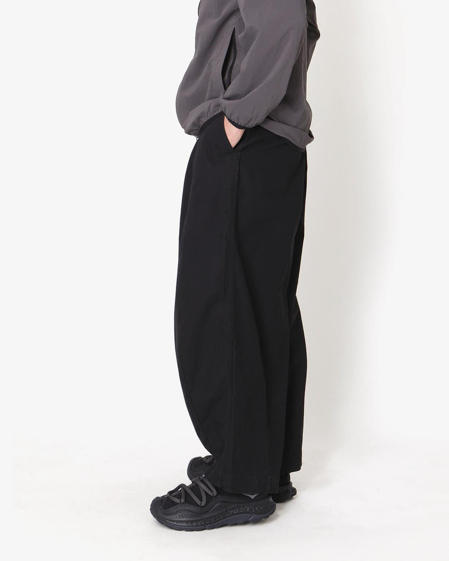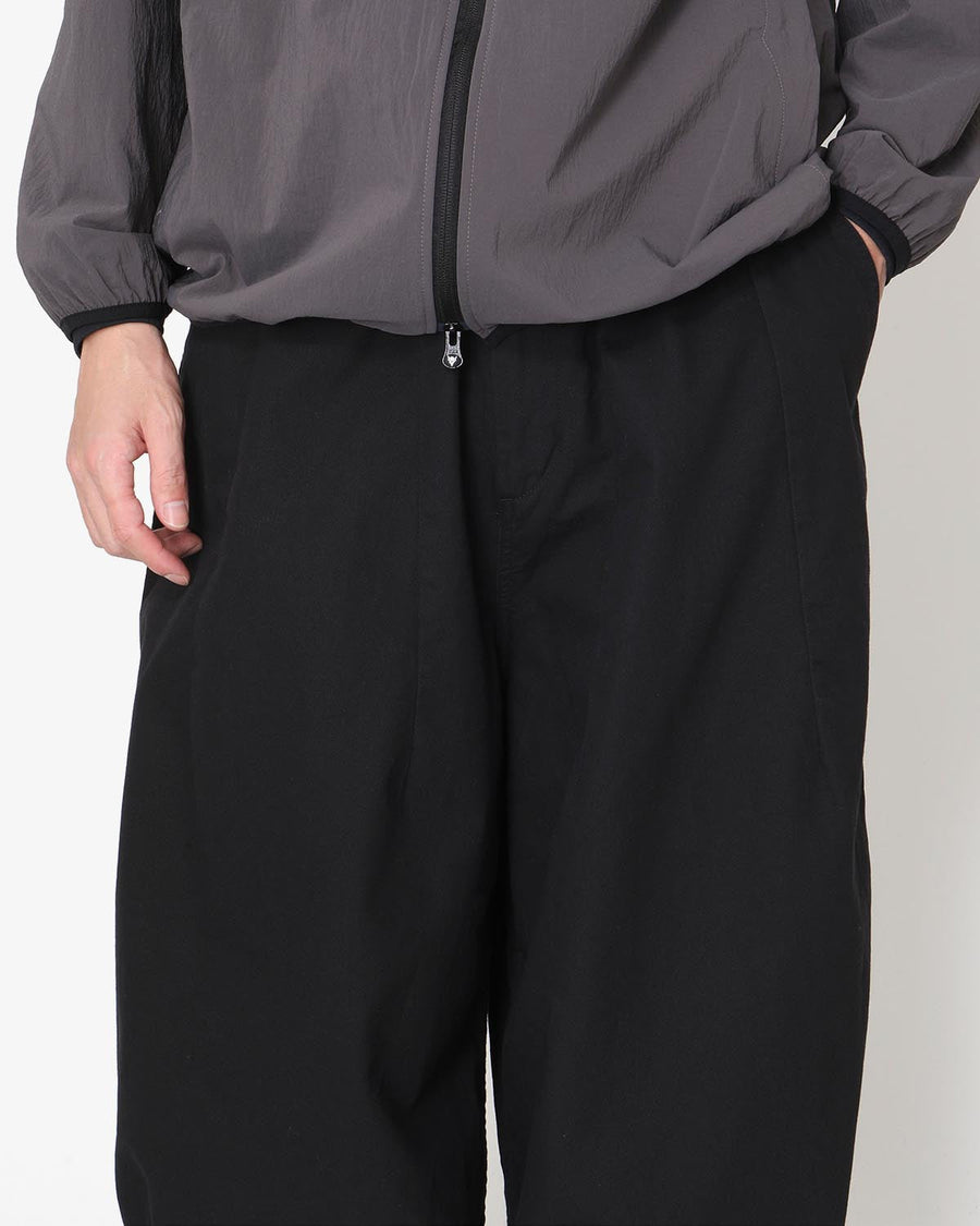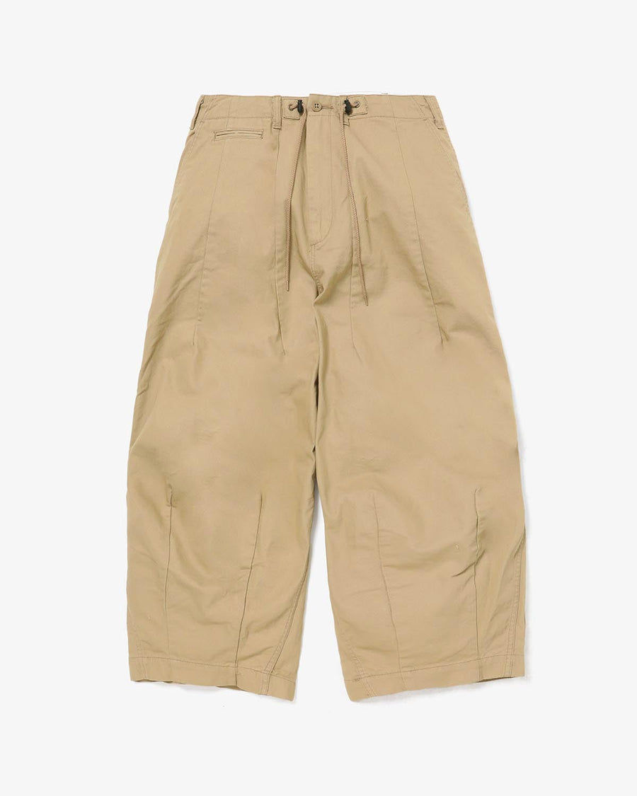 The pants feature a voluminous front pattern, lightweight high-density cotton twill, adjustable waist cord with stopper, and front, back, and coin pockets for a relaxed, all-season fit.
