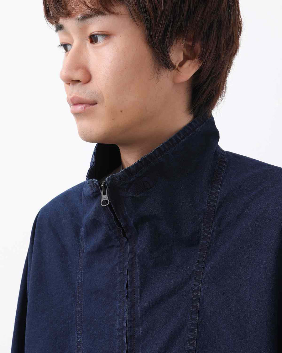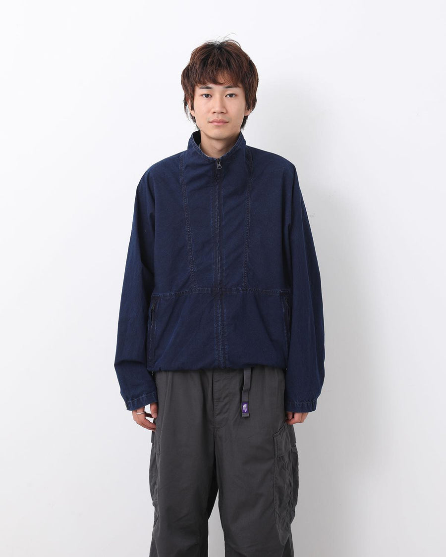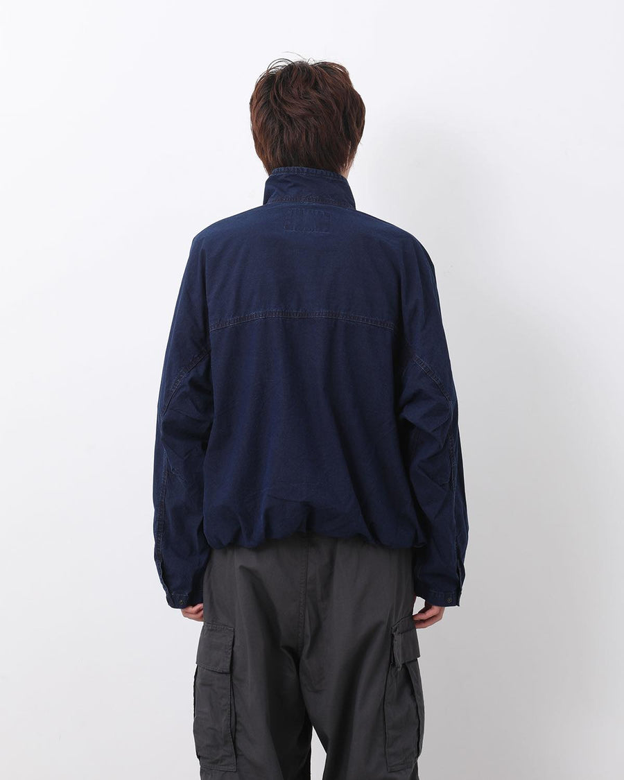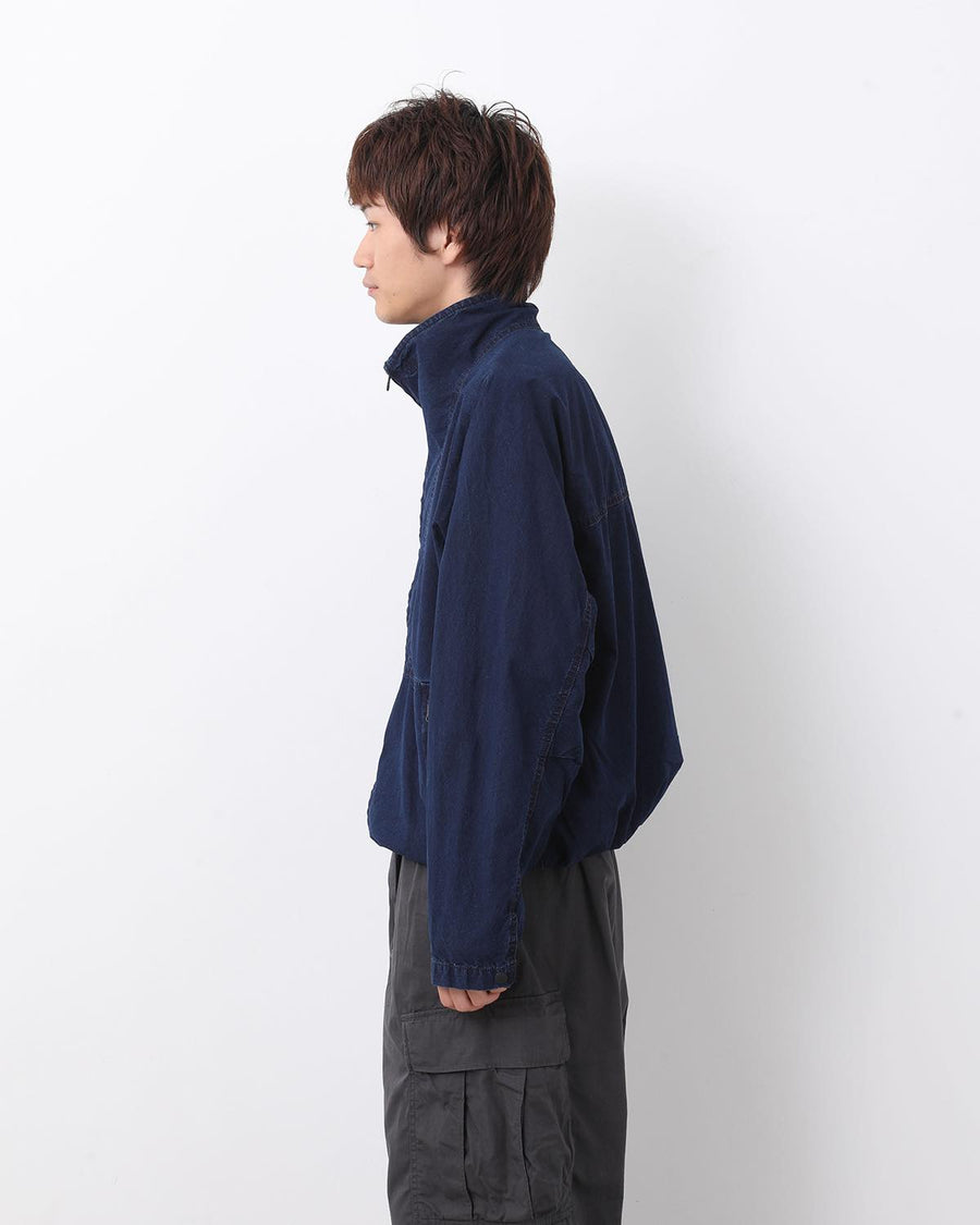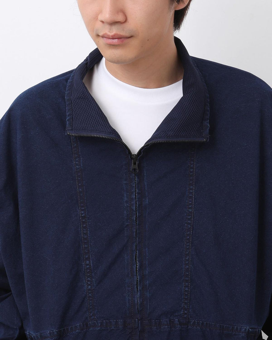 たて糸にネップ糸、よこ糸にリサイクルナイロンを織り上げたコットンナイロンインディゴウェザーのトラックジャケットです。