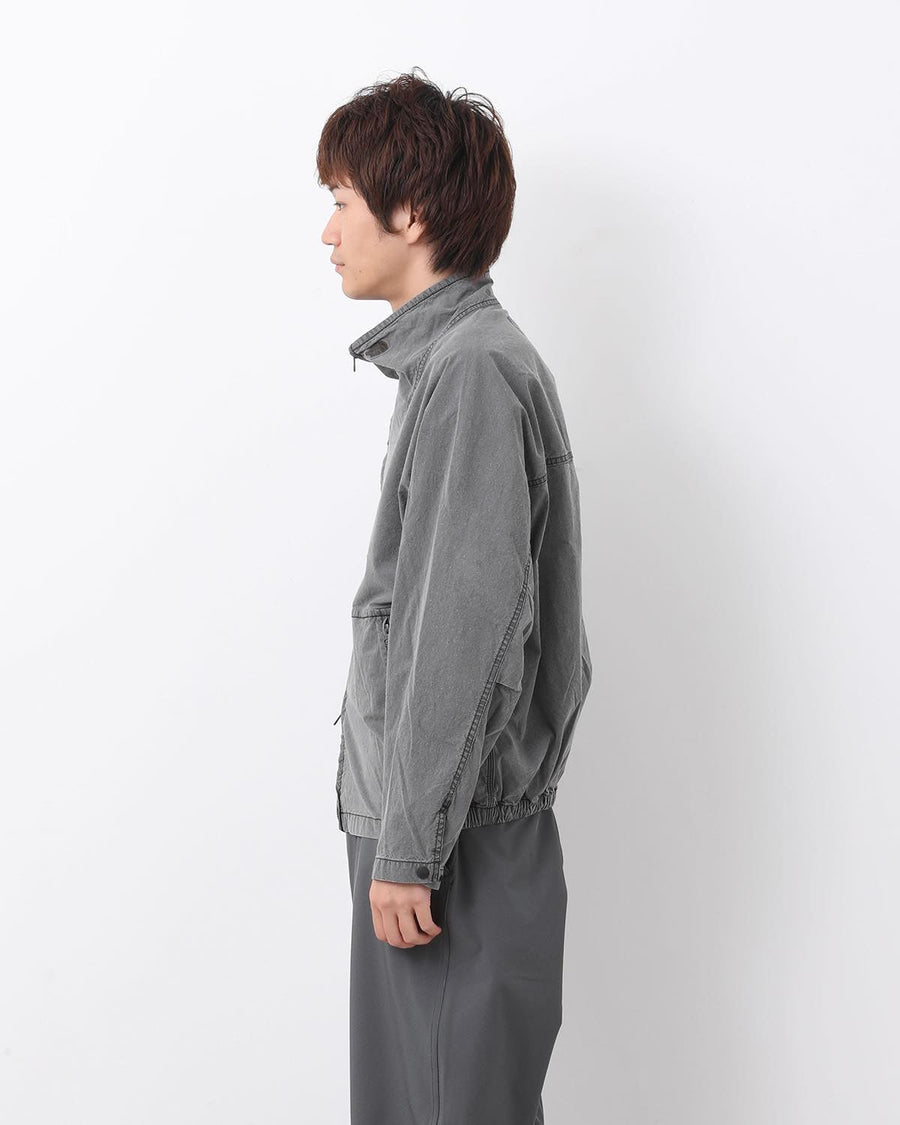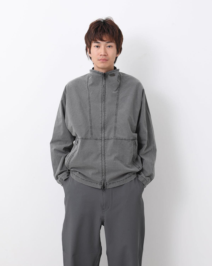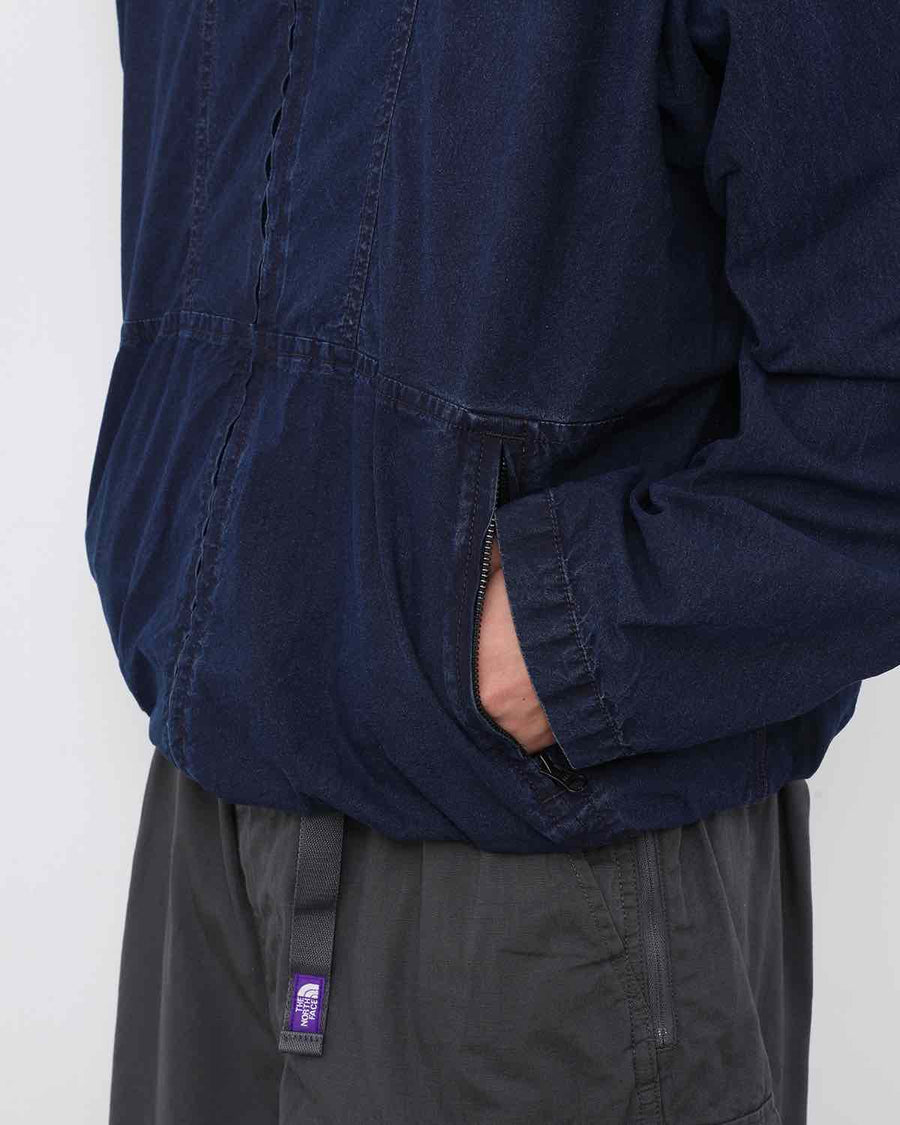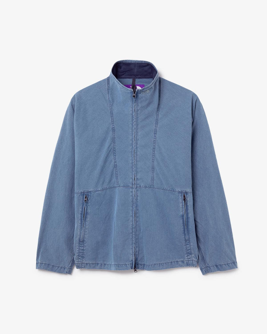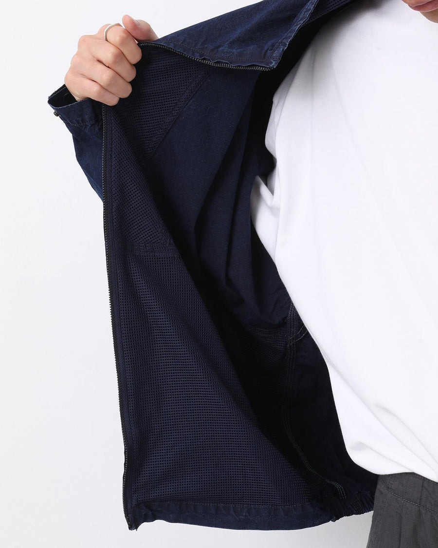 たて糸にネップ糸、よこ糸にリサイクルナイロンを織り上げたコットンナイロンインディゴウェザーのトラックジャケットです。