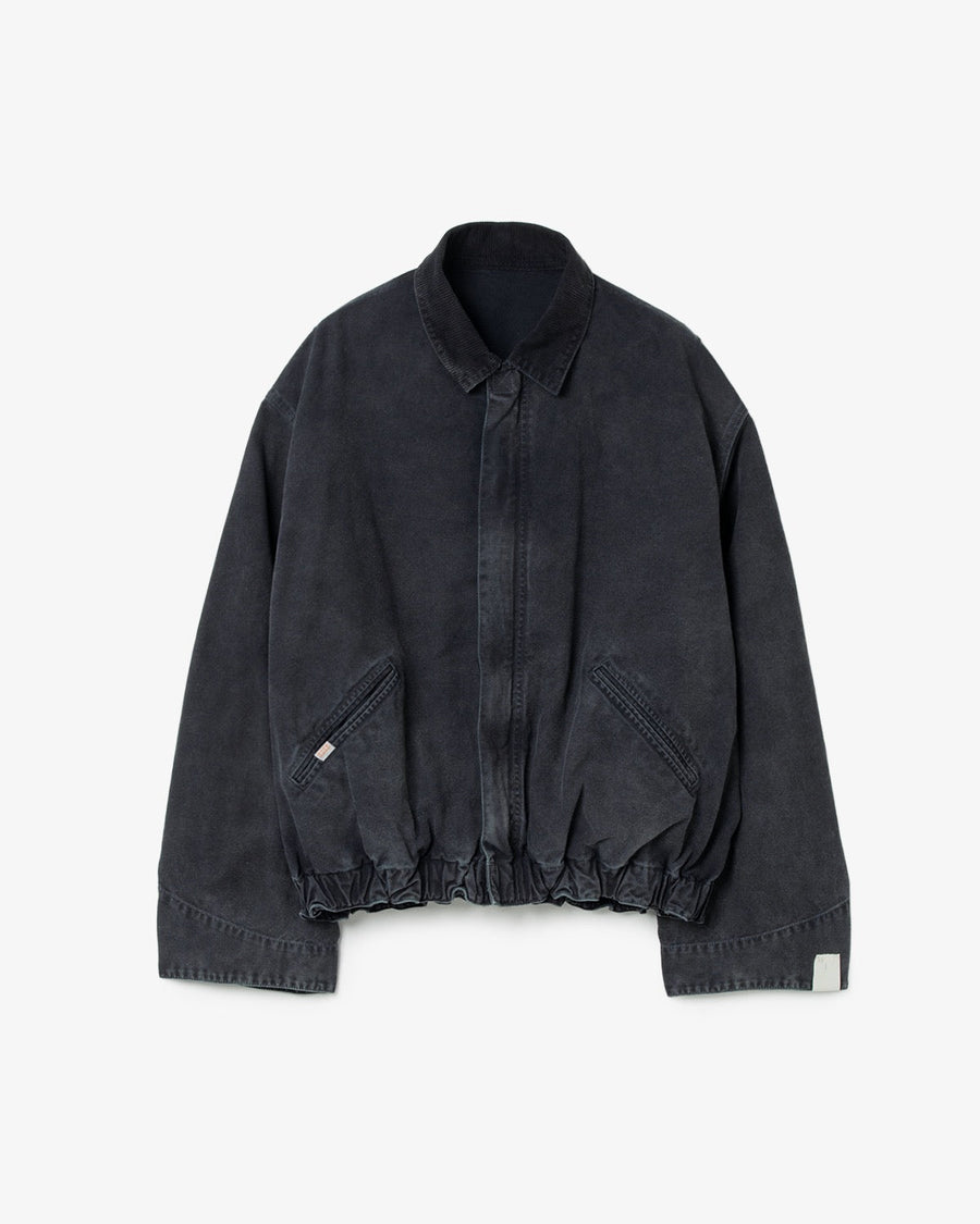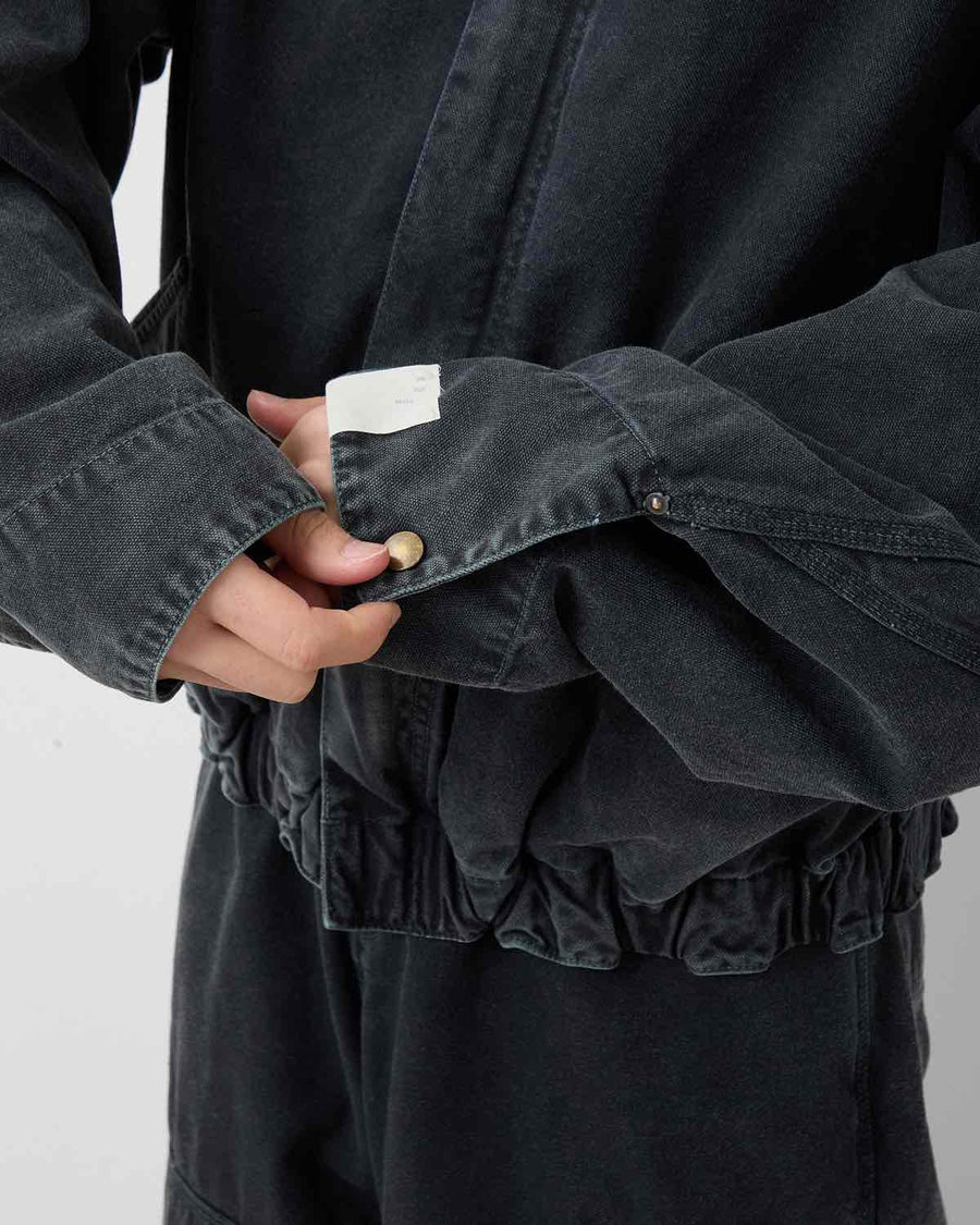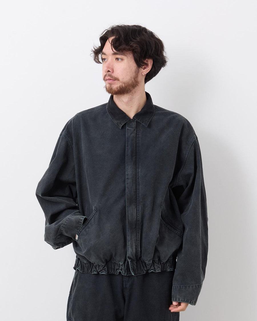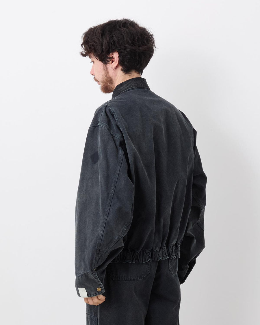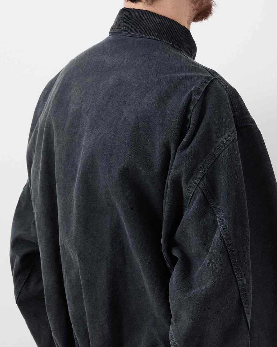 A rugged jacket in heavy oxford fabric with layered dyeing and mist bleach for a rich, faded look, reinterpreting classic workwear details.