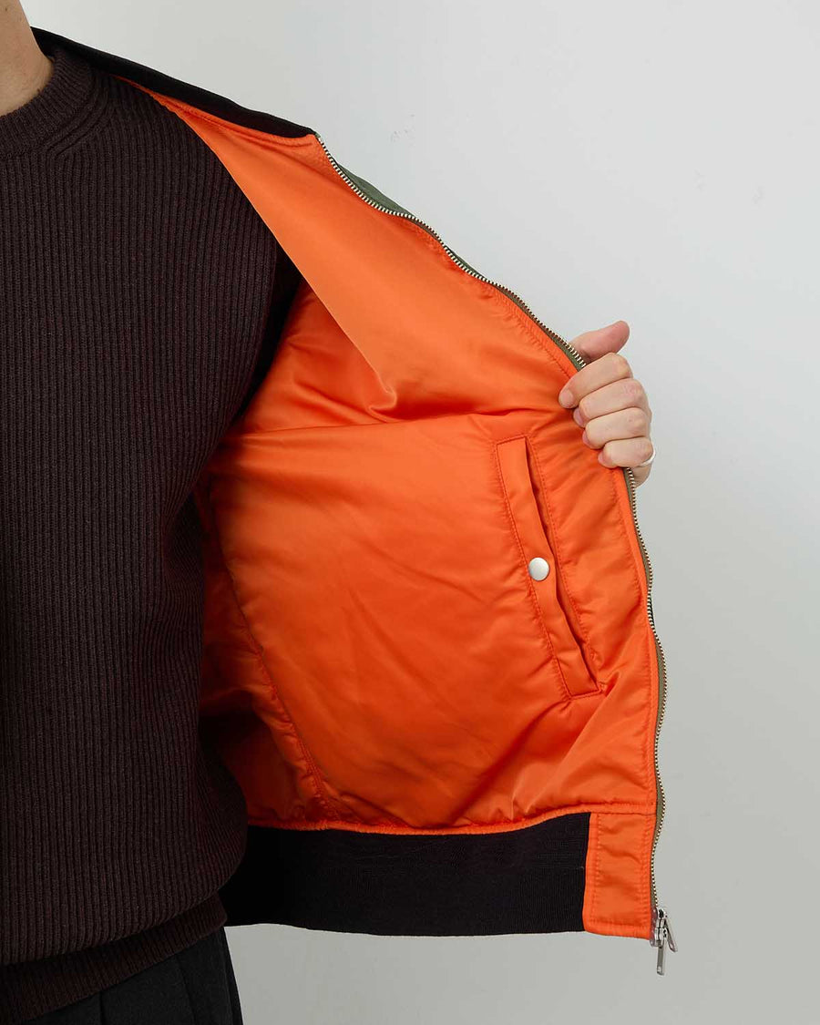 Minimalist flight jacket with hand-embroidered floral motifs, reflecting NÒMARHYTHM TEXTILE’s refined craftsmanship.