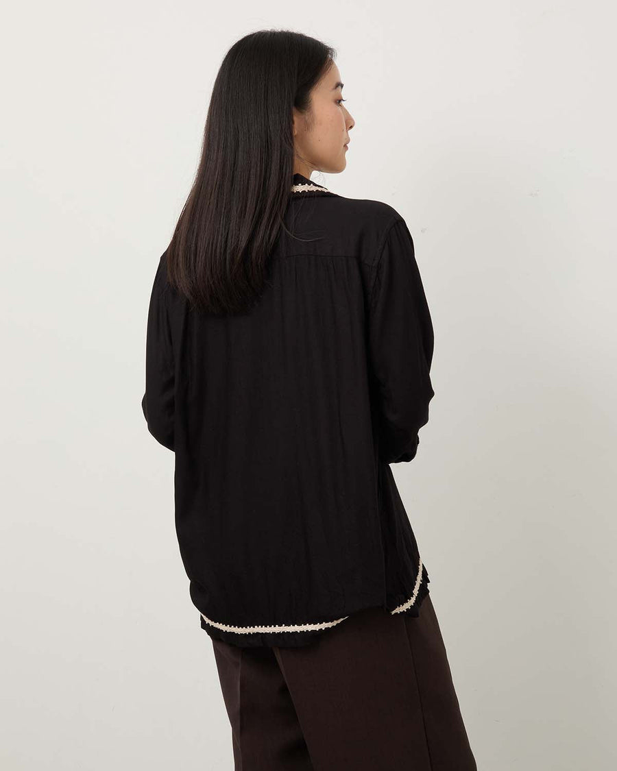 Open-collar shirt crafted from 100% rayon, detailed with hand embroidery on the collar, pockets, hem, and cuffs. Features a boxy silhouette, wearable on its own or layered to show the collar.