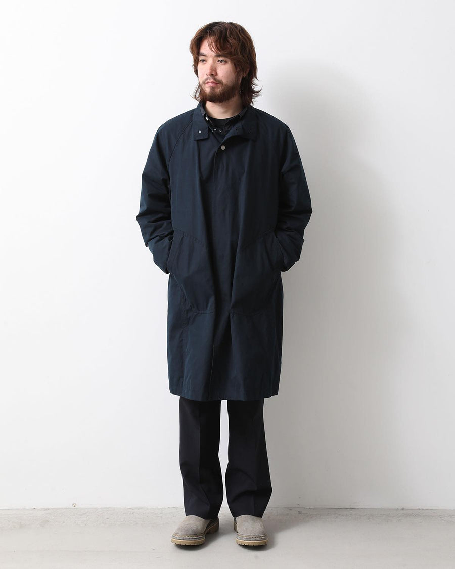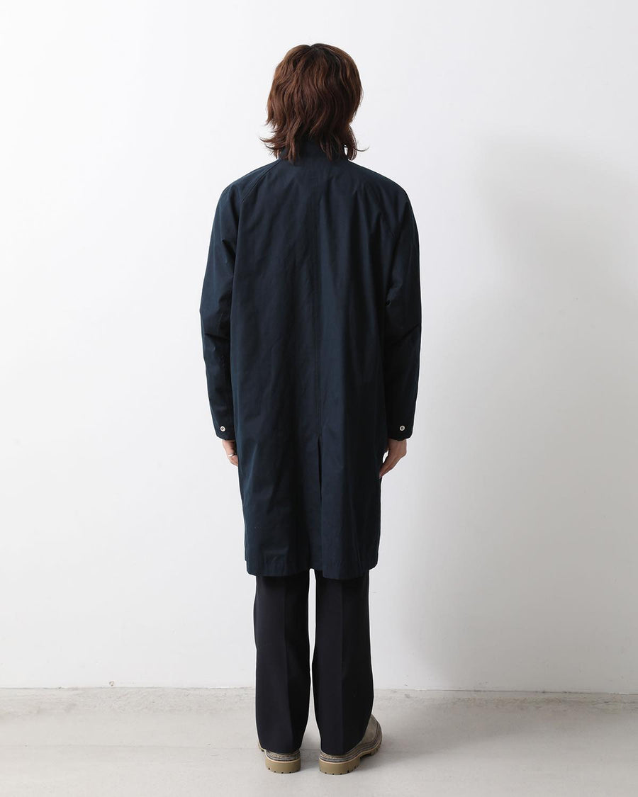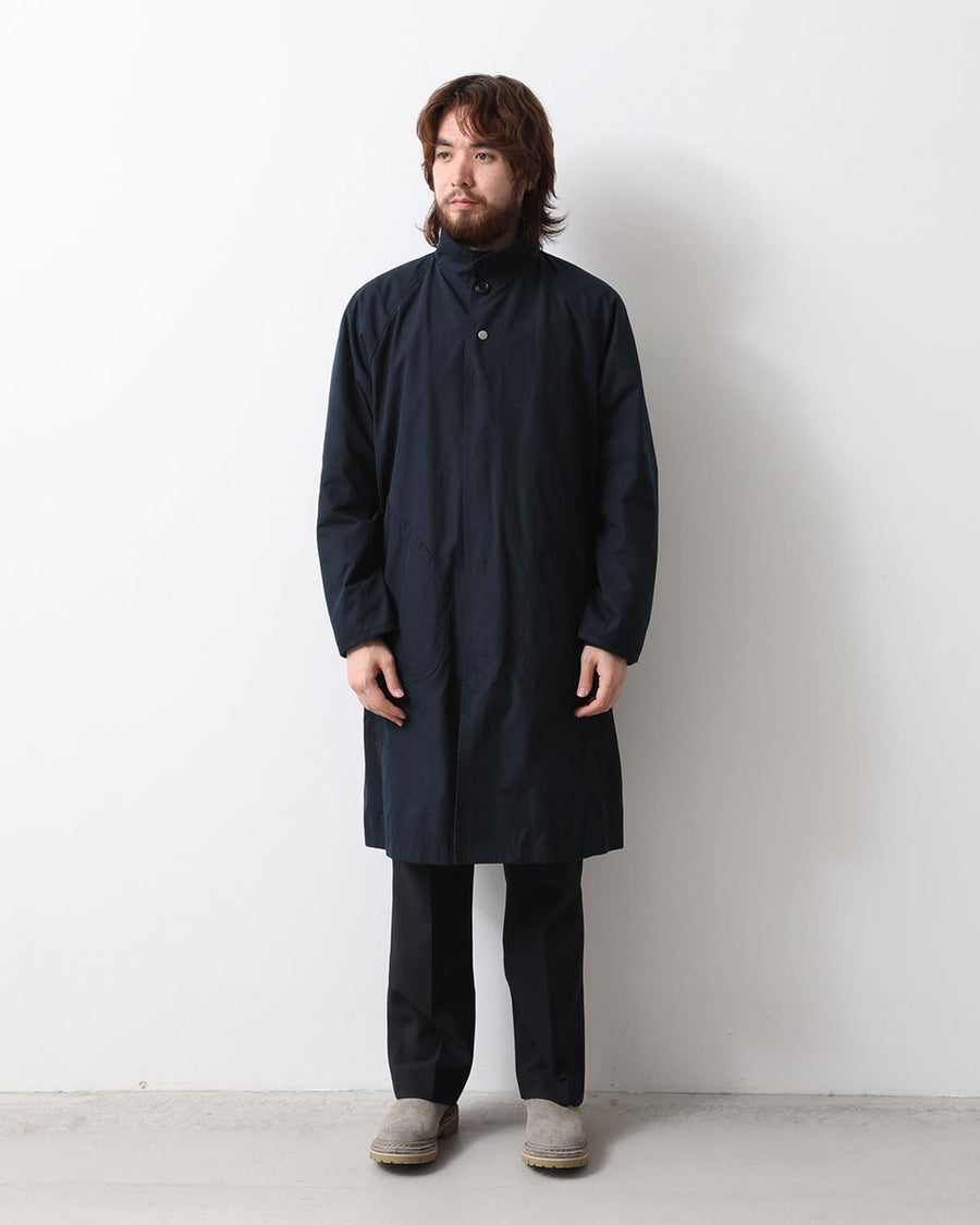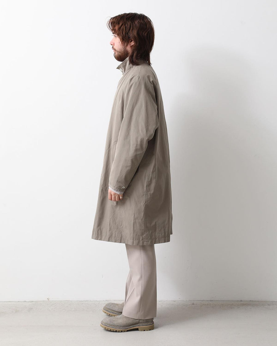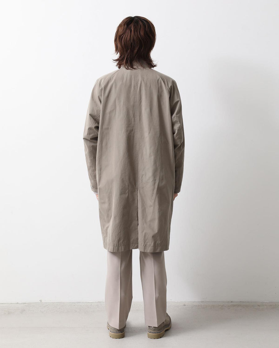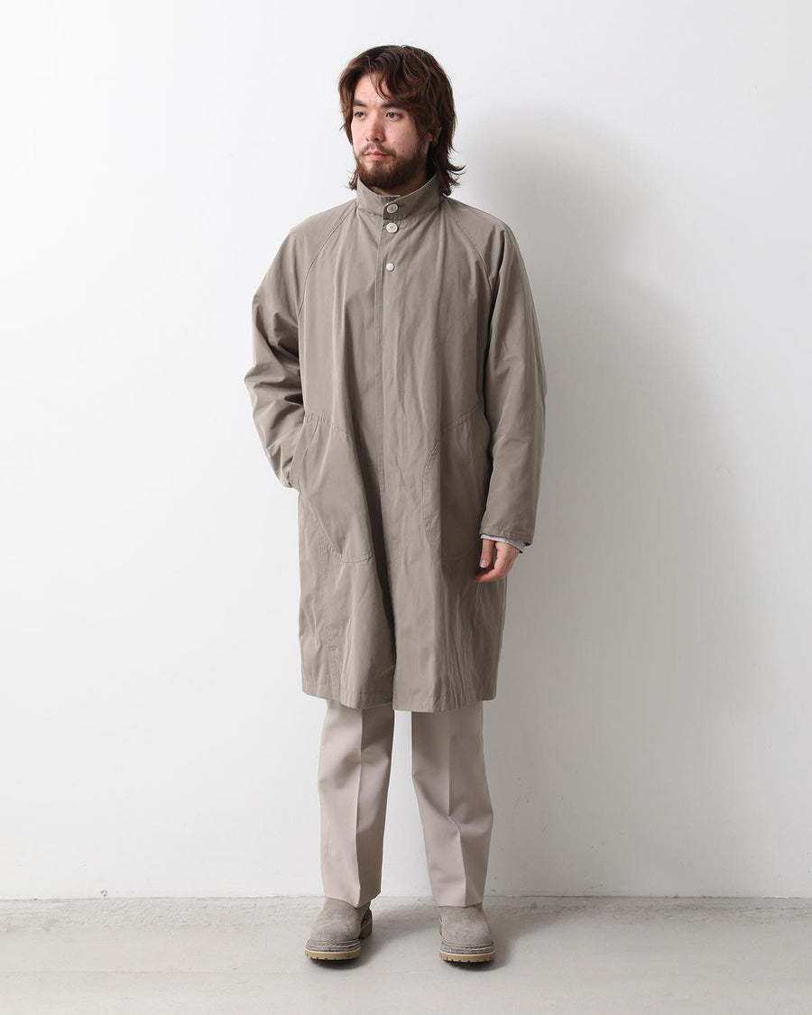 From the nonnative SPRING & SUMMER 2025 COLLECTION, this Balmacaan-style long coat features a slightly smaller standing collar and a relaxed silhouette. It combines elegant style with casual details like patch pockets.
