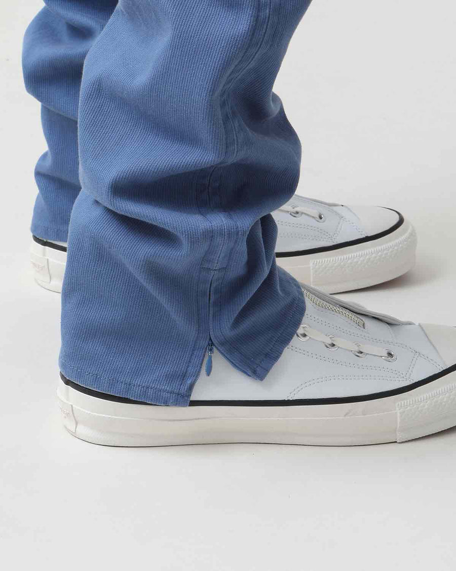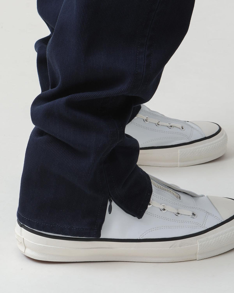 The DWELLER 5P 2WAY JEANS 01 has adjustable side strings and a concealed zipper at the hem for versatile styling.