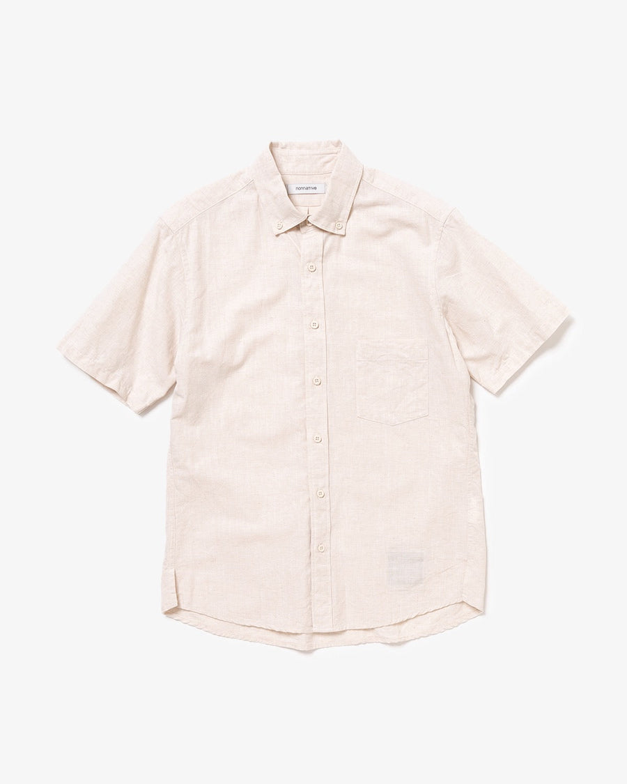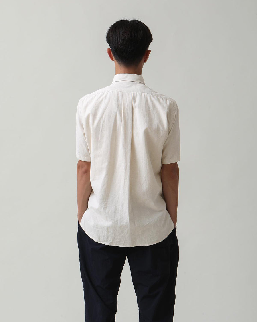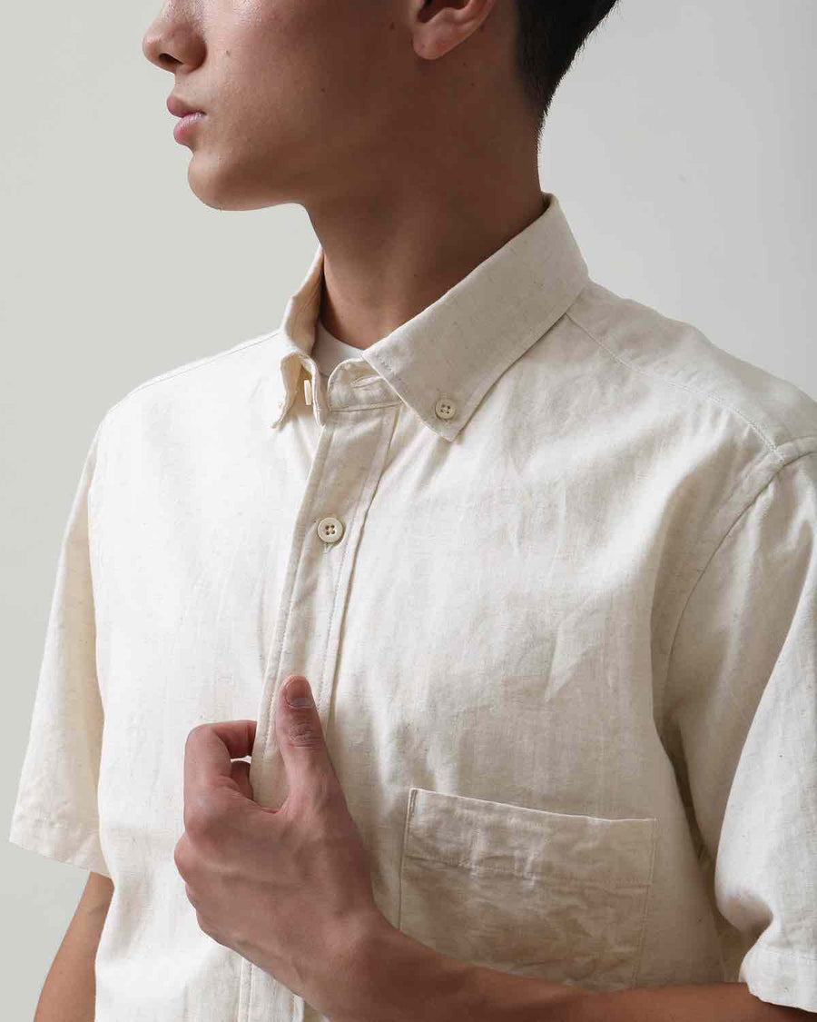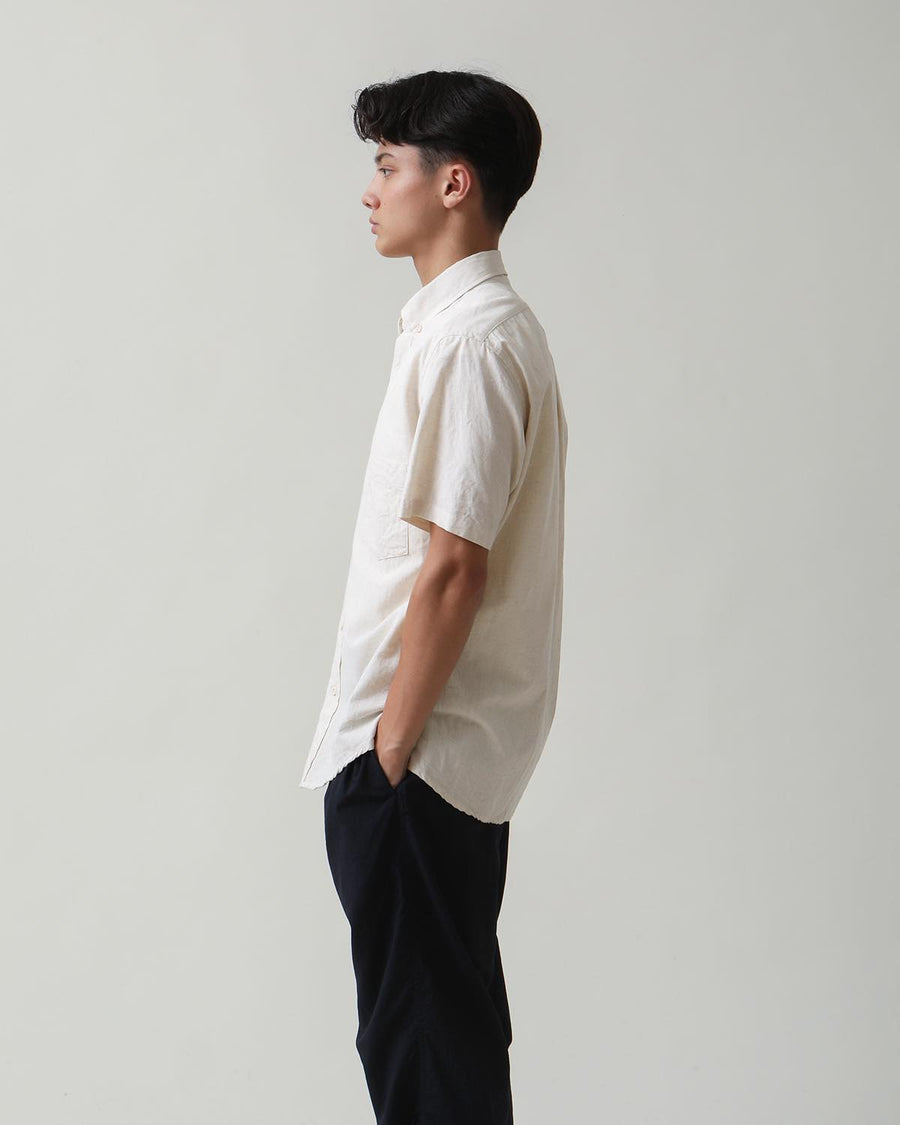 From nonnative SS25, a short-sleeve button-down shirt in cotton-linen canvas with an updated, smaller collar for a cleaner look when open.