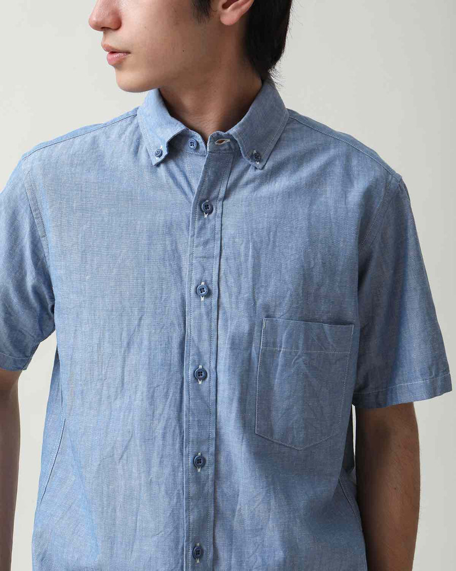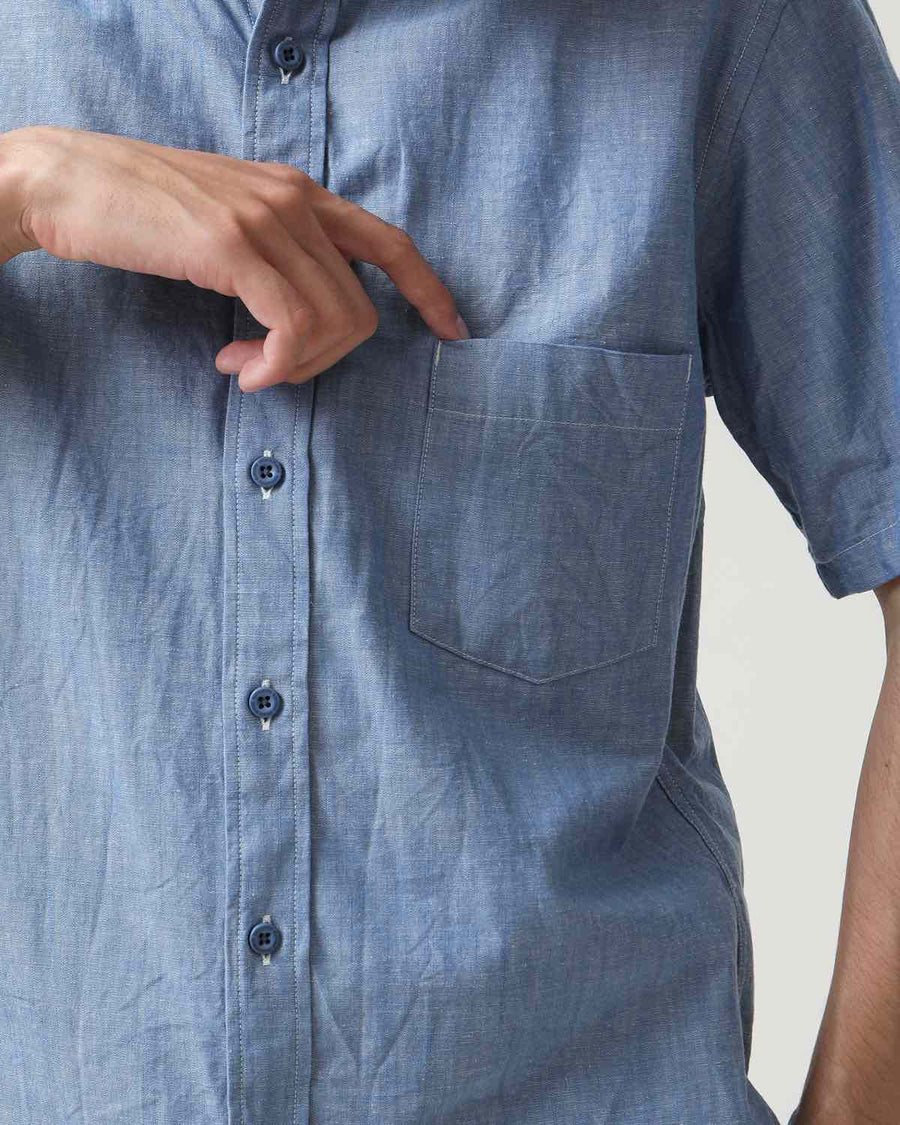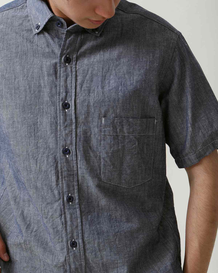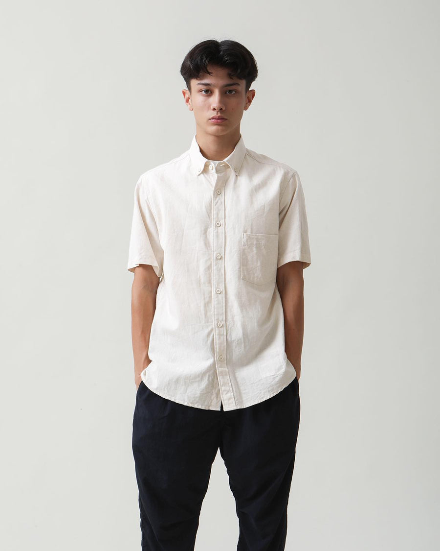 From nonnative SS25, a short-sleeve button-down shirt in cotton-linen canvas with an updated, smaller collar for a cleaner look when open.