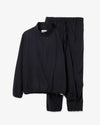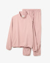 From the “BOUNCE” series, this pajama set pairs a relaxed half-zip pullover with jogger pants featuring knee tucks for easy movement. Glow-in-the-dark tags and a hidden collar pocket add playful, functional details.