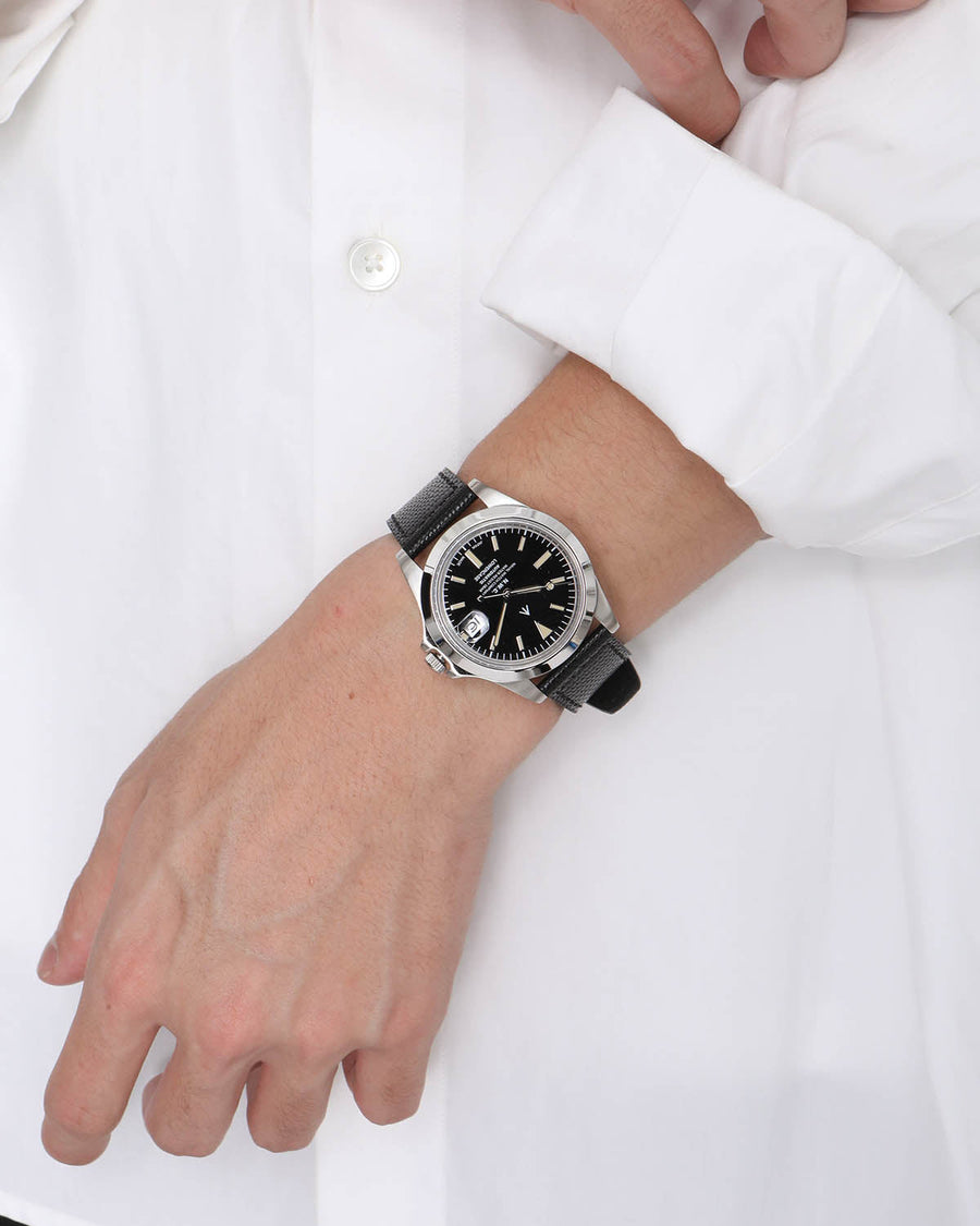 This exquisite timepiece boasts a stainless steel case, complemented by a semi-matte black dial adorned with Real SV Bar indexes for a touch of sophistication. The Ivory-White "Lumi-Nova" Super luminous printing on the dial and the silver shiny hands, featuring Ivory-White "Lumi-Nova" Super printing, ensure both style and functionality.