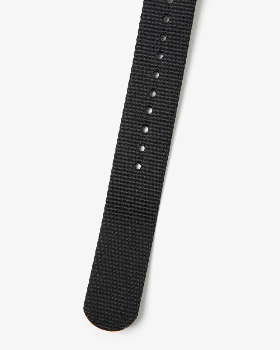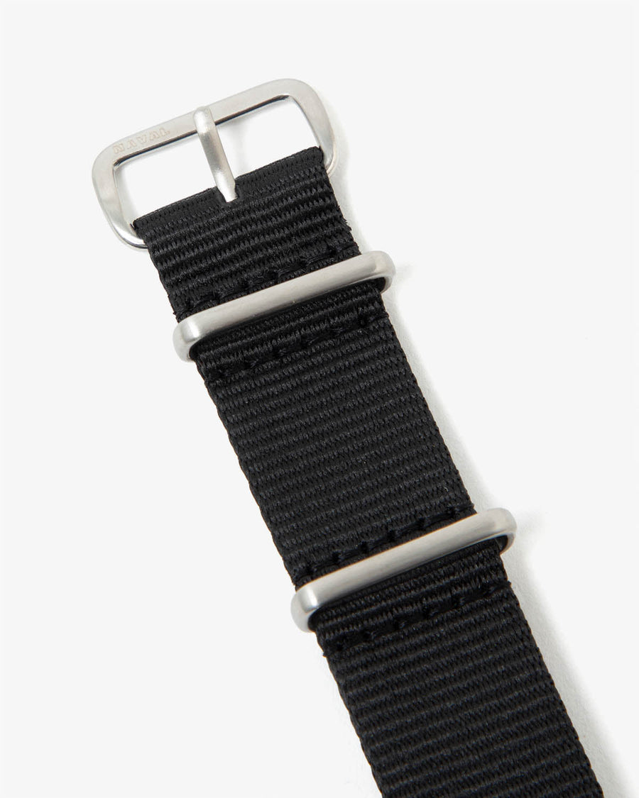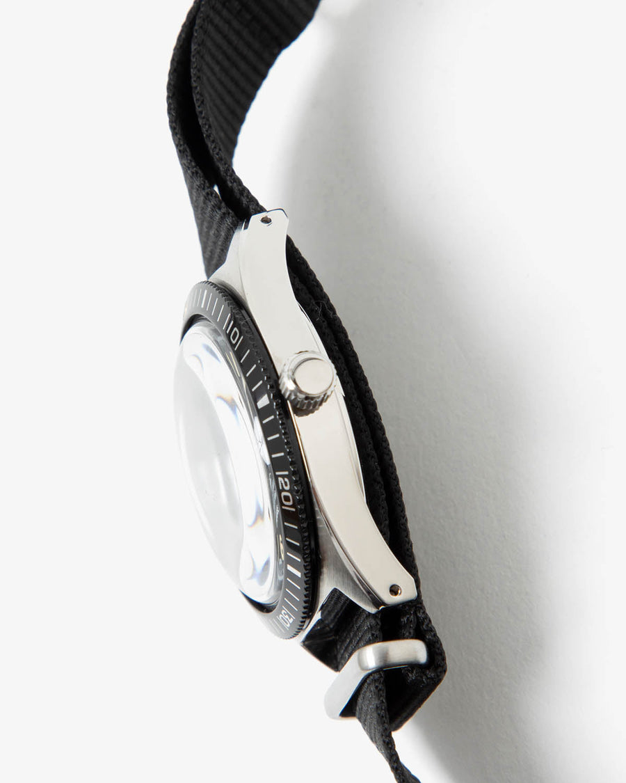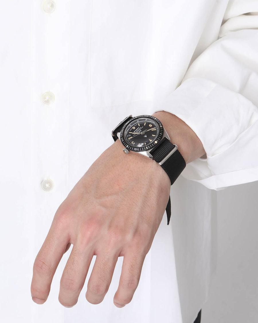 Assembled in Japan, the stainless steel case, acrylic dome lens, and original Seiko Cal.VJ52 quartz movement embodies a perfect harmony of modern functionality and vintage aesthetics, complemented by the antique-inspired Ivory-White "LumiNova" accents. The watch is completed with a black polyester NATO-type band for a versatile urban-military appeal.