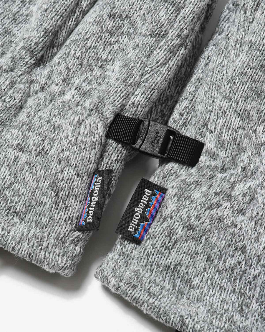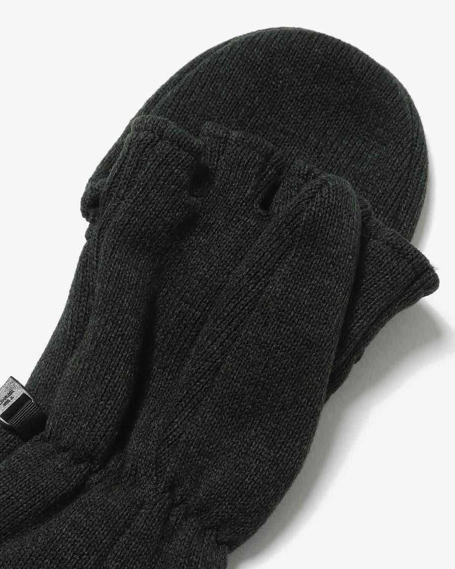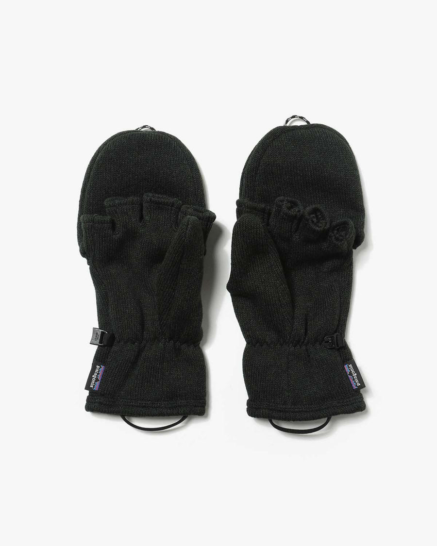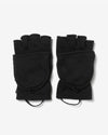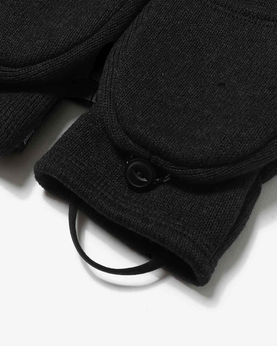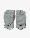 Mittens made from recycled polyester knit with a fleece lining, convertible to fingerless gloves using the wrist button and loop.