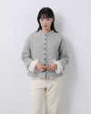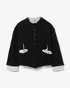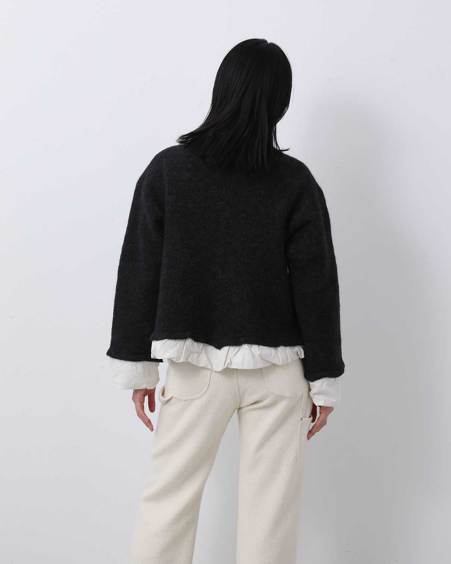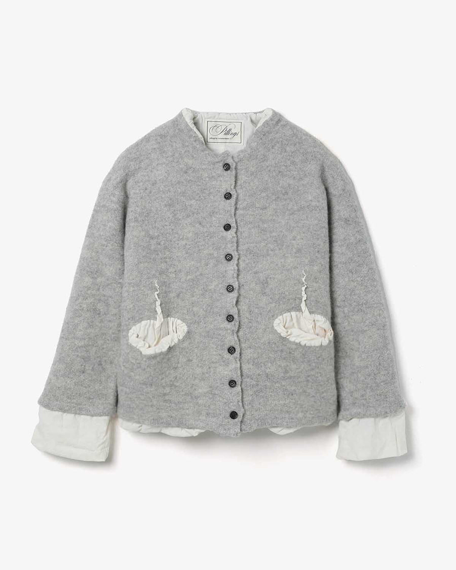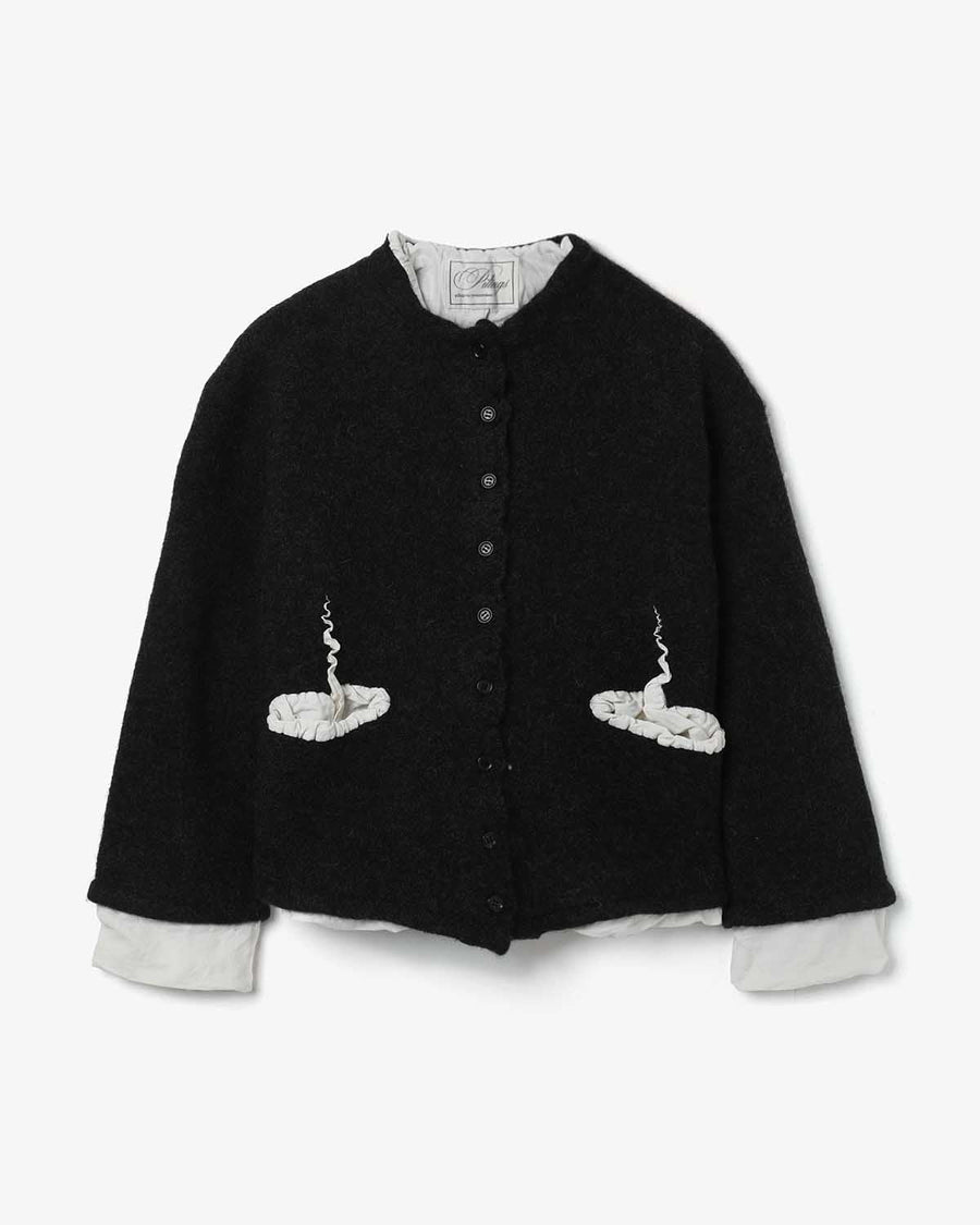 A felted wool knit jacket featuring a unique detail where the lining flares outward like frills due to the differential shrinkage between outer and inner fabrics.