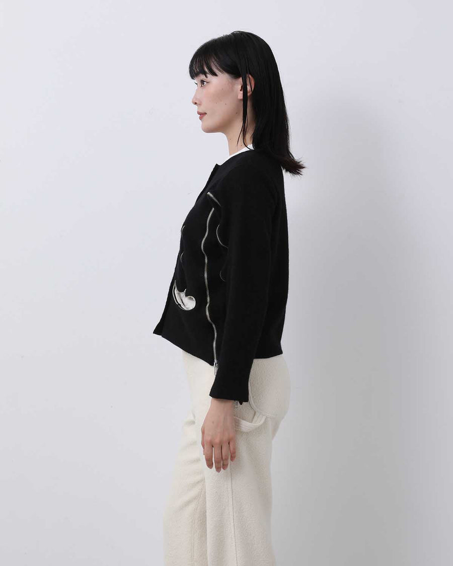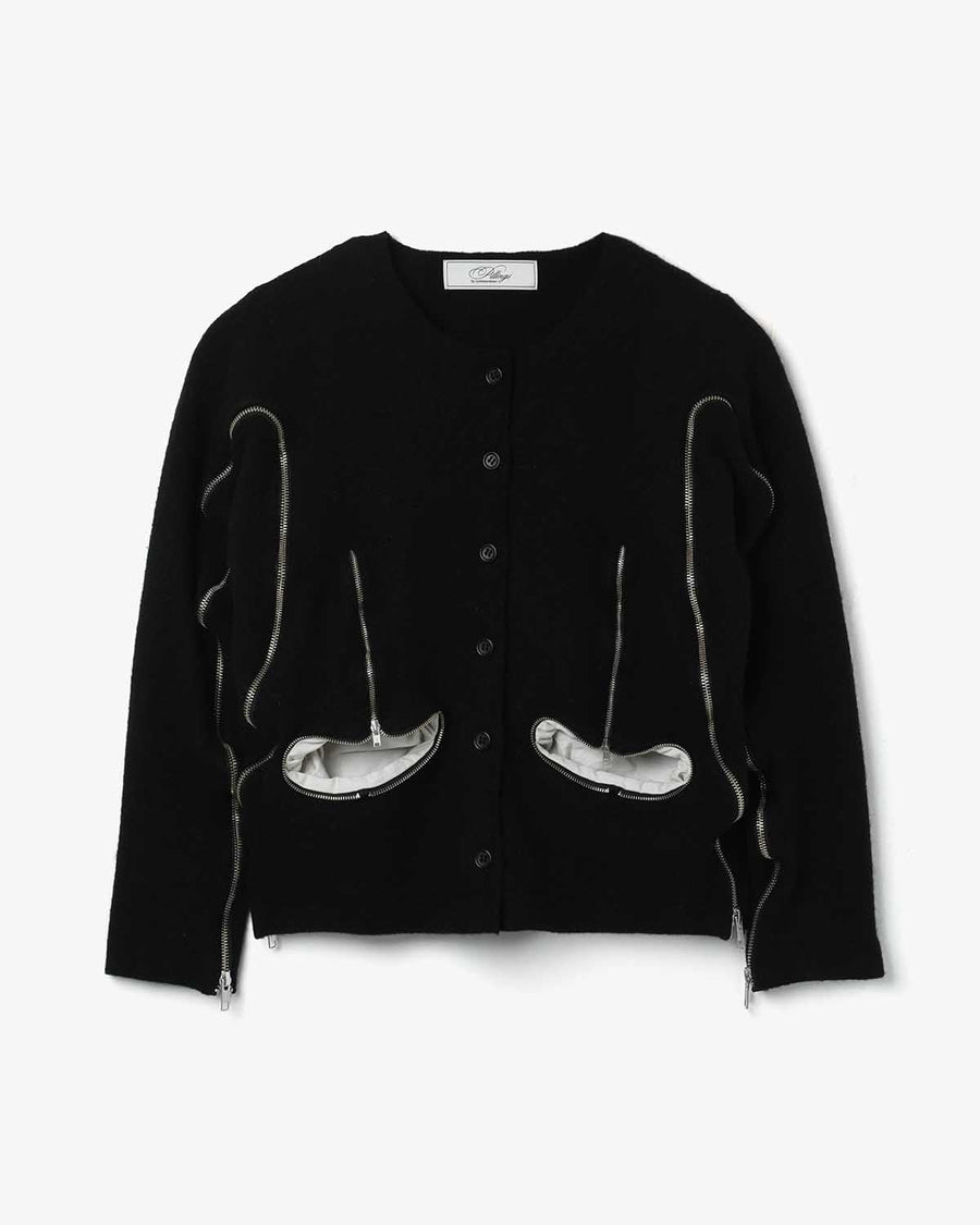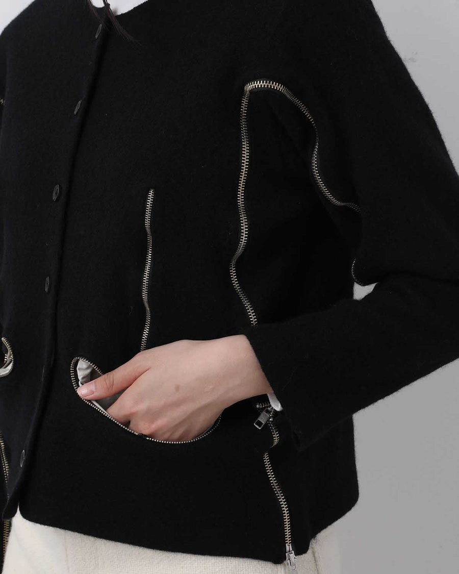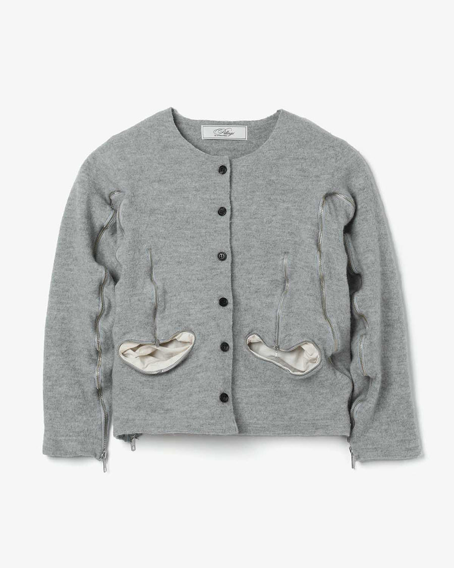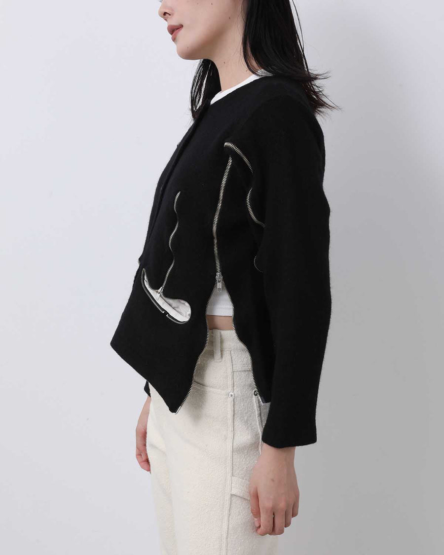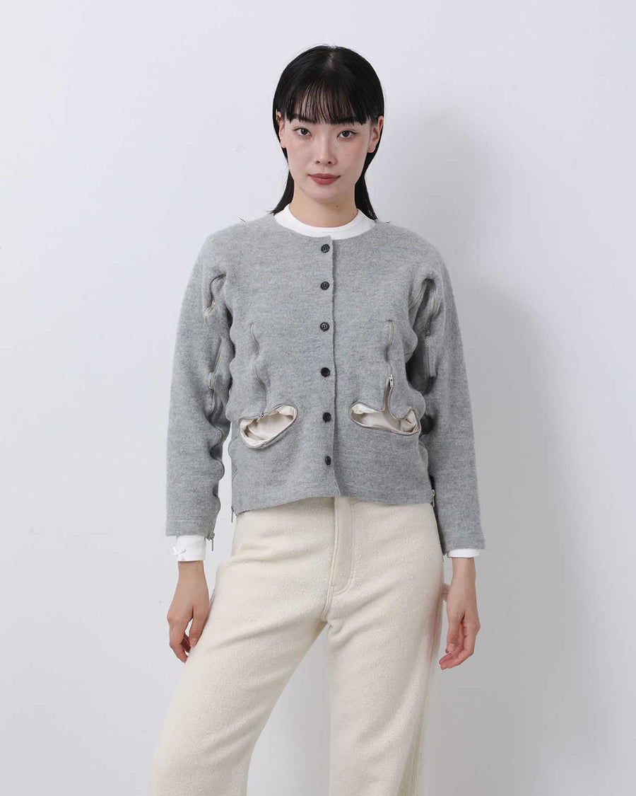 A felted wool knit jacket featuring a unique detail where the lining flares outward like frills due to the differential shrinkage between outer and inner fabrics.