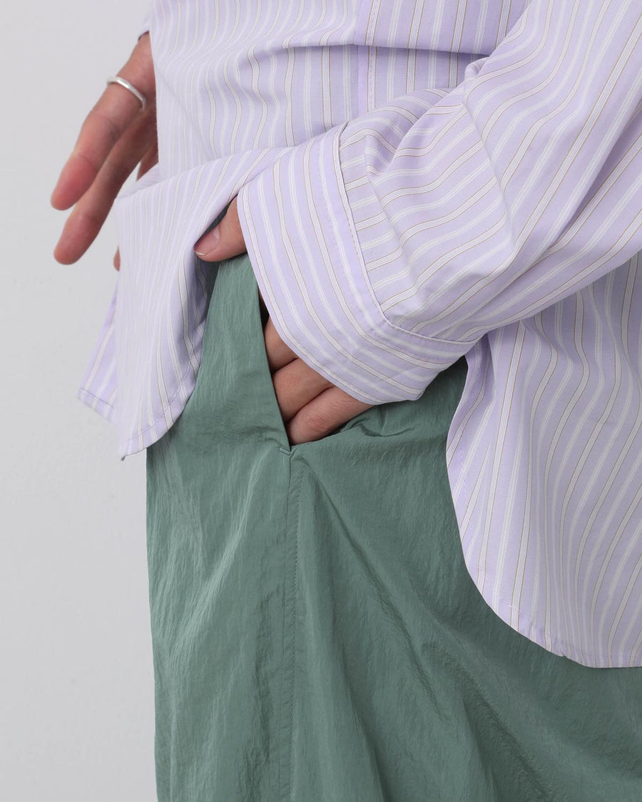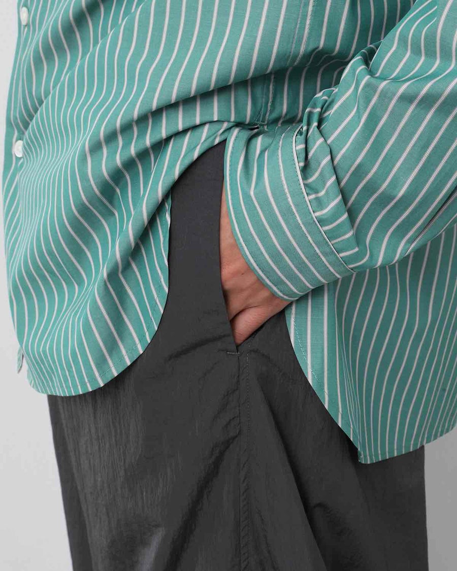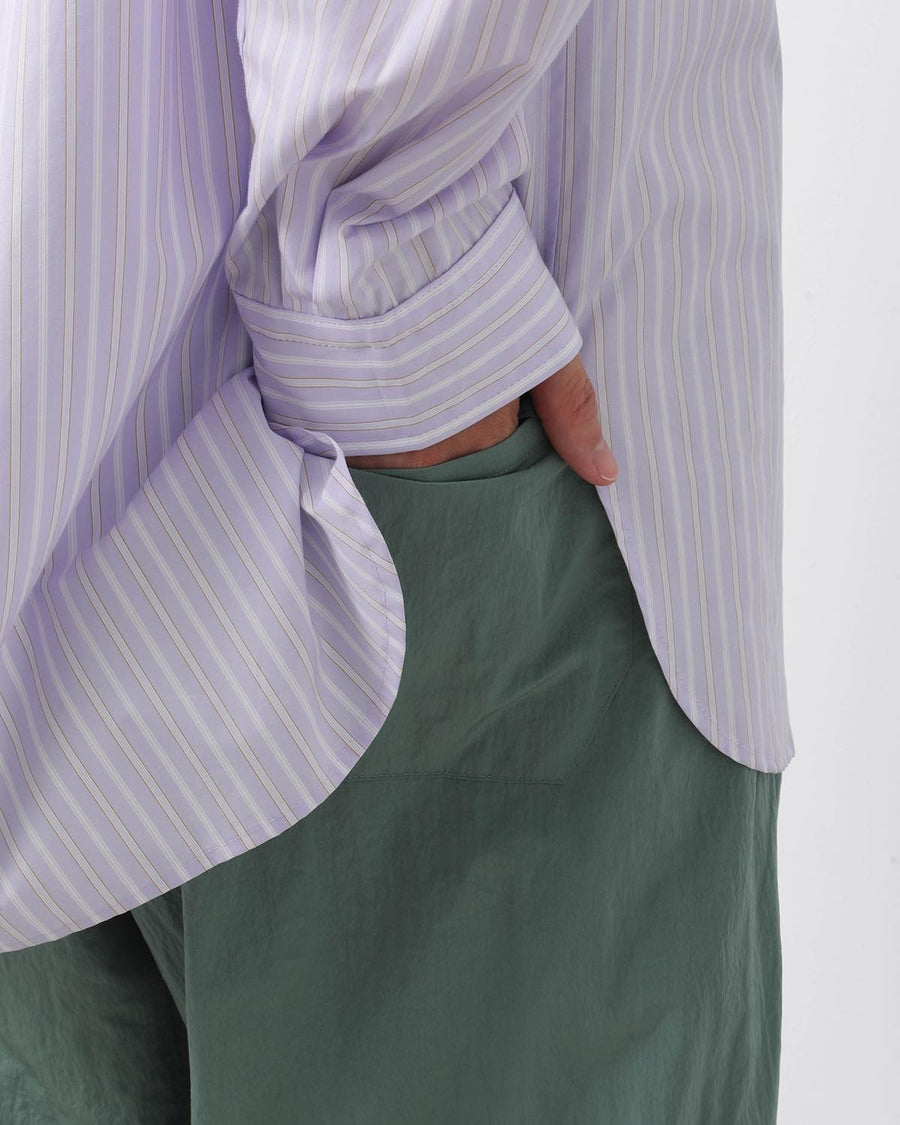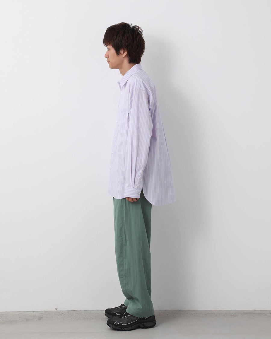 JUDO PANTS B are made from breathable, PFC-free water-repellent fabric by Italy's LIMONTA, using recycled polyester with a natural wrinkled texture.