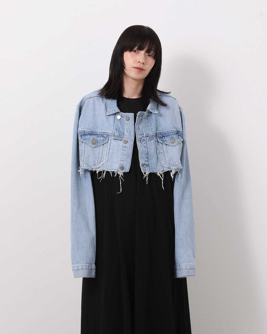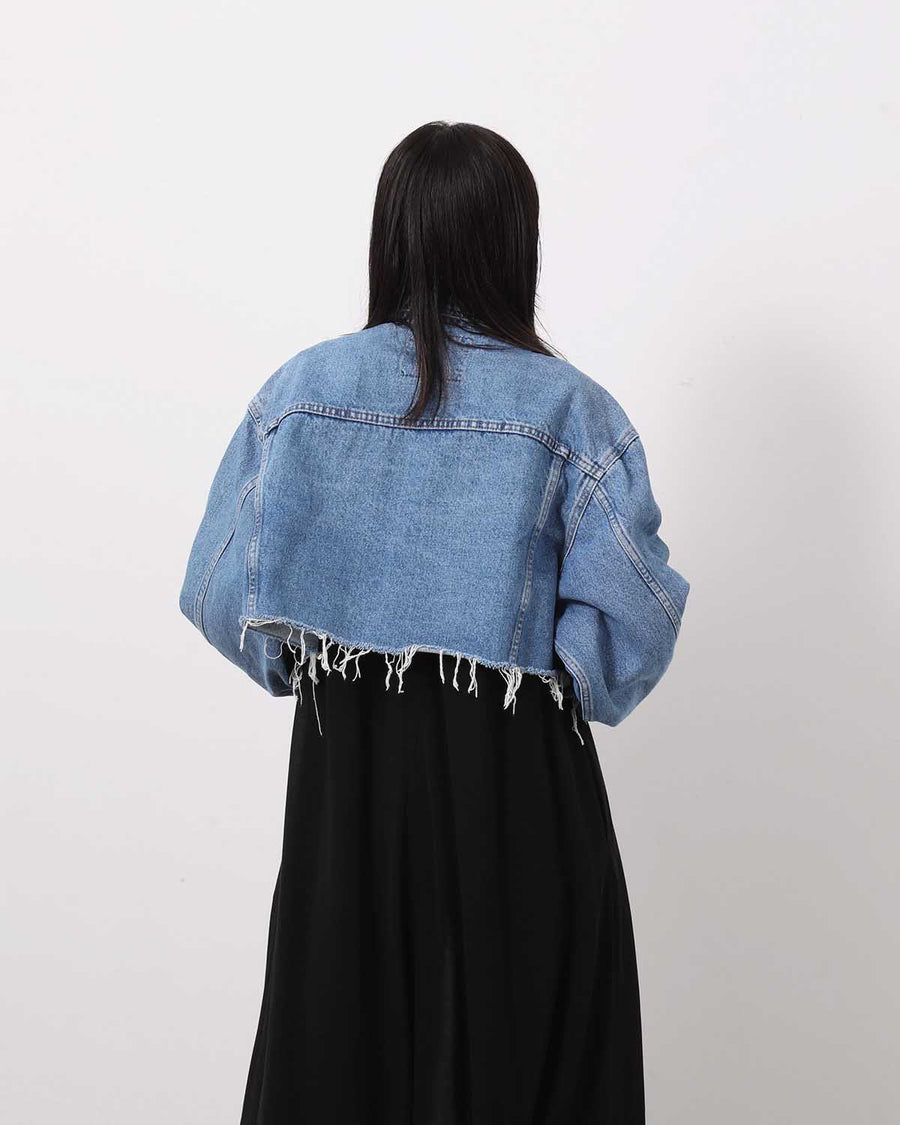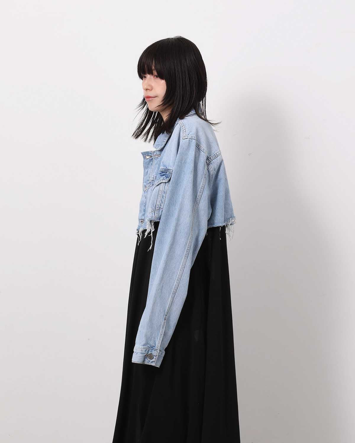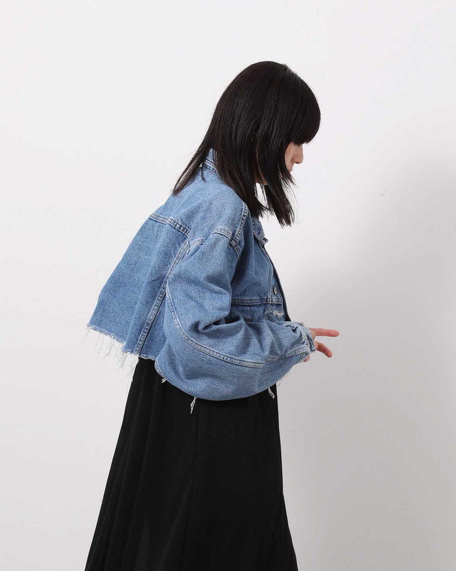 QUIITO’s MICRO DENIM JK is a cropped denim jacket made from vintage fabric, cut with an original pattern and distinctive lines that offer a fresh, unconventional look.