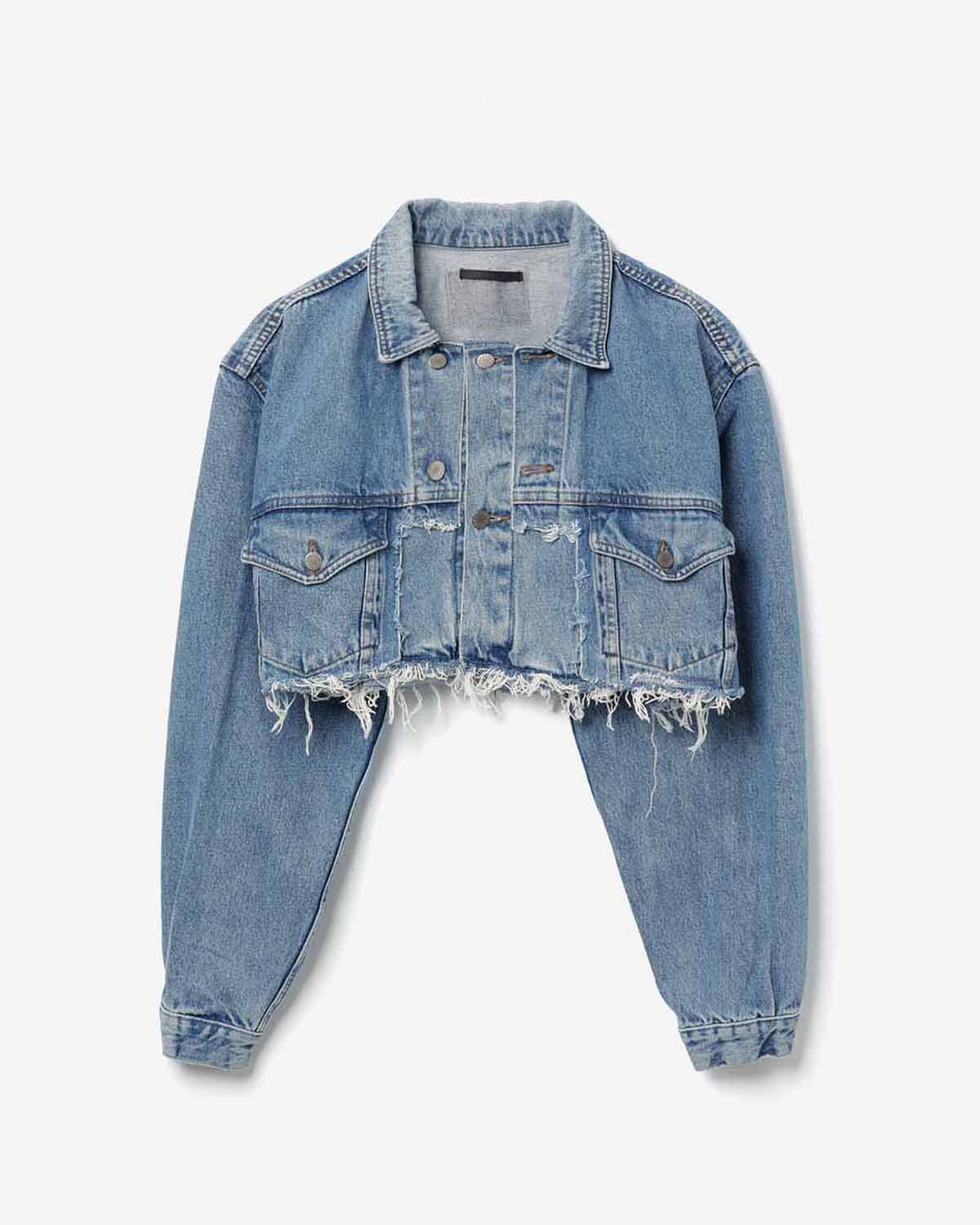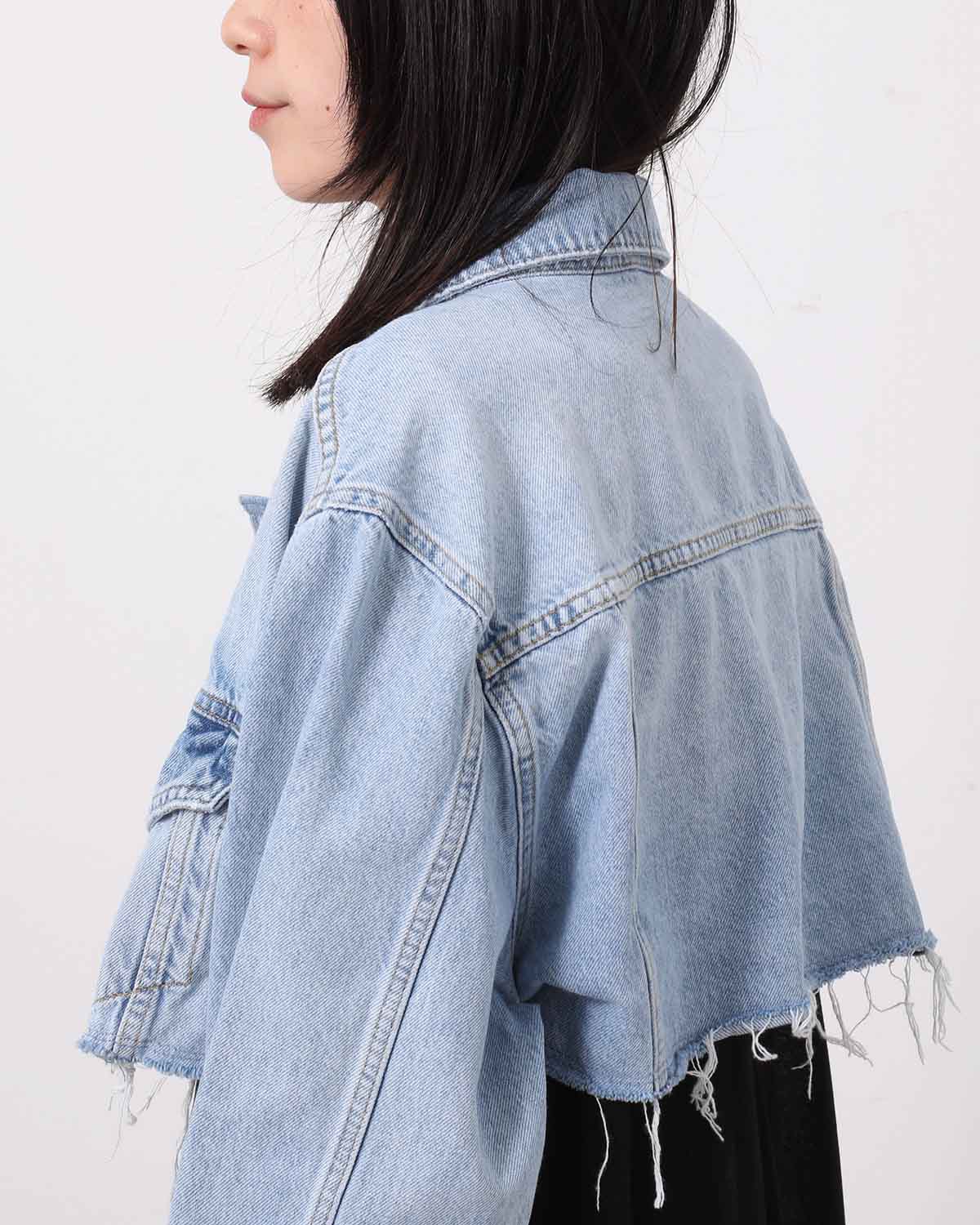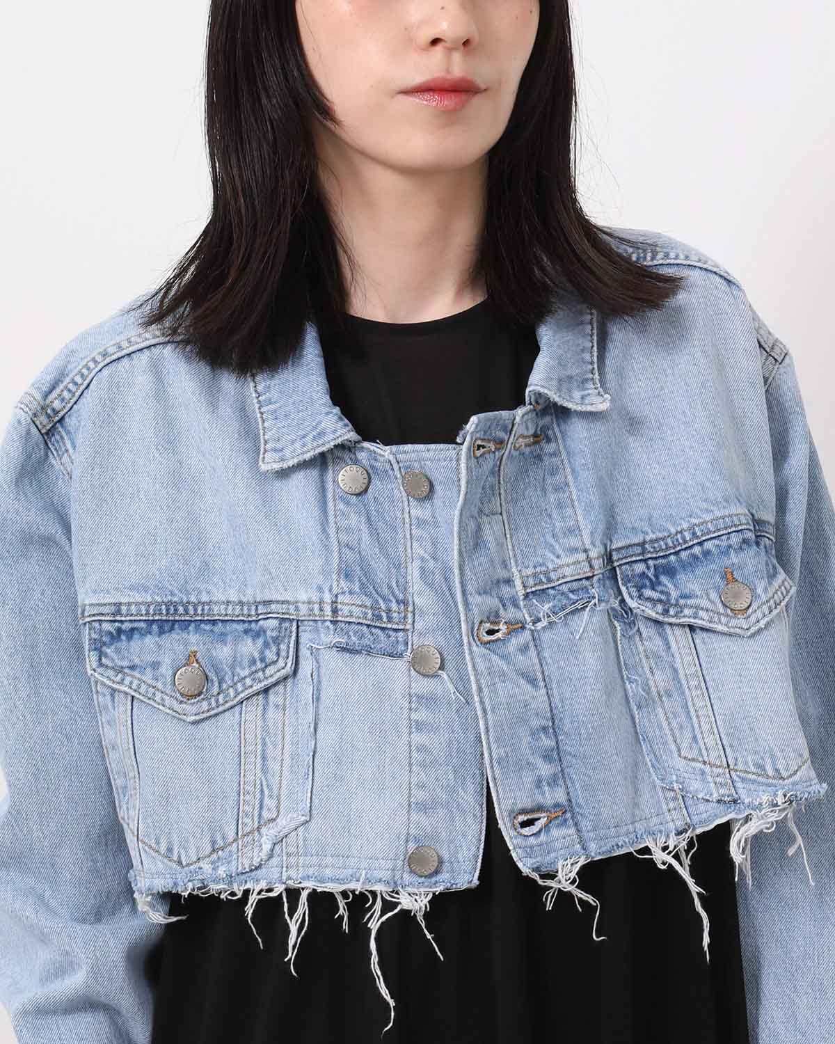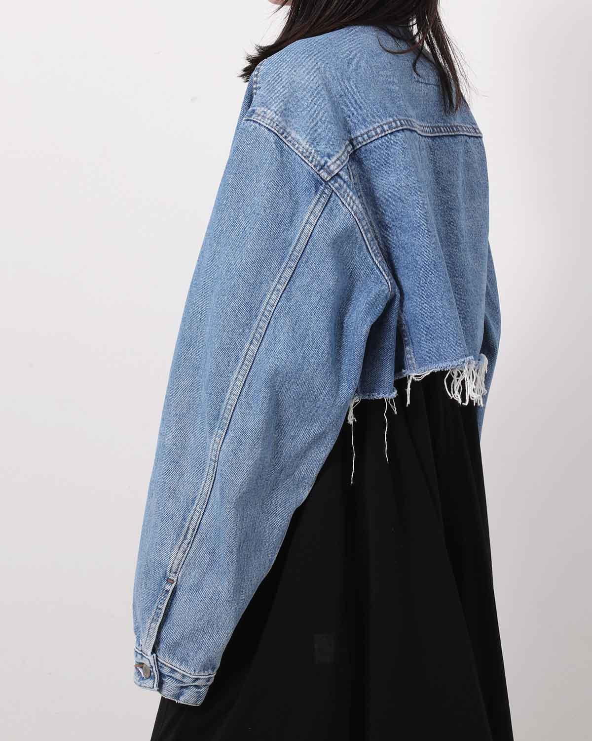 QUIITO’s MICRO DENIM JK is a cropped denim jacket made from vintage fabric, cut with an original pattern and distinctive lines that offer a fresh, unconventional look.