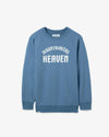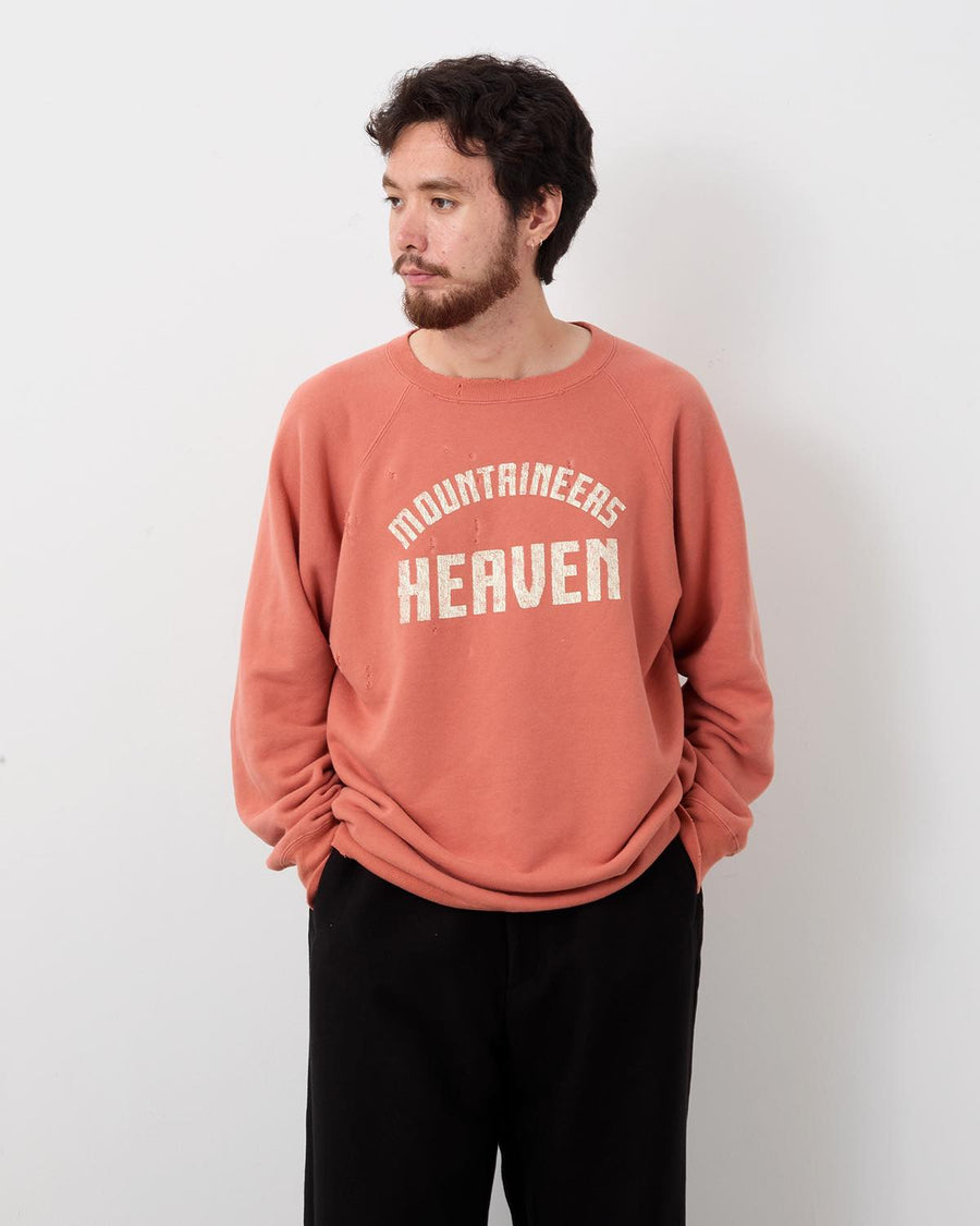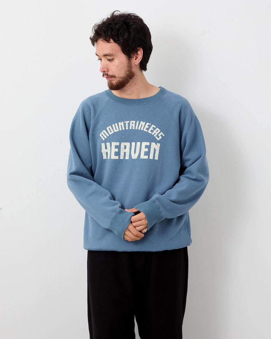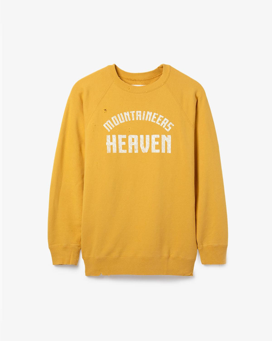 A 100% cotton sweatshirt with hand-distressing and a cracked rubber print of this season’s theme, “MOUNTAINEERS HEAVEN.” Each piece is unique and gains character with wear.