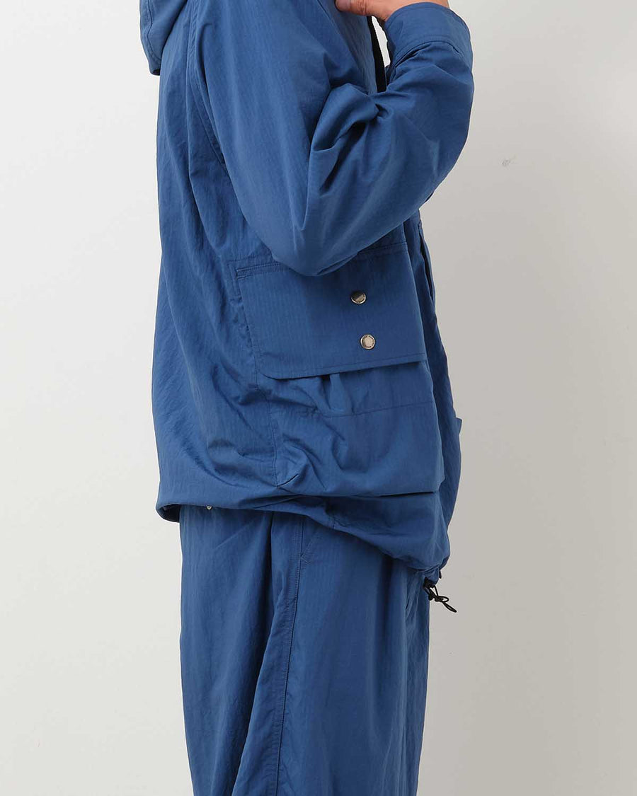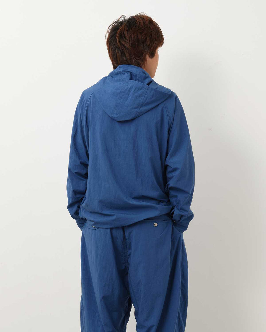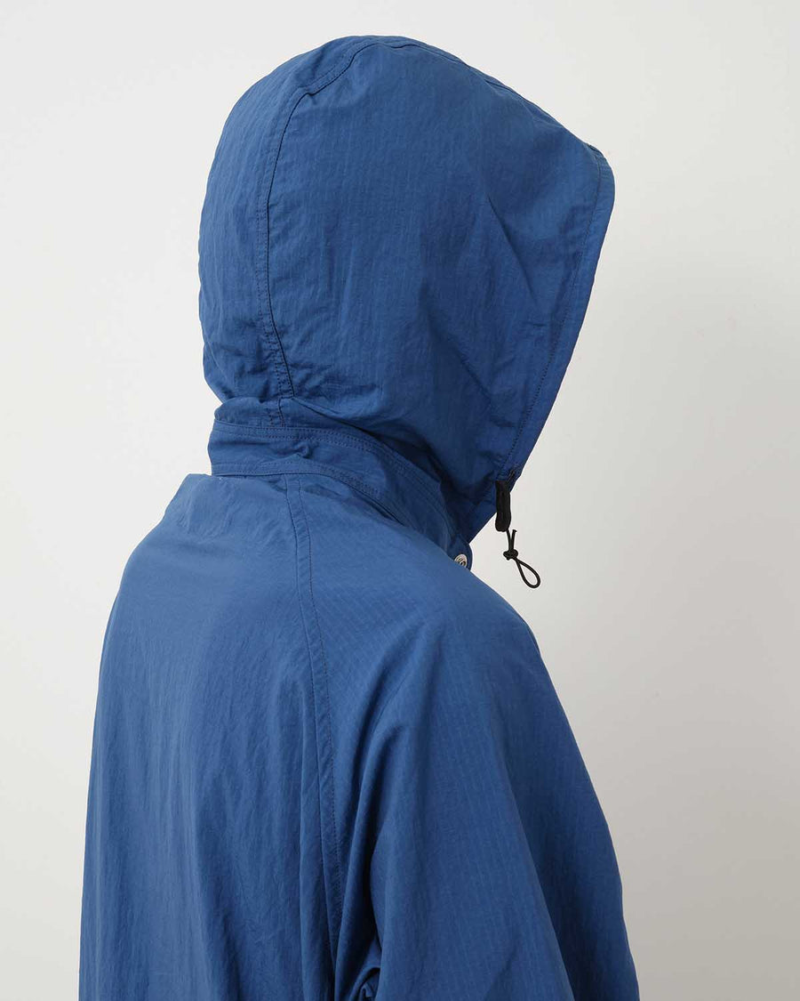 リップストップナイロンクロス素材を使用した、コーチジャケット型のフード付きシャツです。