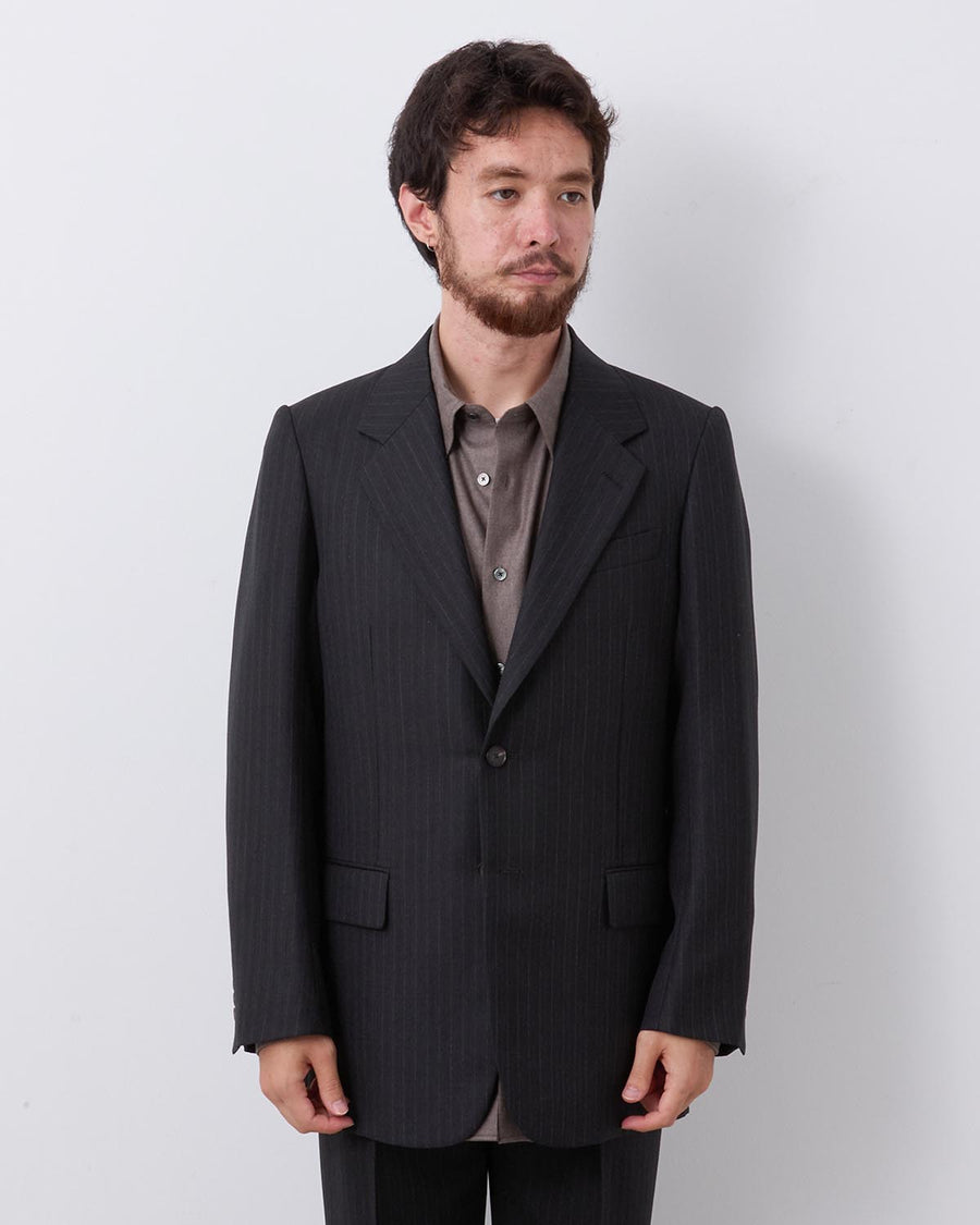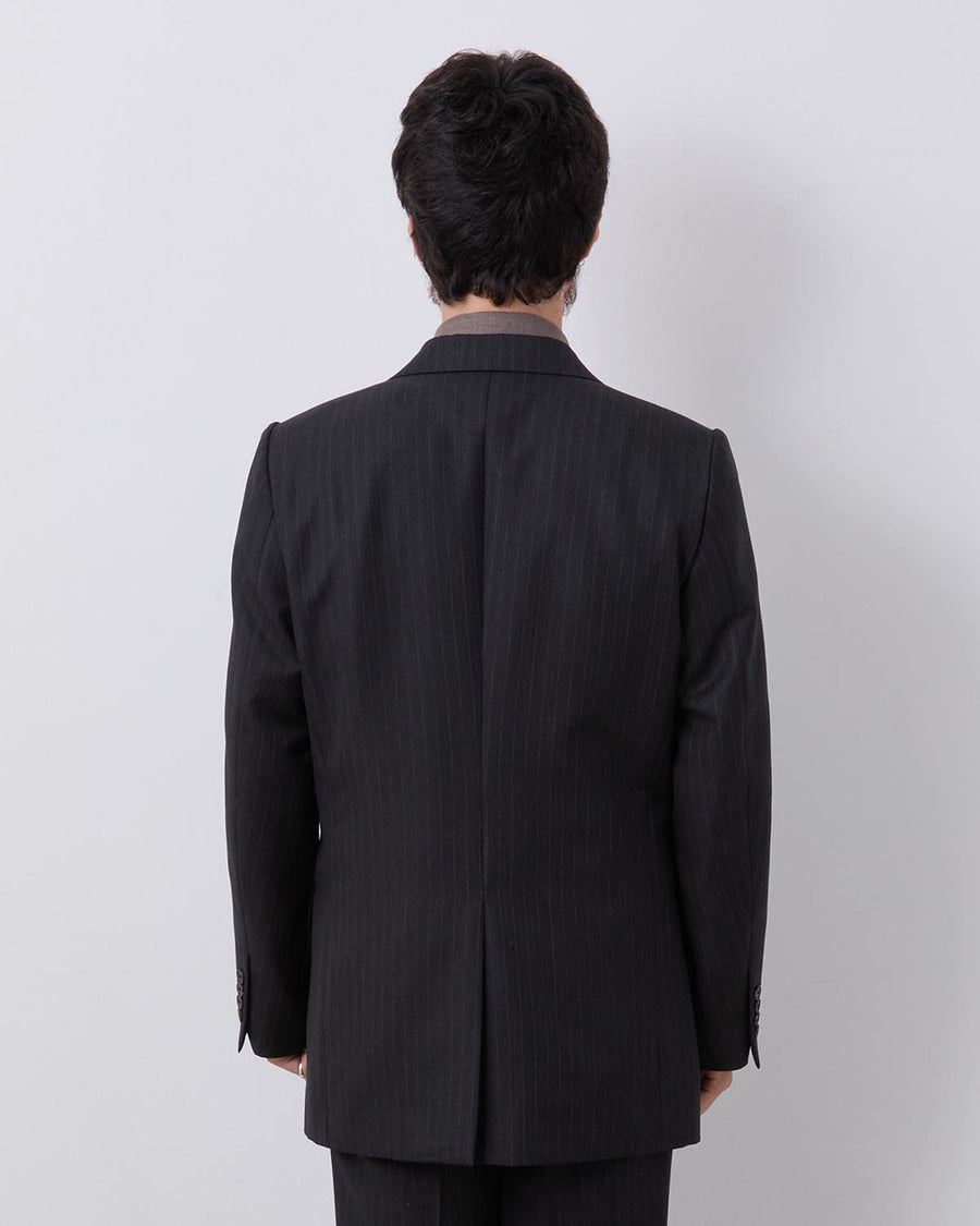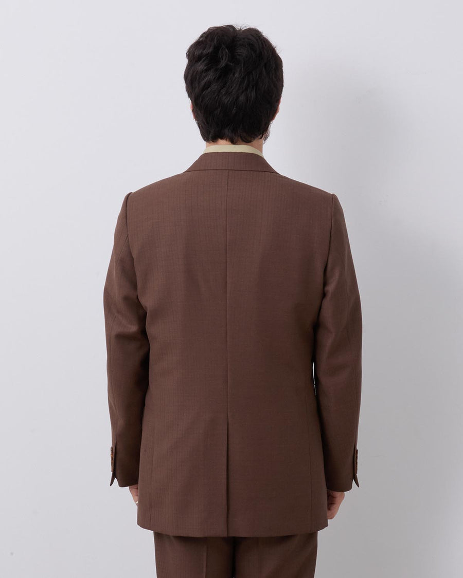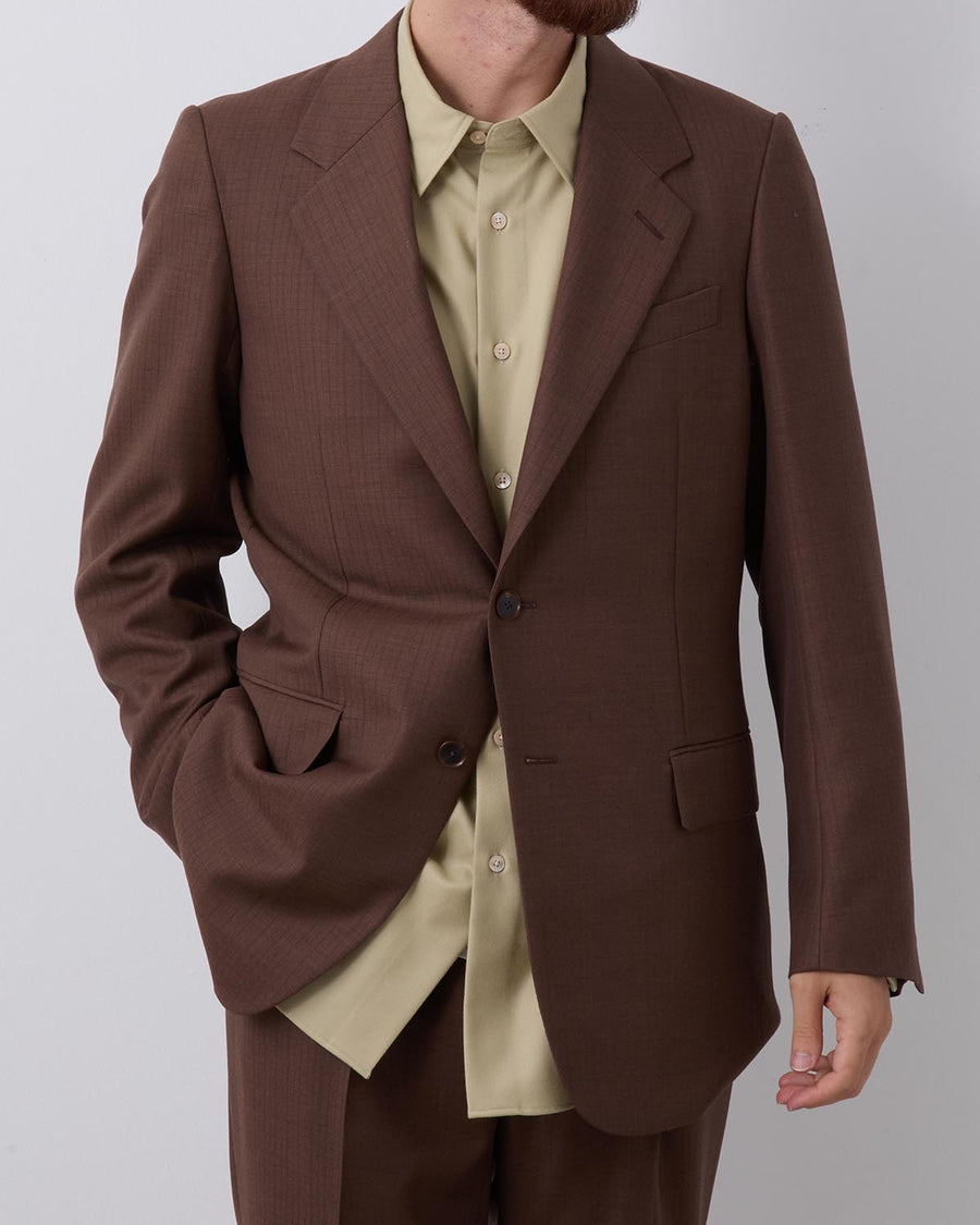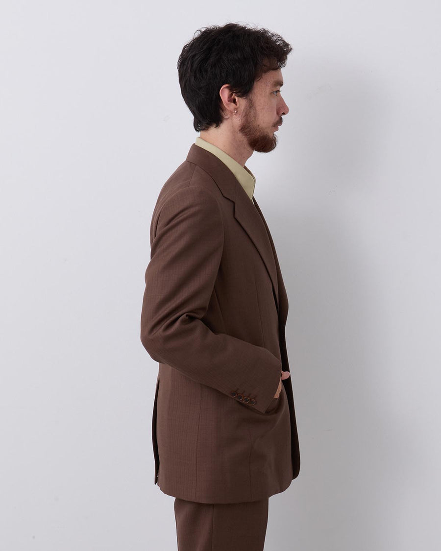 This lapel jacket is woven with Super 130’s super extra-fine Merino wool in the warp and Bluefaced Leicester wool in the weft.