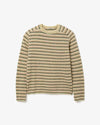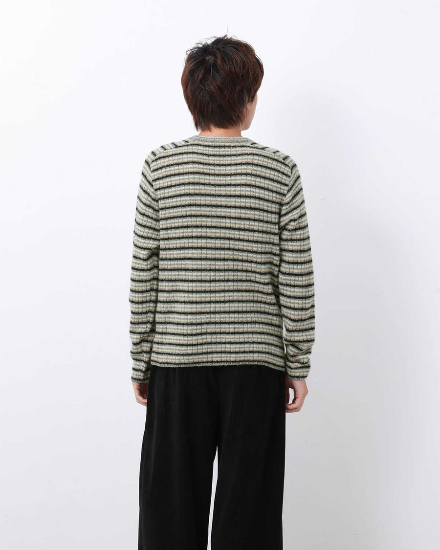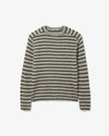 Pullover knit made from a Shetland wool and cashmere blend, knitted in a low gauge for a unique texture that combines the crispness of Shetland with the softness of cashmere.