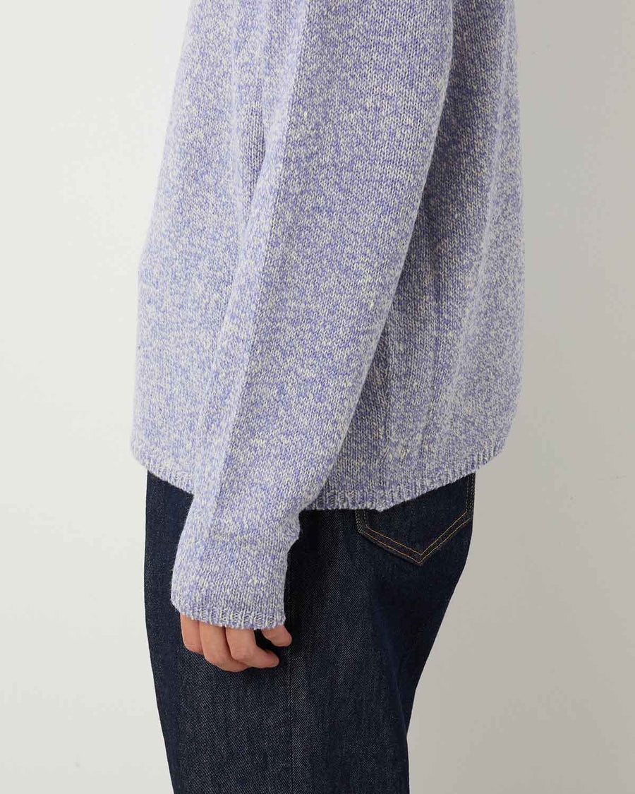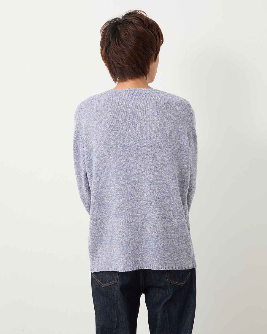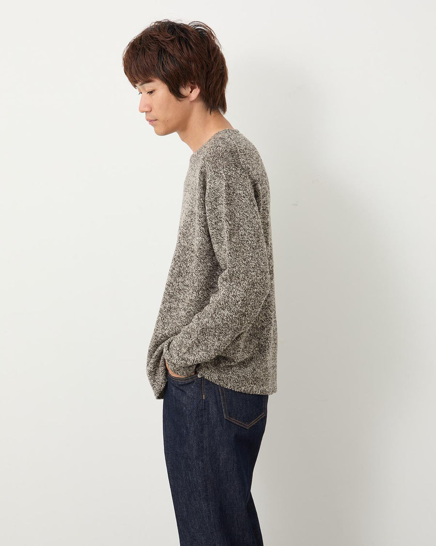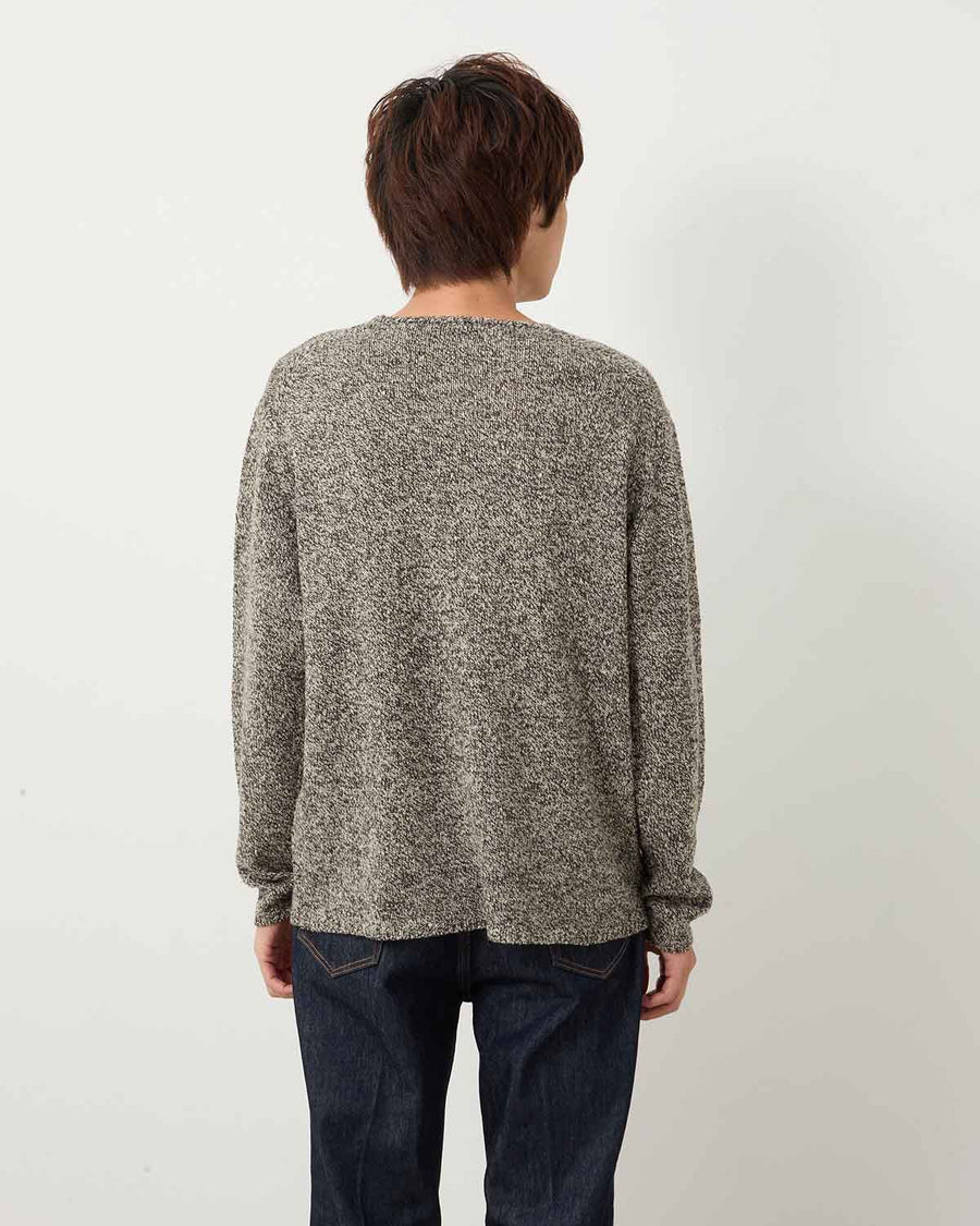 A pullover knit made from heathered yarn of hand-spun-style wool slub cotton and Tussar silk. It offers a warm texture with a unique blend of loft and drape.