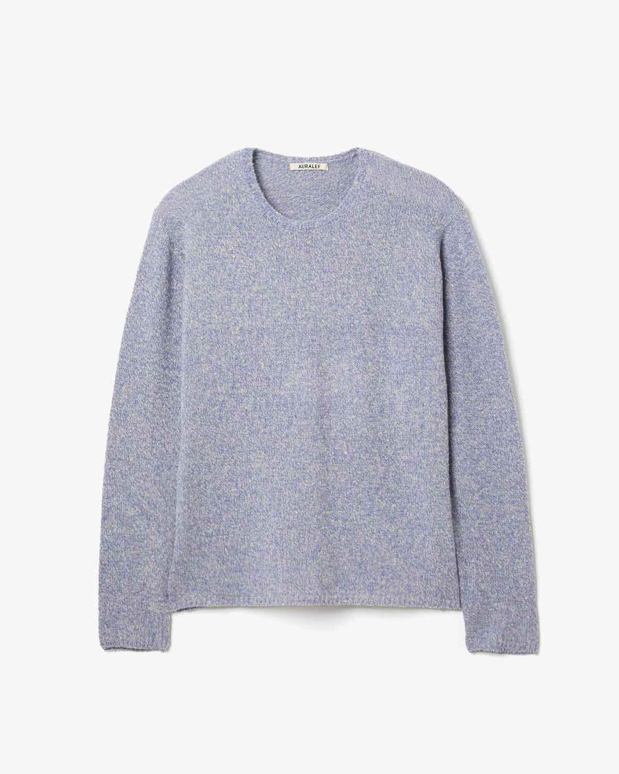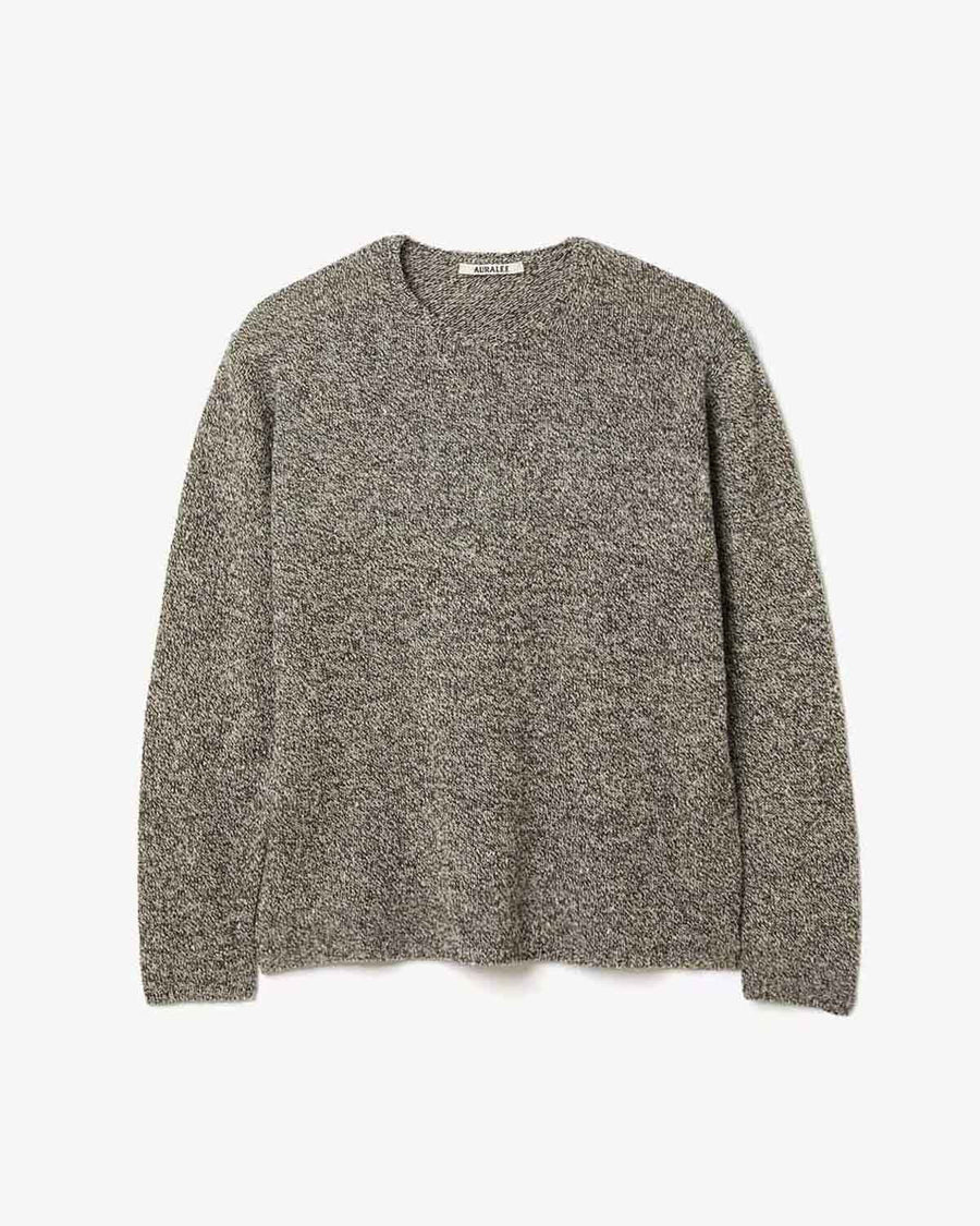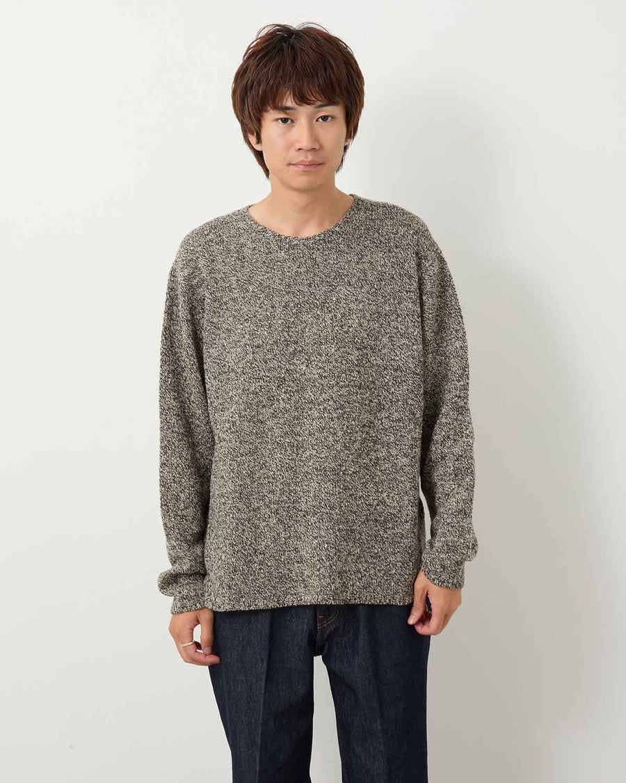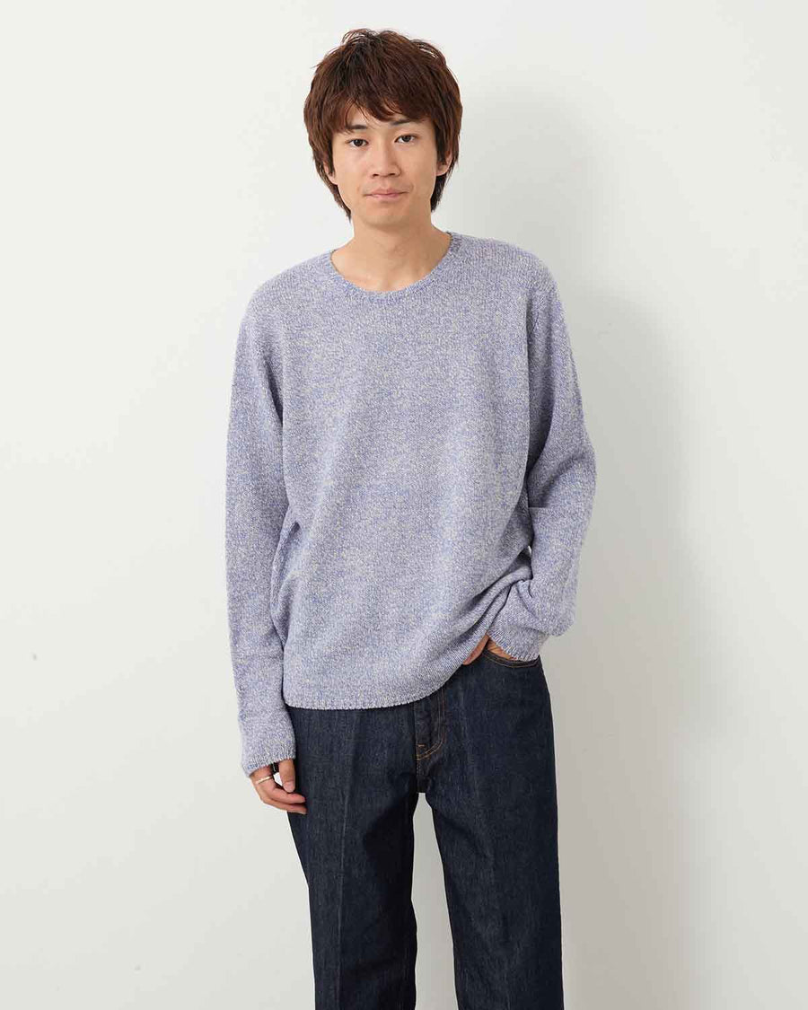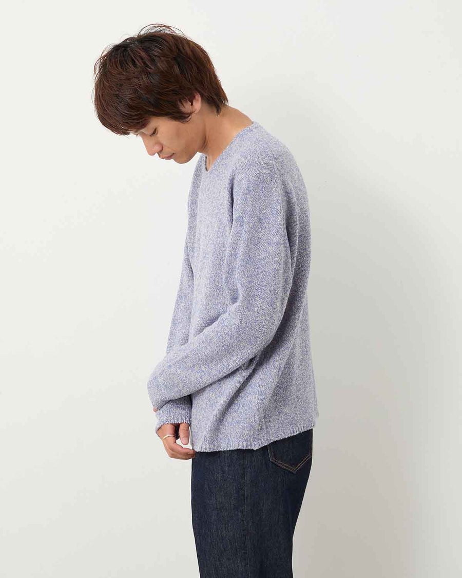A pullover knit made from heathered yarn of hand-spun-style wool slub cotton and Tussar silk. It offers a warm texture with a unique blend of loft and drape.