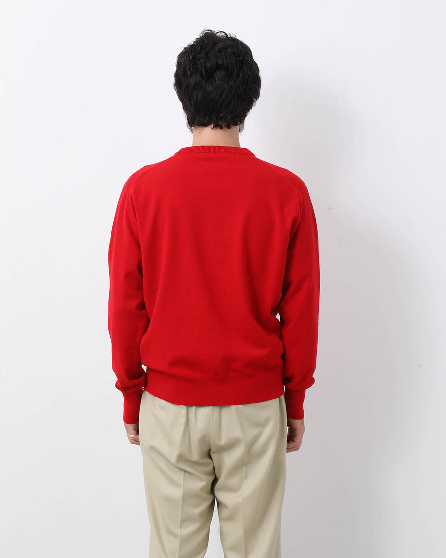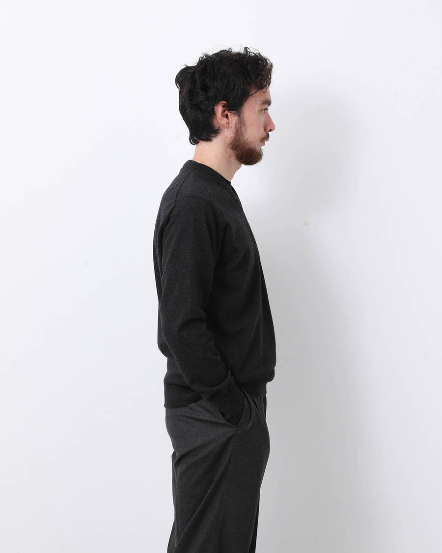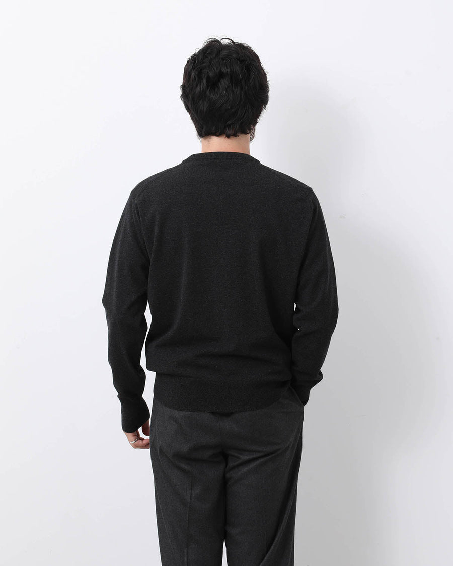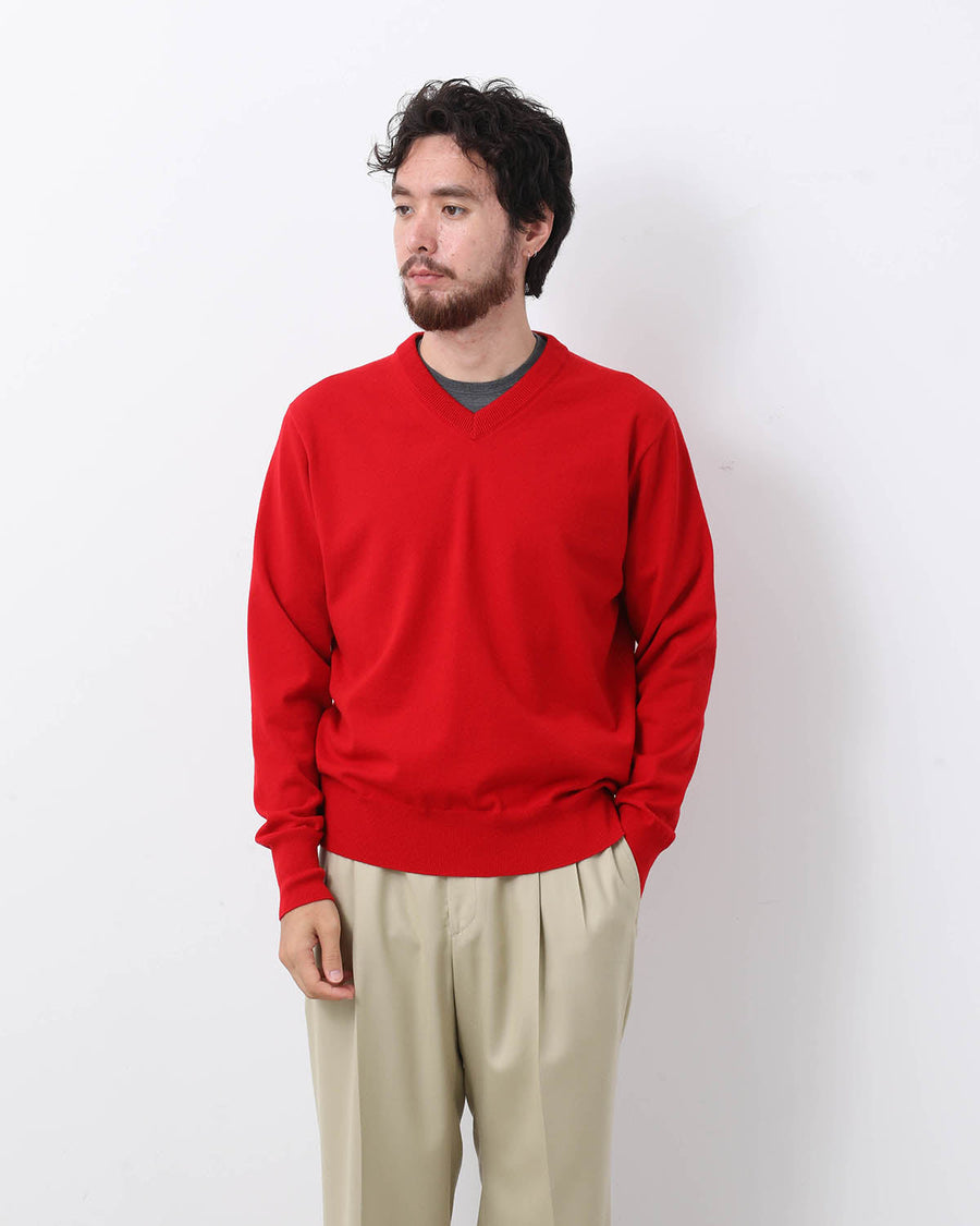 A V-neck pullover knit made from ultra-fine wool, carefully spun and knitted like cashmere garments. It features a high-gauge finish with a refined material that combines firmness and smoothness.