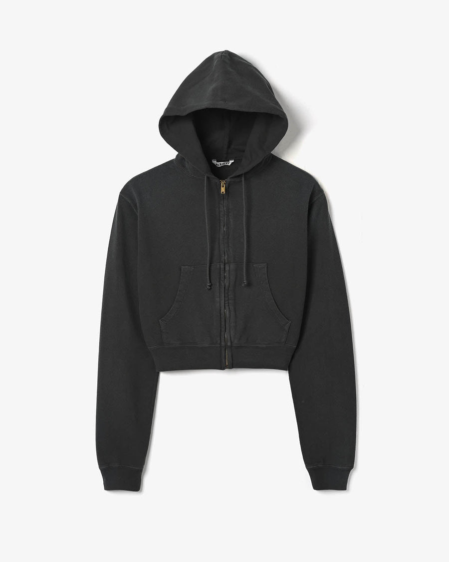 A zip-up hoodie in Pima cotton and air-spun yarn, garment-dyed for a lightweight, textured, and worn-in finish.