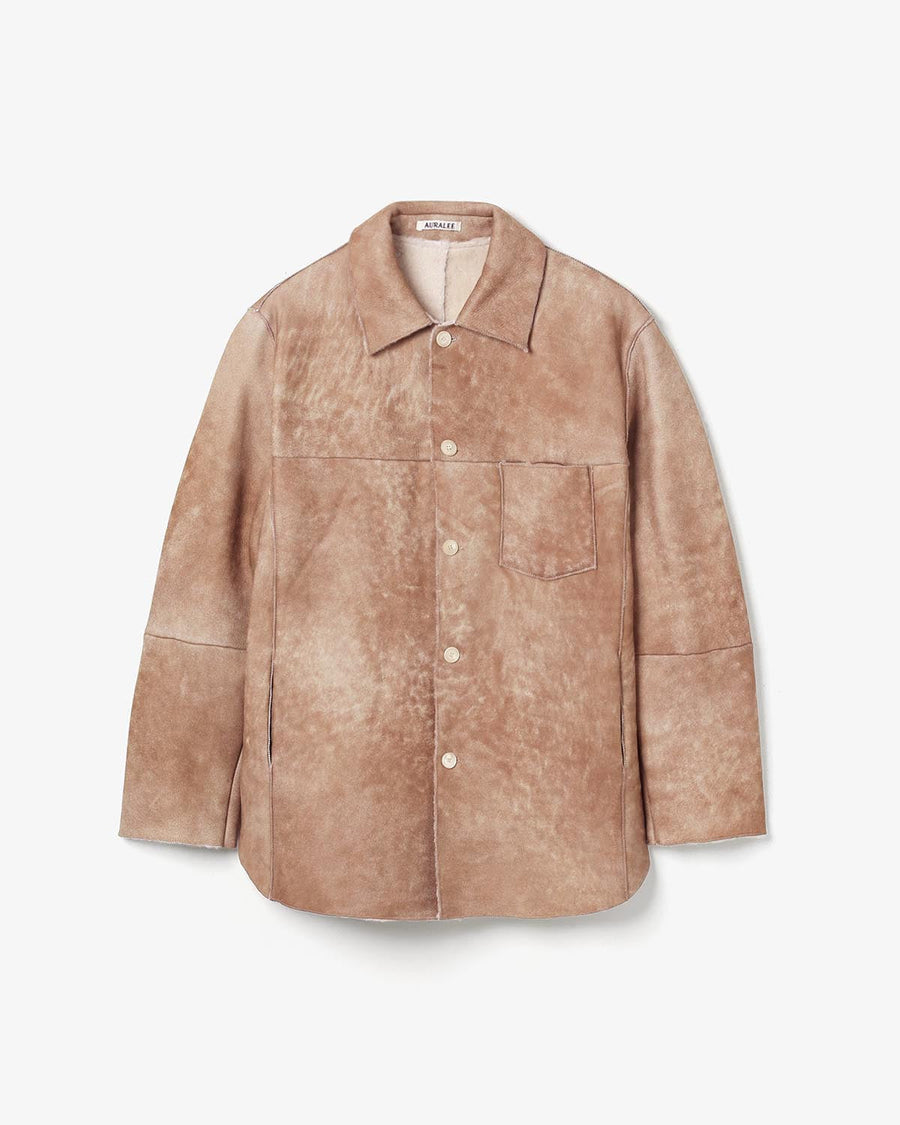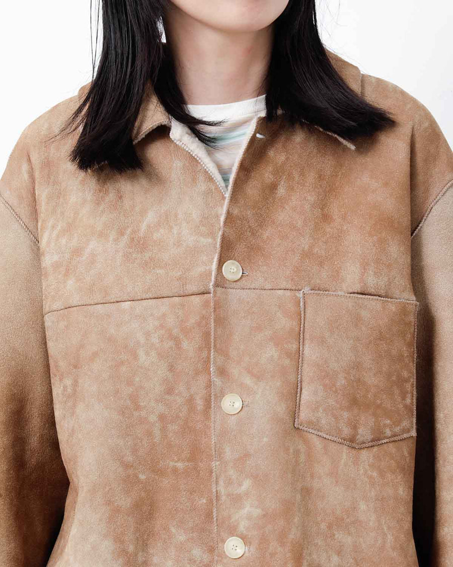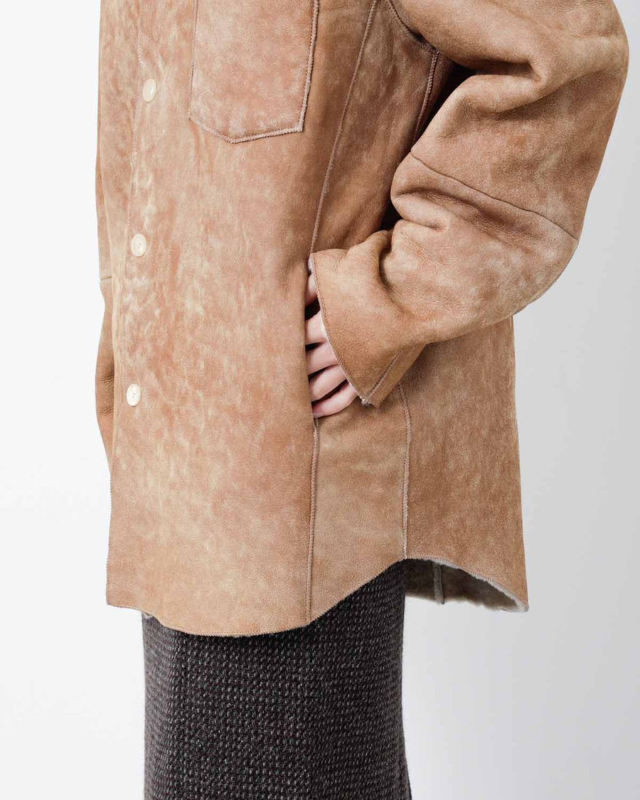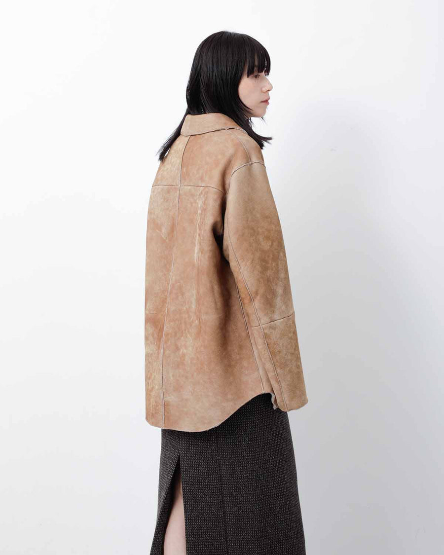 A shirt blouson made from Turkish sheepskin, finished with a semi-curly wool texture. The suede-treated leather side offers a balance of warmth, lightness, and smooth feel.