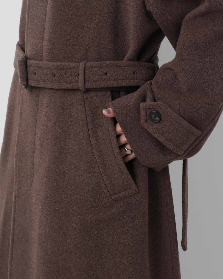 Stand-collar coat in ultra-fine Australian Merino wool, delivering smooth touch, soft volume, and lightweight warmth.