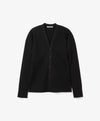 A 100% cotton knit cardigan in superfine mercerized yarn with a Japanese plant-based finish, knitted in an 18-gauge structure for a crisp, glossy, and sculpted texture.