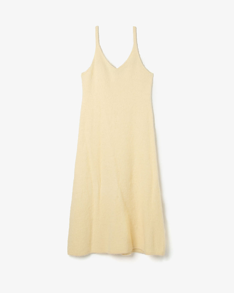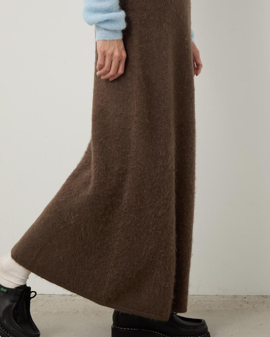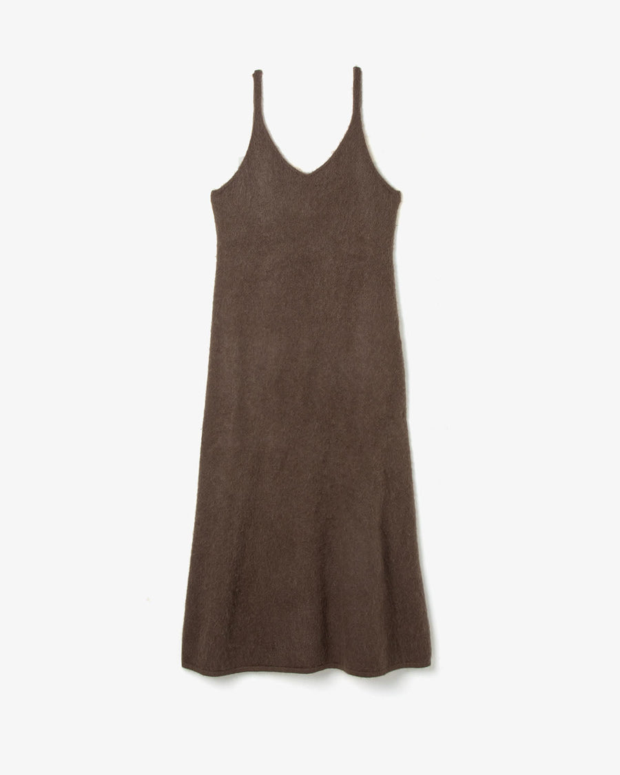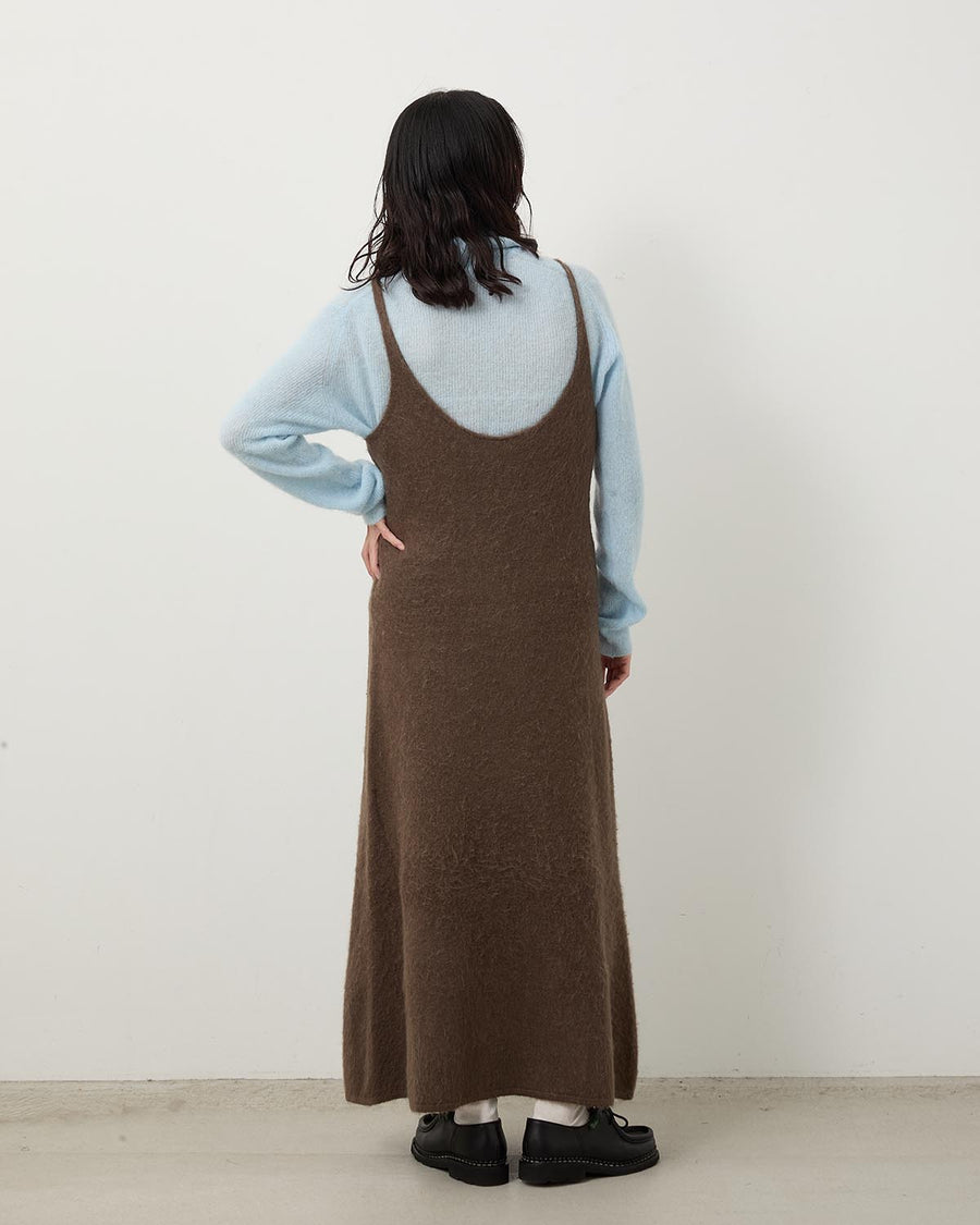 A knit dress made from carefully selected **baby alpaca** fibers, hand-spun into finer threads and dyed with a fur finish for a soft, smooth texture.