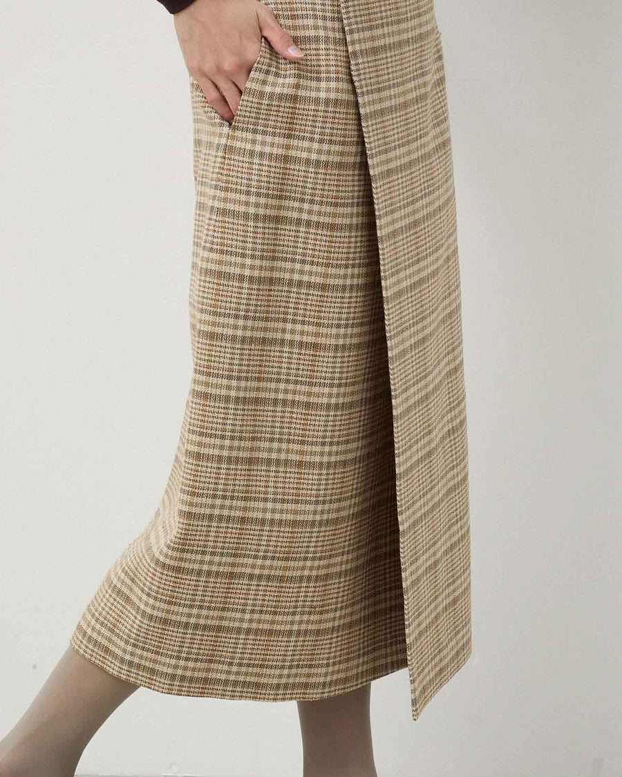 A wrap skirt in summer tweed, woven from three-tone silk noil and linen yarns in a check pattern.