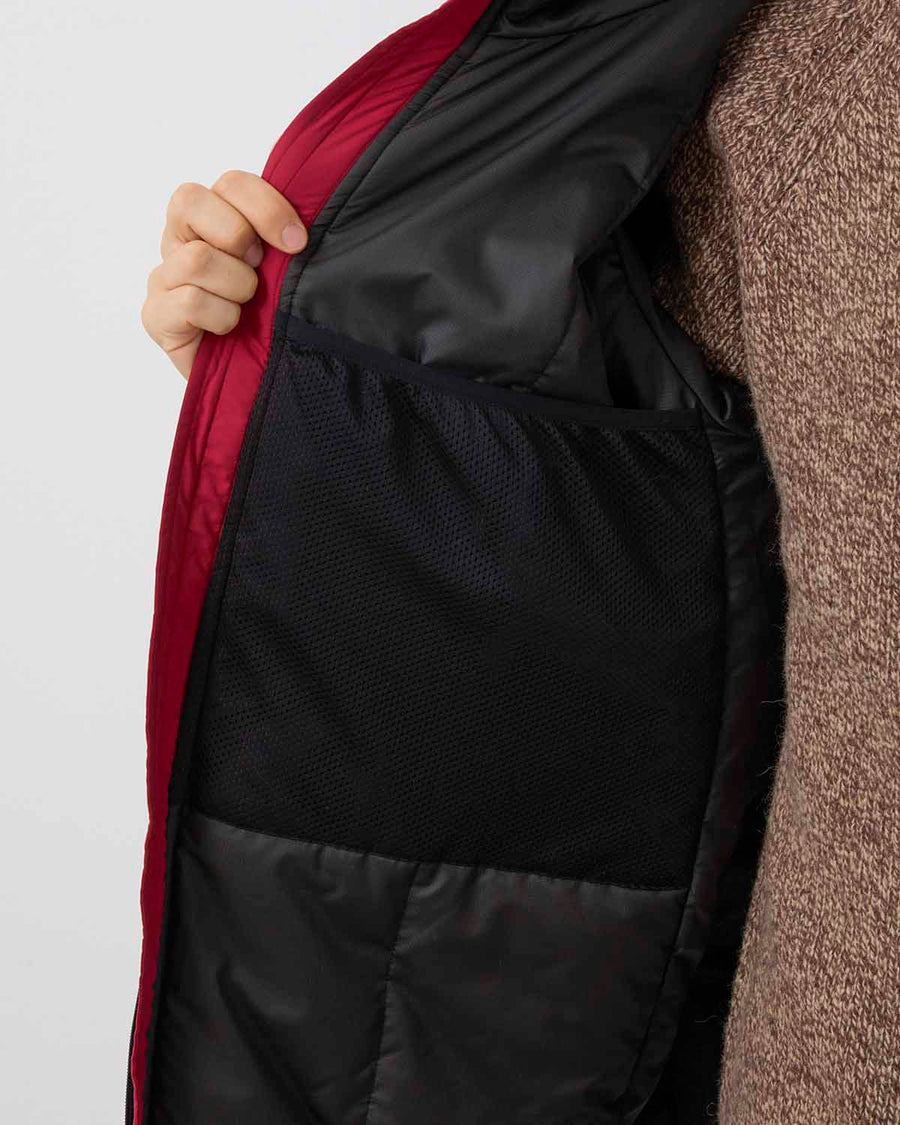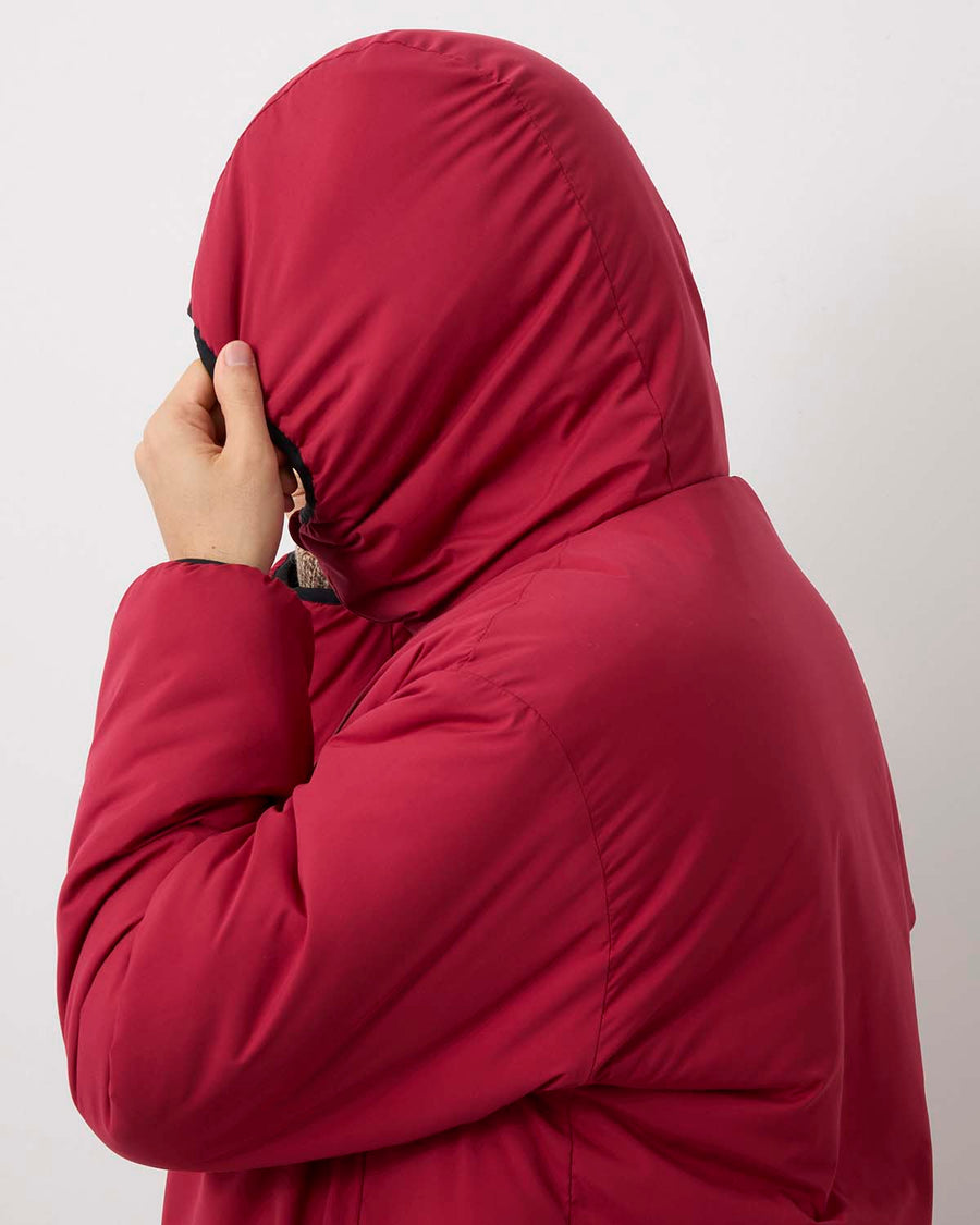 This zip-up parka jacket features a soft peach-skin shell and a voluminous padded silhouette, offering warmth, lightweight comfort, and all-day wearability.