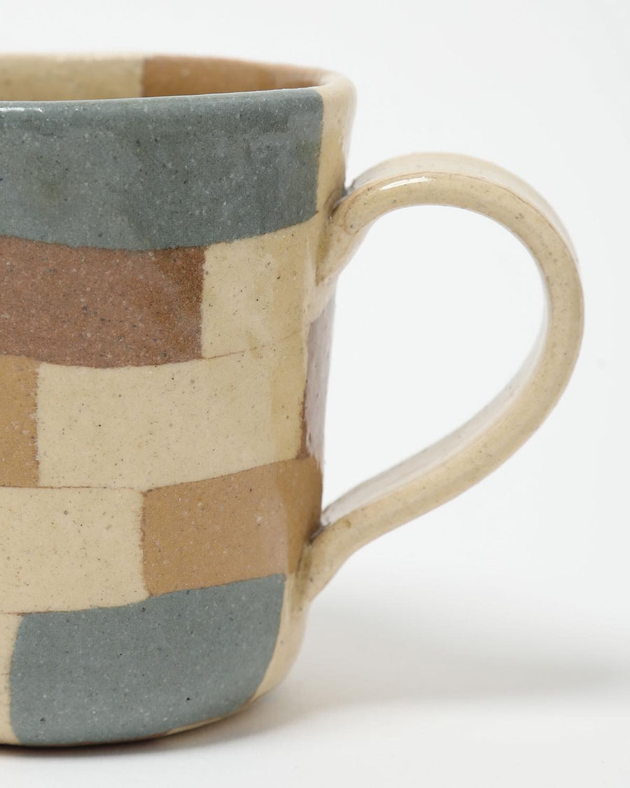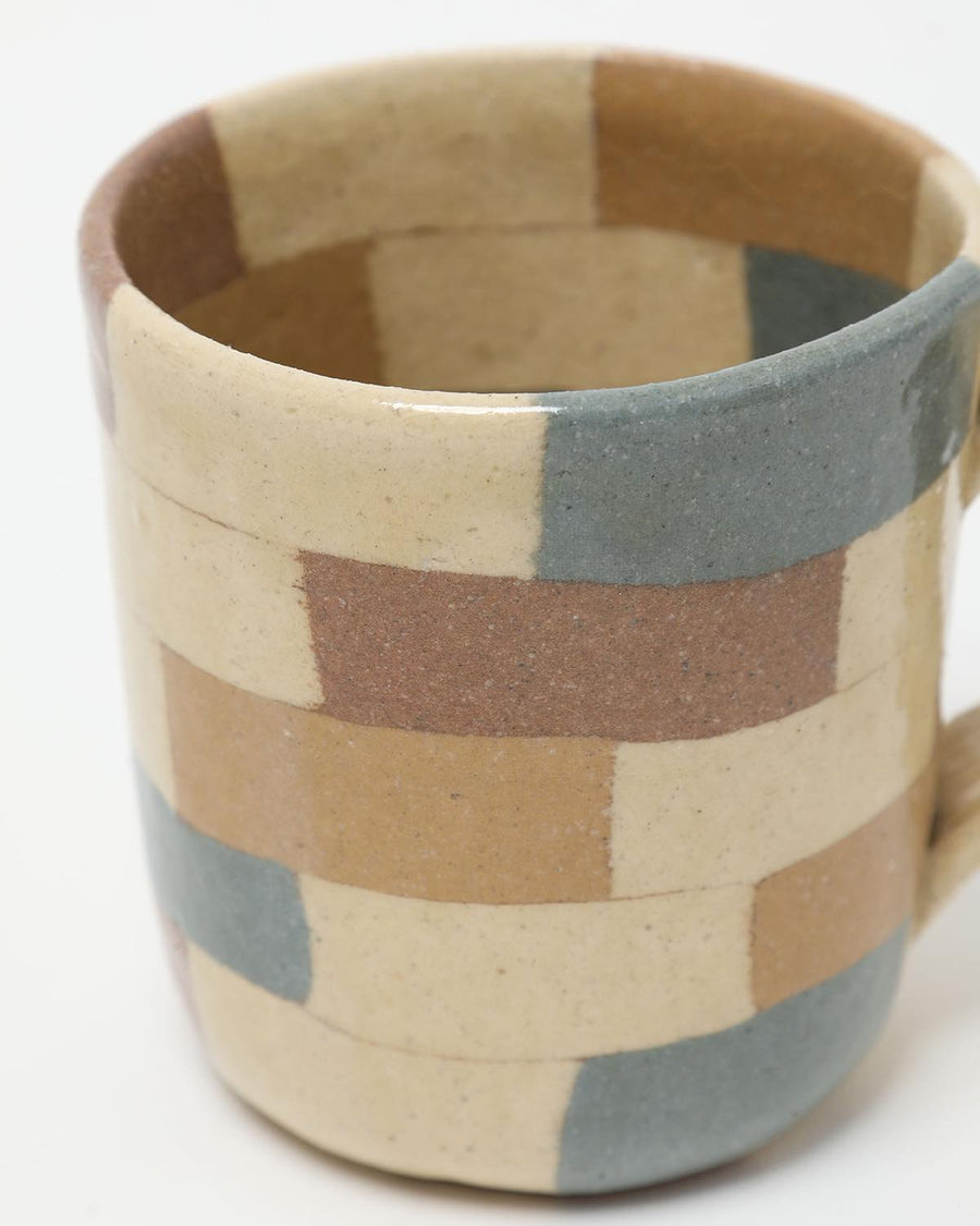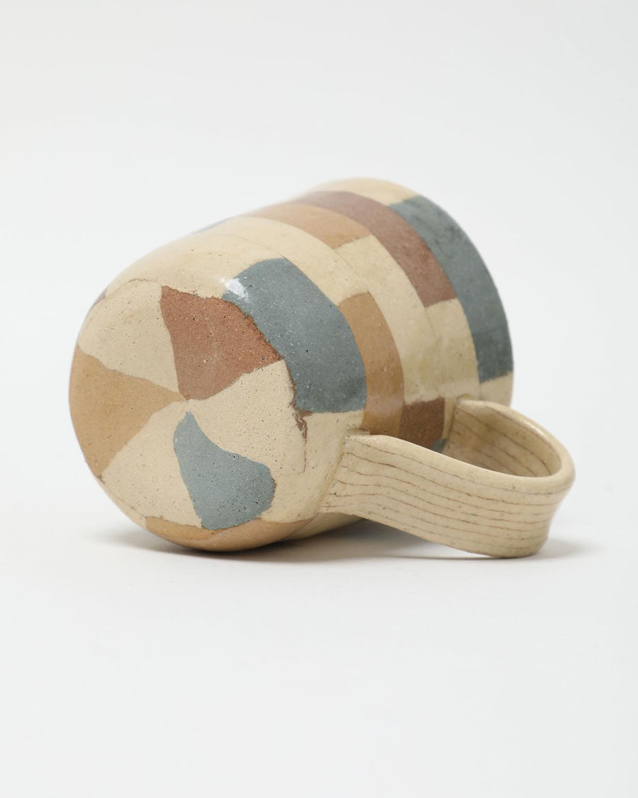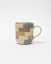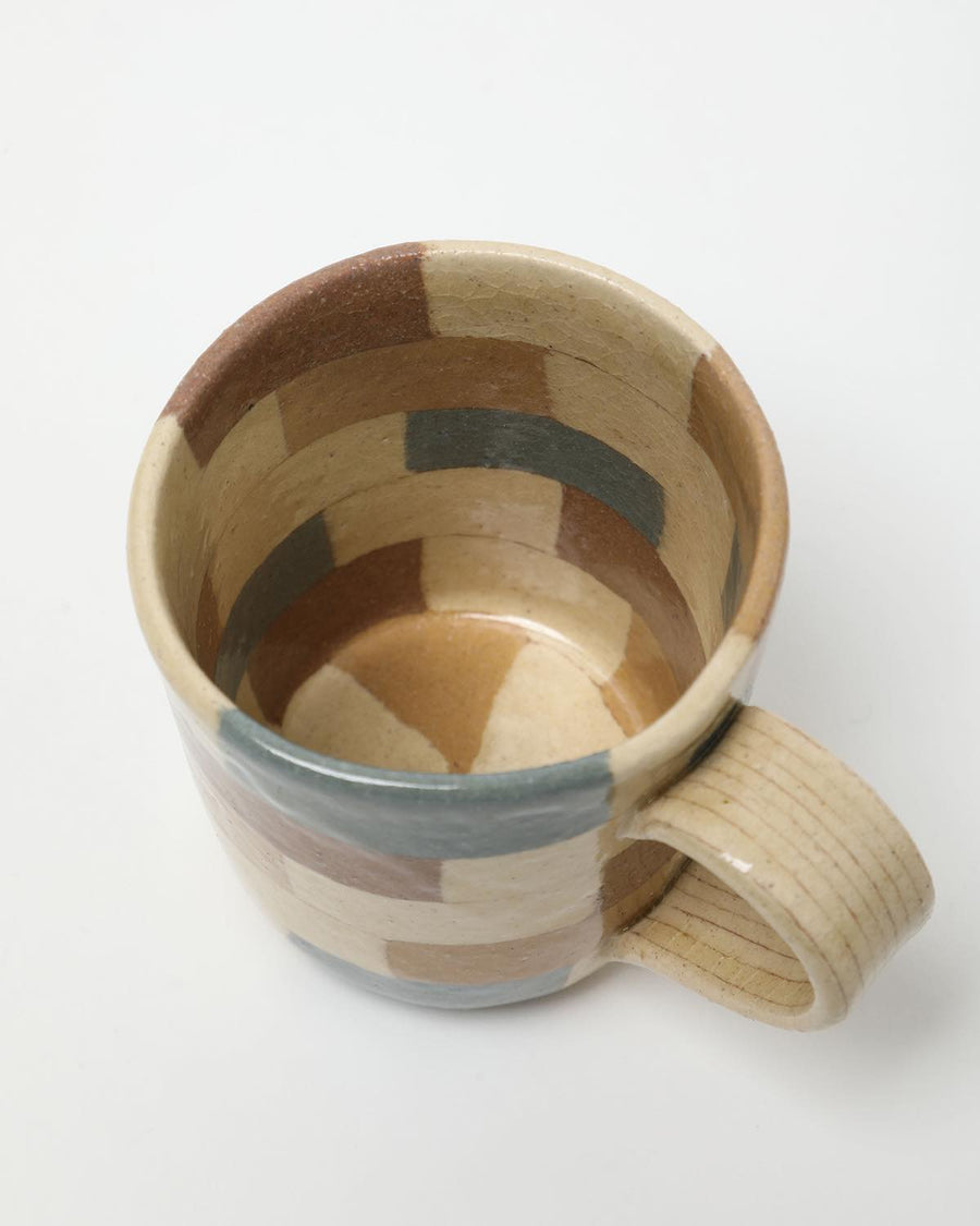 A handmade mug by Mashiko artist Hanako Sakashita, crafted with the *neriage* technique to showcase delicate geometric patterns and soft, harmonious colors.