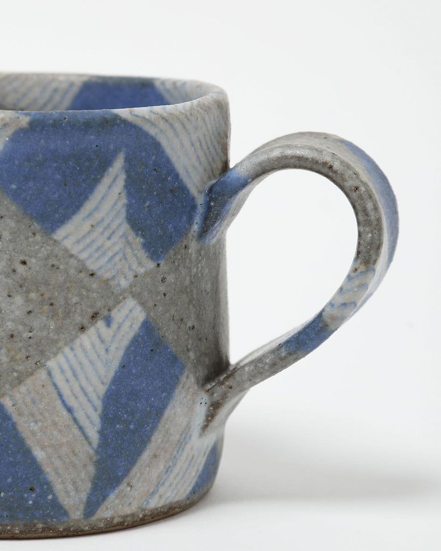 A handmade mug by Mashiko artist Hanako Sakashita, crafted with the neriage technique to showcase delicate geometric patterns and soft, harmonious colors.