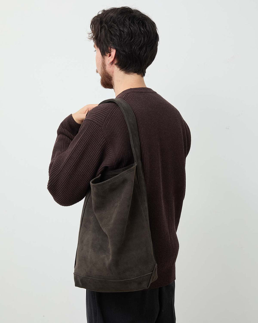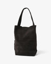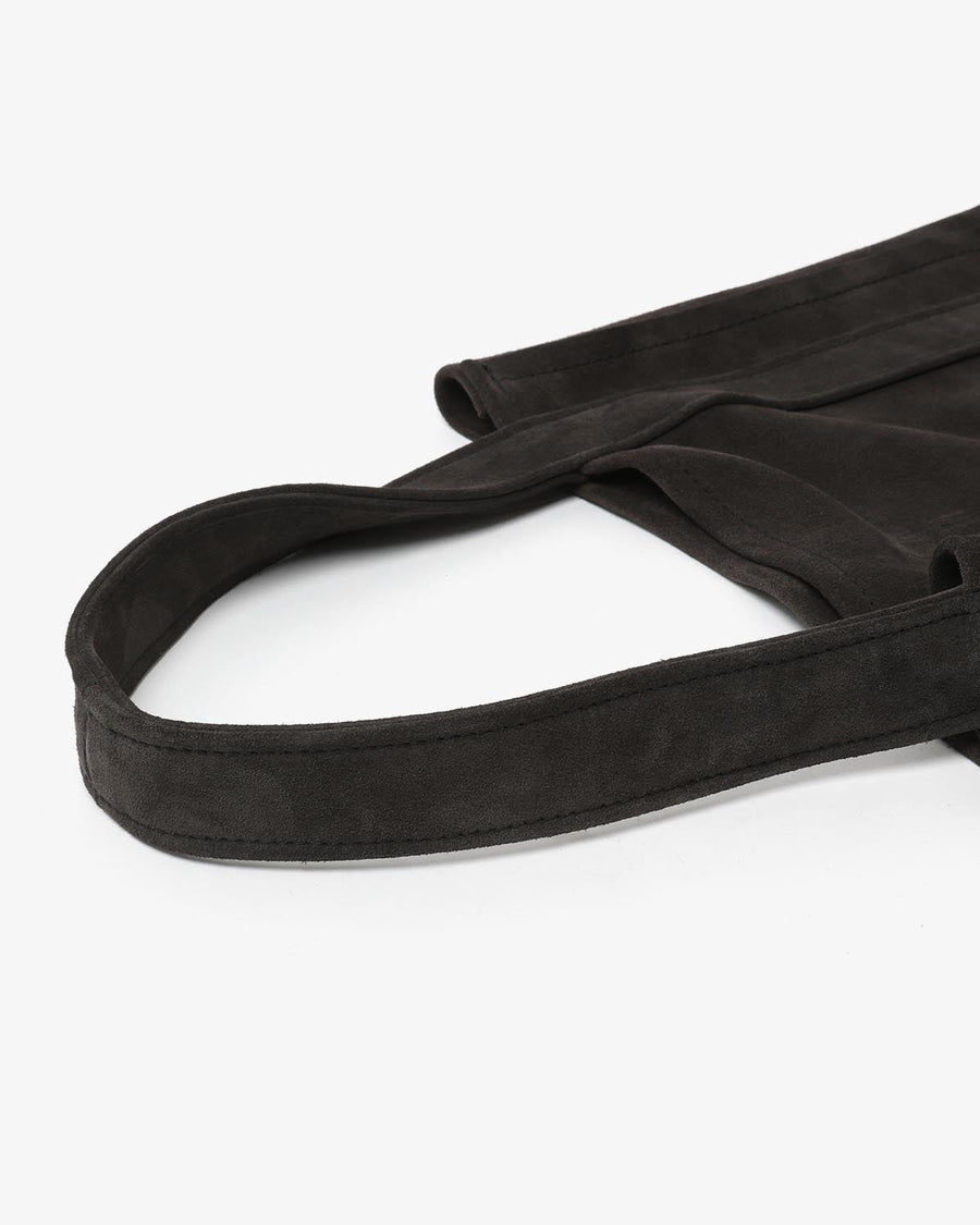 A suede tote bag made from premium bat leather, featuring a refined texture and rich color, perfectly sized for daily use or carrying a baguette.