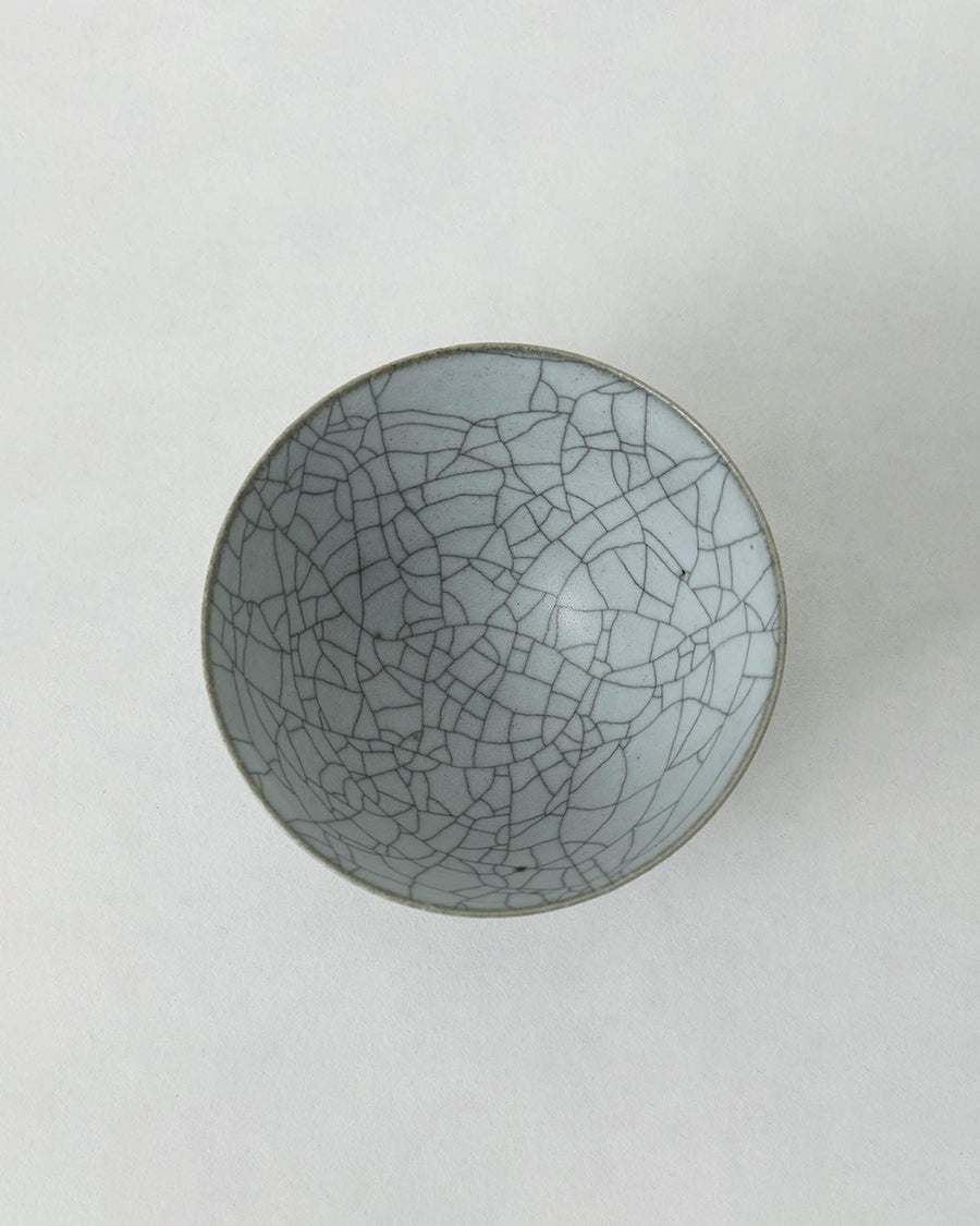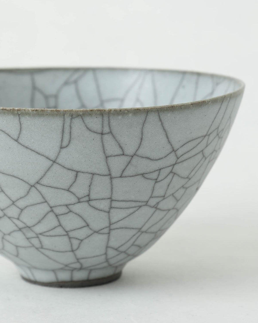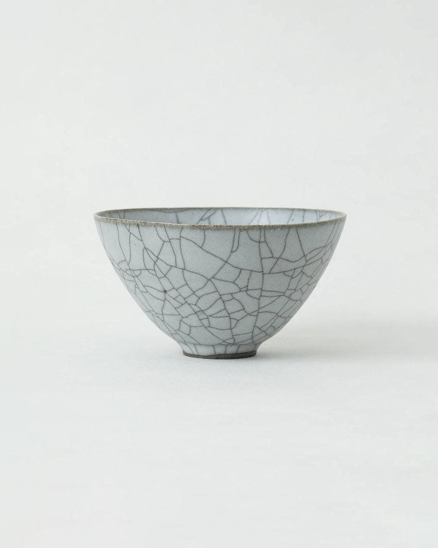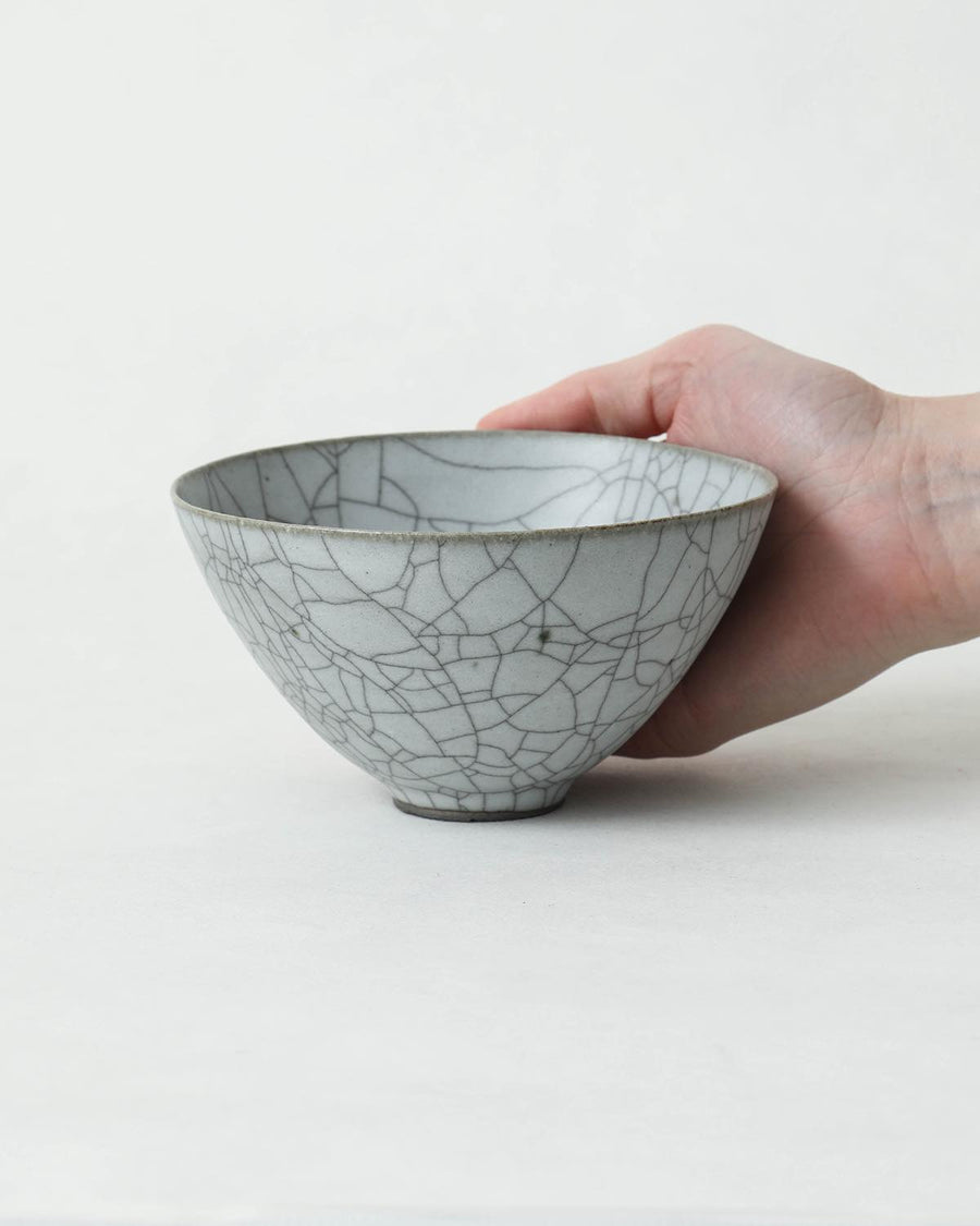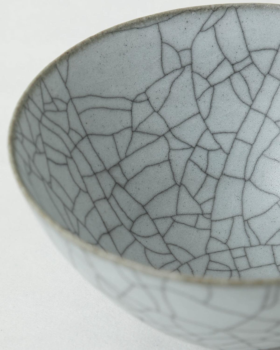 This simple rice bowl features a cracked pattern made using a traditional Japanese technique, kannyu, where a unique geometrical pattern forms during the cooling process due to the difference in shrinkage between the glaze and the base layer.