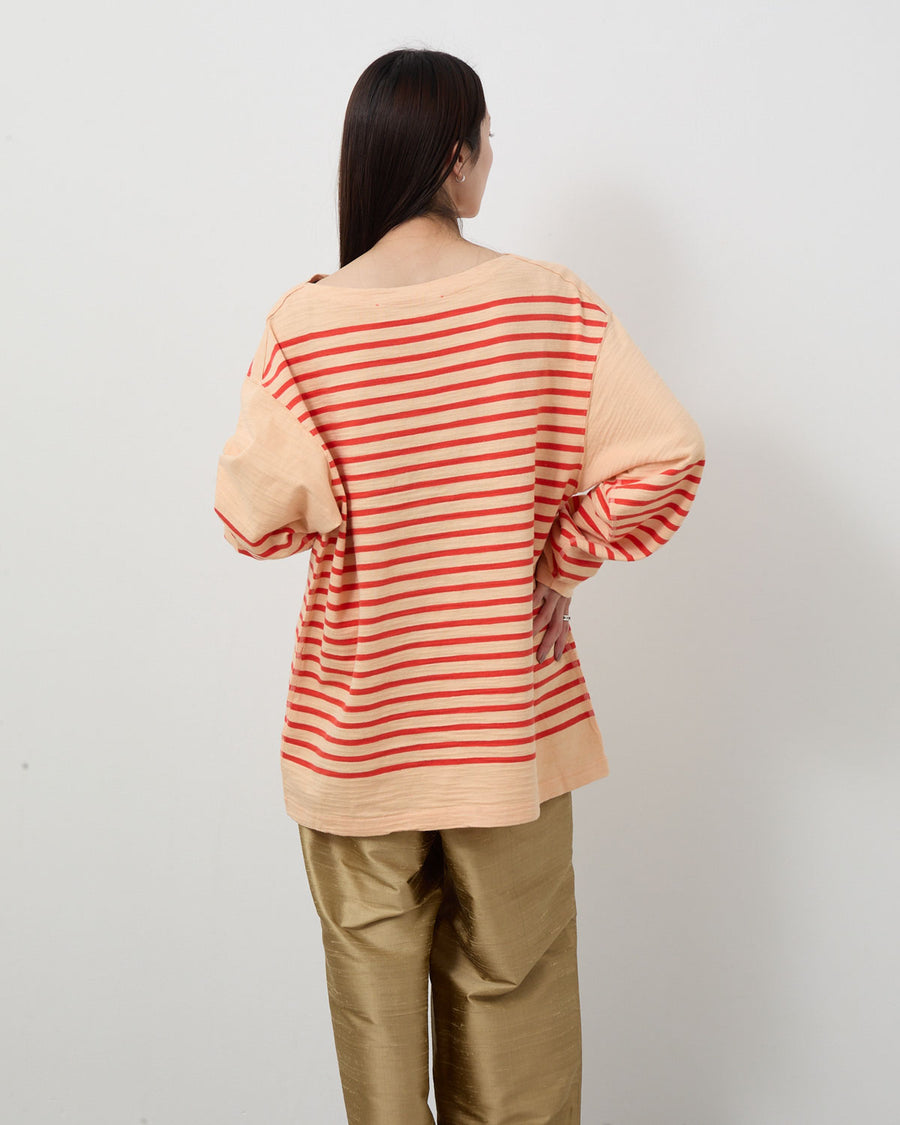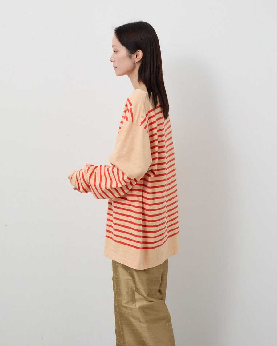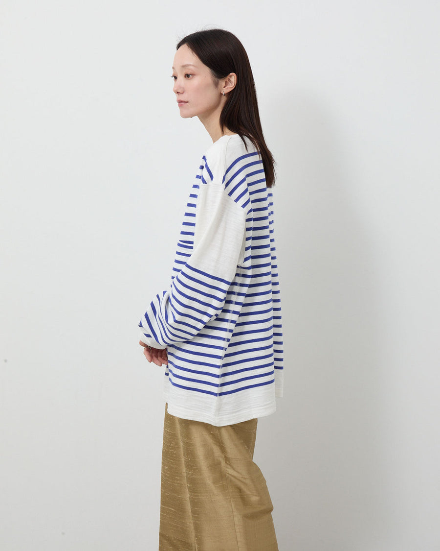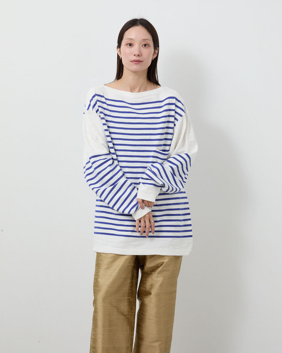 An original panel-border cutsew made with a exclusive fabric, combining slub and straight yarns for rich texture and a relaxed feel.