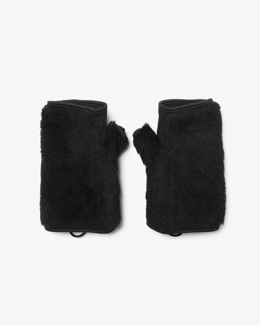Voluminous fingerless gloves in wool boa and faux suede, with leather-patched palms for a bear-paw-inspired look.