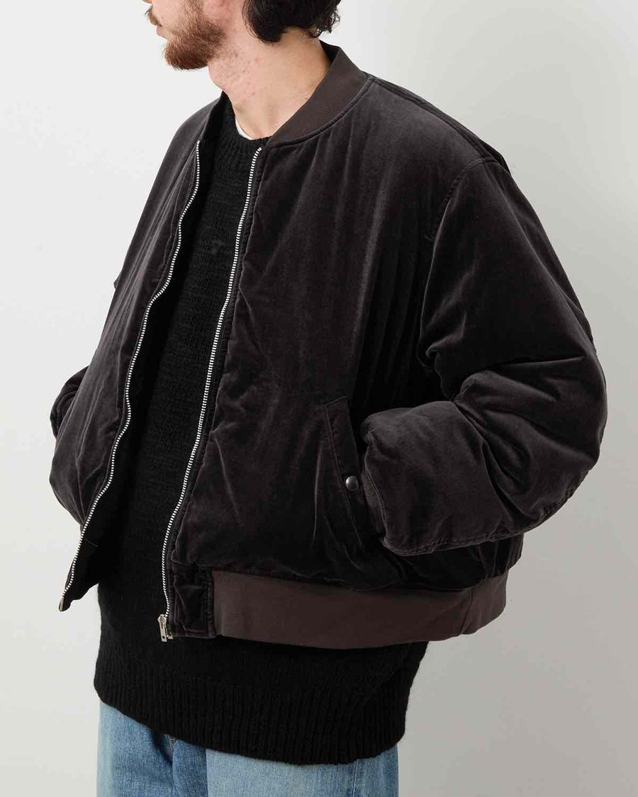 The UNLIKELY REVERSIBLE MA-1 merges vintage military and Yokosuka jacket styles, fully reversible with velour A-side and nylon B-side with pockets.