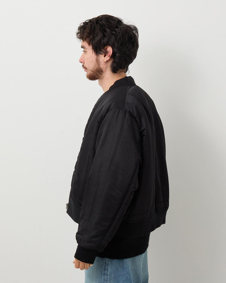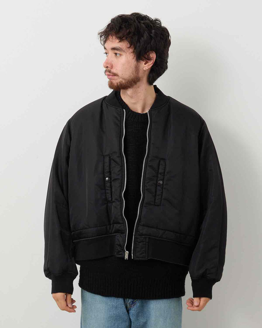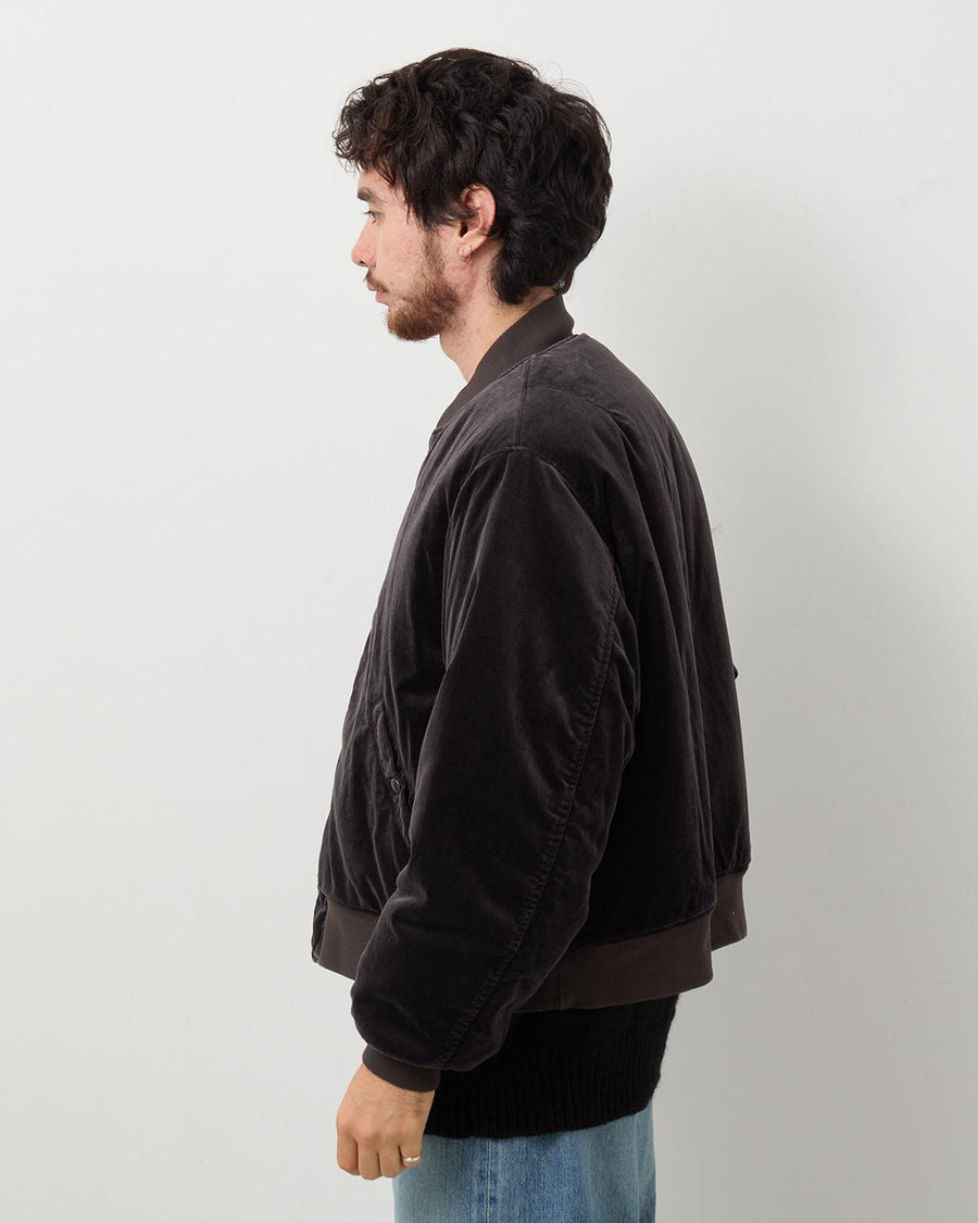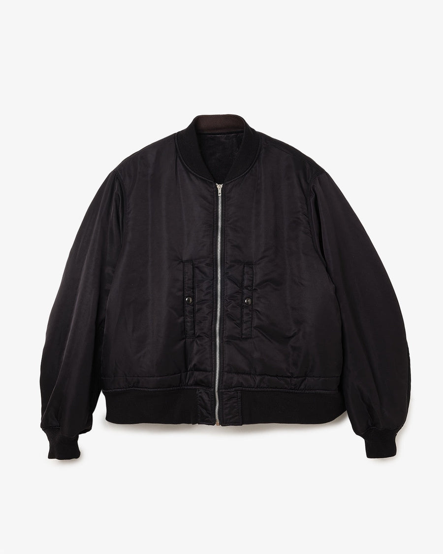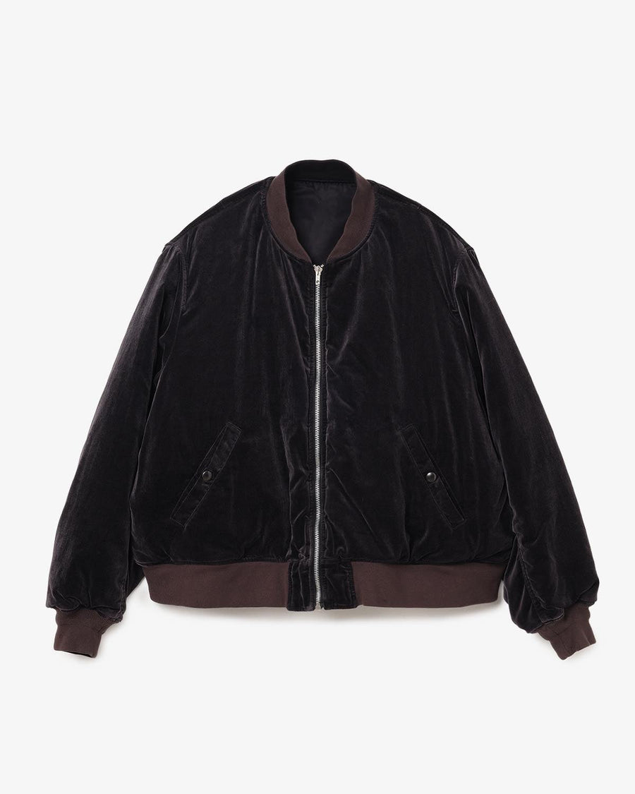 The UNLIKELY REVERSIBLE MA-1 merges vintage military and Yokosuka jacket styles, fully reversible with velour A-side and nylon B-side with pockets.