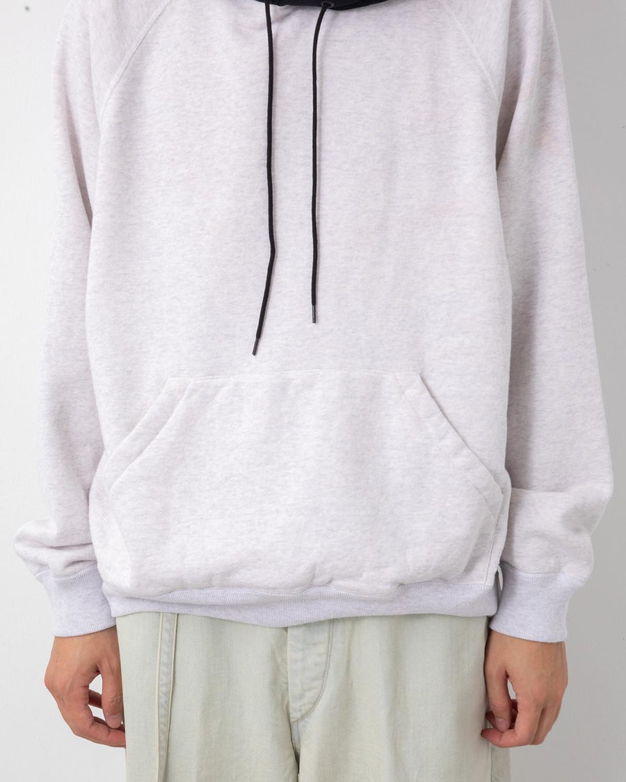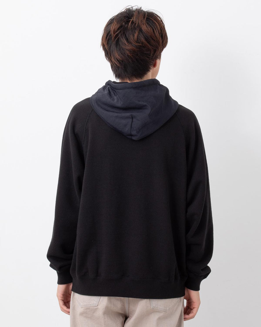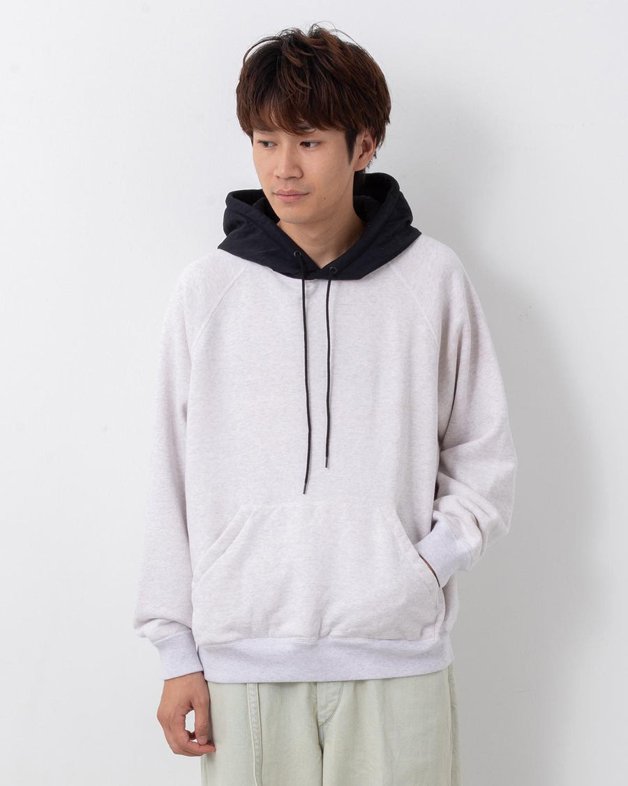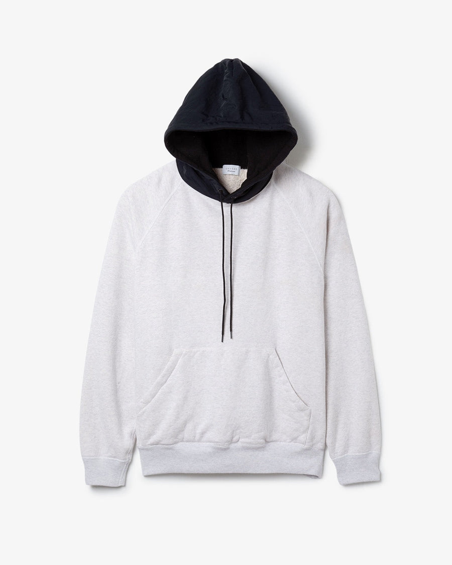 Sweat hoodie in rare loopback fabric that softens with wear, accented with recycled wrinkled nylon twill.