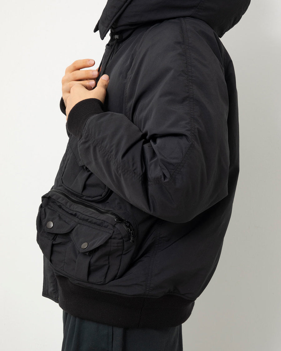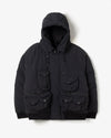 Matte nylon taffeta down jacket with soft cotton-like touch, durable water repellent finish, high-density taffeta lining, and functional hood and pockets.