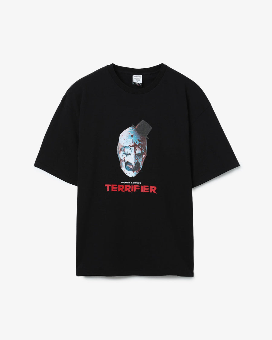 A collaboration between WACKO MARIA and the slasher film TERRIFIER, featuring artwork inspired by the iconic "Art the Clown" on the front.